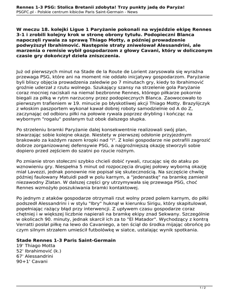 Rennes 1-3 PSG: Stolica Bretanii zdobyta! Trzy punkty jadą do Paryża! PSGFC.pl - Polskie centrum kibiców Paris Saint-Germain - News W meczu 18. kolejki Ligue 1 Paryżanie pokonali na wyjeździe ekipę Rennes 3-1 i zrobili kolejny krok w stronę obrony tytułu. Podopieczni Blanca napoczęli rywala za sprawą Thiago Motty, a później prowadzenie podwyższył Ibrahimović. Następnie straty zniwelował Alessandrini, ale marzenia o remisie wybił gospodarzom z głowy Cavani, który w doliczonym czasie gry dokończył dzieła zniszczenia. Już od pierwszych minut na Stade de la Route de Lorient zarysowała się wyraźna przewaga PSG, które ani na moment nie oddało inicjatywy gospodarzom. Paryżanie byli bliscy objęcia prowadzenia zaledwie po 7 minutach gry, kiedy to Ibrahimović groźnie uderzał z rzutu wolnego. Szukający szansy na strzelenie gola Paryżanie coraz mocniej naciskali na niemal bezbronne Rennes, którego piłkarze pokornie biegali za piłką w rytm narzucony przez podopiecznych Blanca. Zaowocowało to pierwszym trafieniem w 19. minucie po błyskotliwej akcji Thiago Motty. Brazylijczyk z włoskim paszportem wykonał kawał dobrej roboty samodzielnie od A do Z, zaczynając od odbioru piłki na połowie rywala poprzez drybling i kończąc na wybornym "rogalu" posłanym tuż obok dalszego słupka. Po strzeleniu bramki Paryżanie dalej konsekwentnie realizowali swój plan, stwarzając sobie kolejne okazje. Niestety w pierwszej odsłonie przyjezdnym brakowało za każdym razem kropki nad "i". Z kolei gospodarze nie potrafili zagrozić dobrze zorganizowanej defensywie PSG, a najgroźniejszą okazję stworzyli sobie dopiero przed zejściem do szatni po rzucie rożnym. Po zmianie stron stołeczni szybko chcieli dobić rywali, rzucając się do ataku po wznowieniu gry. Niespełna 5 minut od rozpoczęcia drugiej połowy wyborną okazję miał Lavezzi, jednak ponownie nie popisał się skutecznością. Na szczęście chwilę później faulowany Matuidi padł w polu karnym, a "jedenastkę" na bramkę zamienił niezawodny Zlatan. W dalszej części gry utrzymywała się przewaga PSG, choć Rennes wzmożyło poszukiwania bramki kontaktowej. Po jednym z ataków gospodarze otrzymali rzut wolny przed polem karnym, do piłki podszedł Alessandrini i w stylu "Ibry" huknął w kierunku Sirigu, który skapitulował, popełniając rażący błąd przy interwencji. Z upływem czasu gospodarze coraz chętniej i w większej liczbnie napierali na bramkę ekipy znad Sekwany. Szczególnie w okolicach 90. minuty, jednak skarcił ich za to "El Matador". Wychodzący z kontrą Verratti posłał piłkę na lewo do Cavaniego, a ten ściął do środka mijając obrońcę po czym silnym strzałem umieścił futbolówkę w siatce, ustalając wynik spotkania. Stade Rennes 1-3 Paris Saint-Germain 19' Thiago Motta 52' Ibrahimović (k.) 67' Alessandrini 90+1' Cavani 1/2 Rennes 1-3 PSG: Stolica Bretanii zdobyta! Trzy punkty jadą do Paryża! PSGFC.pl - Polskie centrum kibiców Paris Saint-Germain - News PSG: Sirigu - Van der Wiel, Thiago Silva (c.), Alex, Digne - Thiago Motta, Matuidi, Verratti - Cavani, Ibrahimović, Lavezzi (74' Rabiot) Autor: Don Matteo 2/2 Powered by TCPDF (www.tcpdf.org)