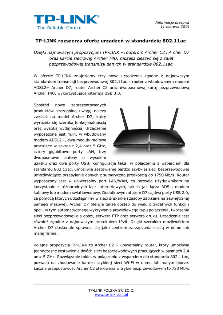 Informacja prasowa 11 czerwca 2014 TP-LINK rozszerza ofertę urządzeń w standardzie 802.11ac Dzięki najnowszym propozycjom TP-LINK – routerom Archer C2 i Archer D7 oraz karcie sieciowej Archer T4U, możesz cieszyć się z zalet bezprzewodowej transmisji danych w standardzie 802.11ac. W ofercie TP-LINK znajdziemy trzy nowe urządzenia zgodne z najnowszym standardem transmisji bezprzewodowej 802.11ac – router z wbudowanym modem ADSL2+ Archer D7, router Archer C2 oraz dwupasmową kartę bezprzewodową Archer T4U, wykorzystującą interfejs USB 3.0. Spośród nowo zaprezentowanych produktów szczególną uwagę należy zwrócić na model Archer D7, który wyróżnia się szeroką funkcjonalnością oraz wysoką wydajnością. Urządzenie wyposażone jest m.in. w wbudowany modem ADSL2+, dwa moduły radiowe pracujące w zakresie 2,4 oraz 5 GHz, cztery gigabitowe porty LAN, trzy dwupasmowe anteny o wysokim uzysku oraz dwa porty USB. Konfiguracja taka, w połączeniu z wsparciem dla standardu 802.11ac, umożliwia zestawienie bardzo szybkiej sieci bezprzewodowej umożliwiającej przesyłanie danych z sumaryczną prędkością do 1750 Mb/s. Router wyposażony jest w uniwersalny port LAN/WAN, co pozwala użytkownikom na korzystanie z różnorodnych łącz internetowych, takich jak łącza ADSL, modem kablowy lub modem światłowodowy. Dodatkowym atutem D7 są dwa porty USB 2.0, za pomocą których udostępnimy w sieci drukarkę i zasoby zapisane na zewnętrznej pamięci masowej. Archer D7 oferuje także dostęp do wielu przydatnych funkcji i opcji, w tym automatycznego wykrywania prawidłowego typu połączenia, tworzenia sieci bezprzewodowej dla gości, serwera FTP oraz serwera druku. Urządzenie jest również zgodne z najnowszym protokołem IPv6. Dzięki szerokim możliwościom Archer D7 doskonale sprawdzi się jako centrum zarządzania siecią w domu lub małej firmie. Kolejna propozycja TP-LINK to Archer C2 – uniwersalny router, który umożliwia jednoczesne zestawienie dwóch sieci bezprzewodowych pracujących w pasmach 2,4 oraz 5 GHz. Rozwiązanie takie, w połączeniu z wsparciem dla standardu 802.11ac, pozwala na zbudowanie bardzo szybkiej sieci Wi-Fi w domu lub małym biurze. Łączna przepustowość Archer C2 oferowana w trybie bezprzewodowym to 733 Mb/s. TP-LINK POLSKA SP. ZO.O. www.tp-link.com.pl Informacja prasowa 11 czerwca 2014 Ponadto router TP-LINK wyposażony jest również w portów Ethernet pięć gigabitowych (cztery LAN oraz jeden WAN), co gwarantuje niezwykle wydajne połączenia w ramach sieci przewodowej. Dodatkowym plusem Archer C2 jest port USB, umożliwiający podłączenie i udostępnienie w sieci lokalnej drukarki lub plików zapisanych na zewnętrznej pamięci masowej. W przypadku sieci biurowych bardzo przydatna okaże się funkcja Guest Network. Pozwala ona na proste i szybkie utworzenie wyodrębnionej sieci bezprzewodowej dla gości, bez udzielania im dostępu do zasobów lokalnych. Ostatnią z nowości TP-LINK, debiutujących na polskim rynku, jest bezprzewodowa karta sieciowa Archer T4U z interfejsem USB 3.0. Model ten, podobnie jak routery D7 i C2, oferuje zgodność ze standardem 802.11ac oraz umożliwia przesyłanie danych w dwóch pasmach – 2,4 oraz 5 GHz. Ponadto w zestawie, oprócz samej karty znajdziemy także przedłużacz USB 3.0 o długości 1 metra. Pozwala to na umieszczenie karty w pewnej odległości od komputera w celu ewentualnej poprawy jakości połączenia bezprzewodowego. Nowości TP-LINK to interesująca propozycja zarówno dla użytkowników domowych jak i małych firm, pozwalająca na zbudowanie szybkiej i bezpiecznej sieci bezprzewodowej pracującej w standardzie 802.11ac. Routery Archer D7 i Archer C2 oraz karta sieciowa Archer T4U dostępne są w sprzedaży w sugerowanych cenach brutto wynoszących odpowiednio 599 zł, 269 zł oraz 199 zł. Objęte są 24-miesięcznym okresem gwarancyjnym. TP-LINK POLSKA SP. ZO.O. www.tp-link.com.pl Informacja prasowa 11 czerwca 2014 Specyfikacja techniczna: Archer D7 1 Port 10/100/1000Mb/s RJ45 WAN/LAN Porty 3 Porty 10/100/1000Mbps RJ45 LAN 1 Port RJ11 2 Porty USB 2.0 Wyłącznik Przyciski Wyłącznik sieci bezprzewodowej Przycisk WPS Przycisk RESET Zasilanie 12VDC / 2,5A Wymiary (SxGxW) 229 x 160 x 37mm Typ anteny Standardy bezprzewodowe Częstotliwość pracy Prędkość transmisji Trzy odłączalne dwupasmowe anteny zewnętrzne (3 × 2dBi dla 2.4GHz oraz 3 × 3dBi dla 5GHz) IEEE 802.11ac/n/a 5GHz IEEE 802.11b/g/n 2.4GHz 2.4GHz oraz 5GHz 5GHz: do 1300Mb/s 2.4GHz: do 450Mb/s EIRP <20dBm(EIRP) Funkcje transmisji Włączanie/wyłączanie transmisji bezprzewodowej, most WDS, WMM, bezprzewodowej statystyki transmisji bezprzewodowej Bezpieczeństwo transmisji bezprzewodowej 64/128bitowe szyfrowanie WEP / WPA / WPA2,WPA-PSK / WPA2-PSK Dostępne tryby działania Router ADSL, Router bezprzewodowy Protokoły Obsługa IPv4 oraz IPv6 Udostępnianie urządzeń USB Serwer Samba (udostępnianie dysków)/serwer FTP/ serwer druku Funkcja Guest Network 1 sieć 2.4GHz / 1 sieć 5GHz Certyfikaty CE, FCC, RoHS Archer D7 Splitter ADSL Zawartość opakowania Kabel telefoniczny RJ-11 / kabel Ethernet RJ-45 Instrukcja szybkiej instalacji Płyta CD TP-LINK POLSKA SP. ZO.O. www.tp-link.com.pl Informacja prasowa 11 czerwca 2014 Archer C2 4 porty LAN 10/100/1000Mb/s Porty 1 port WAN 10/100/1000Mb/s 1 port USB 2.0 Przycisk WPS Przyciski Przełącznik Wireless On/Off Przycisk Reset Zasilanie 12VDC / 1.5A Wymiary (SxGxW) 230 x 144 x 35mm Typ anteny Dwie dwupasmowe odłączalne anteny (RP-SMA) Standardy bezprzewodowe Częstotliwość pracy Prędkość transmisji IEEE 802.11ac/n/a 5GHz IEEE 802.11b/g/n 2.4GHz 2.4GHz oraz 5GHz 5GHz: do 433Mb/s 2.4GHz: do 300Mb/s EIRP <20dBm(EIRP) Funkcje transmisji Włączanie/wyłączanie transmisji bezprzewodowej, most WDS, WMM, bezprzewodowej statystyki transmisji bezprzewodowej Bezpieczeństwo transmisji bezprzewodowej Typ połączenia WAN Protokoły Udostępnianie urządzeń USB 64/128