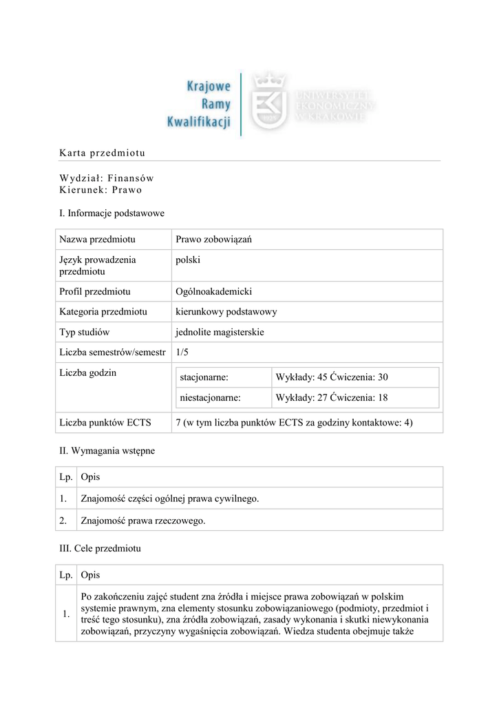 Kart a prz edm i ot u W ydz i ał : Fi nansów Ki erunek: P rawo I. Informacje podstawowe Nazwa przedmiotu Prawo zobowiązań Język prowadzenia przedmiotu polski Profil przedmiotu Ogólnoakademicki Kategoria przedmiotu kierunkowy podstawowy Typ studiów jednolite magisterskie Liczba semestrów/semestr 1/5 Liczba godzin Liczba punktów ECTS stacjonarne: Wykłady: 45 Ćwiczenia: 30 niestacjonarne: Wykłady: 27 Ćwiczenia: 18 7 (w tym liczba punktów ECTS za godziny kontaktowe: 4) II. Wymagania wstępne Lp. Opis 1. Znajomość części ogólnej prawa cywilnego. 2. Znajomość prawa rzeczowego. III. Cele przedmiotu Lp. Opis 1. Po zakończeniu zajęć student zna źródła i miejsce prawa zobowiązań w polskim systemie prawnym, zna elementy stosunku zobowiązaniowego (podmioty, przedmiot i treść tego stosunku), zna źródła zobowiązań, zasady wykonania i skutki niewykonania zobowiązań, przyczyny wygaśnięcia zobowiązań. Wiedza studenta obejmuje także poszczególne rodzaje stosunków zobowiązaniowych składające się na tzw. część szczegółową prawa zobowiązań. 2. Po zakończeniu zajęć student potrafi stosować nabytą wiedzę do rozwiązywania problemów praktycznych (tzw. kazusów). Student potrafi analizować stany faktyczne, a także wskazywać przepisy prawa mające zastosowanie w danym przypadku – ma przy tym świadomość współzależności zachodzących pomiędzy różnymi działami prawa cywilnego. 3. Po zakończeniu zajęć student ma świadomość funkcji, jakie pełni prawo zobowiązań w obrębie gałęzi prawa cywilnego. Ma świadomość odpowiedzialności za efekty swoich działań podejmowanych przy stosowaniu przepisów prawa zobowiązań. IV. Realizowane efekty kształcenia Kod Kat. Opis KEK E1 Wiedza Przedmiot pozwala na uzyskanie wiedzy o prawie K_W03 zobowiązań, stanowiącym jeden z działów prawa K_W05 cywilnego. W jego ramach student uzyskuje wiedzę o źródłach i miejscu prawa zobowiązań w polskim systemie prawnym, o elementach stosunku zobowiązaniowego (podmiotach, przedmiocie i treści tego stosunku), o źródłach (przyczynach powstawania) zobowiązań, zasadach wykonania i skutkach niewykonania zobowiązań, przyczynach wygaśnięcia zobowiązań. Treści kształcenia obejmują także wiedzę o poszczególnych rodzajach stosunków zobowiązaniowych składających się na tzw. część szczegółową prawa zobowiązań. E2 Umiejętności Przedmiot pozwala na nabycie umiejętności stosowania przepisów tworzących prawo zobowiązań do rozwiązywania konkretnych problemów prawnych. Stosując prawo zobowiązań student potrafi ustalić właściwe przepisy prawne relewantne dla rozważanego stanu faktycznego, a następnie w oparciu o rezultat ich wykładni określić konsekwencje prawne tego stanu faktycznego. Stosując przepisy prawa zobowiązań student ma przy tym świadomość współzależności zachodzących pomiędzy różnymi działami prawa cywilnego (w szczególności pomiędzy prawem zobowiązań a częścią ogólną prawa cywilnego). K_U02 K_U03 K_U04 K_U05 E3 Kompetencje społeczne Student rozumie znaczenie prawa zobowiązań w procesie uczenia się innych przedmiotów prawniczych (w szczególności prawa handlowego oraz innych przedmiotów z zakresu prawa prywatnego). Student jest świadomy roli jaką odgrywa prawo zobowiązań w K_K06 K_K08 wykonywaniu zawodu prawnika. V. Treści Kształcenia W ykł ad y Lp. Opis D (45) Z (27) W1 Wykład wprowadzający do prawa zobowiązań (źródła prawa zobowiązań i jego miejsce w polskim systemie prawnym, struktura prawa zobowiązań - część ogólna i część szczegółowa, zasada jedności prawa cywilnego a zróżnicowanie podmiotowe w zobowiązaniach. 3 2 W2 Pojęcie zobowiązania i jego elementy (pojęcie zobowiązania cywilnoprawnego i jego strony, wierzytelność, dług i odpowiedzialność, treść i rodzaje świadczenia). 3 2 W3 Przyczyny powstania zobowiązań. Umowy zobowiązaniowe (ogólna charakterystyka przyczyn powstania zobowiązania, rodzaje umów zobowiązaniowych, zasada swobody umów, pierwotna niemożliwość świadczenia, wyzysk). 3 2 W4 Problematyka zawierania umów zobowiązaniowych (culpa in contrahendo, umowa przedwstępna, wzorce umowne, umowy konsumenckie kwalifikowane ze względu na sposób zawarcia, umowy dotyczące osób trzecich). 4 3 W5 Czyny niedozwolone (pojęcie i systematyka czynów niedozwolonych w prawie zobowiązań, odpowiedzialność za własne czyny, odpowiedzialność za cudze czyny, odpowiedzialność organów władzy publicznej, odpowiedzialność za zwierzęta i rzeczy, odpowiedzialność dotycząca użycia tzw. sił przyrody, odpowiedzialność za produkt). 4 2 W6 Zasady dotyczące naprawienia szkód deliktowych (miarkowanie odszkodowania, współodpowiedzialność za szkodę deliktową, szkoda na osobie i jej naprawienie, krzywda i zadośćuczynienie za doznaną krzywdę, przedawnienie roszczeń z czynów niedozwolonych). 3 2 W7 Pozostałe przyczyny powstania zobowiązań (pojęcie i funkcja bezpodstawnego wzbogacenia, jego przesłanki, świadczenie nienależne, roszczenie o wydanie wzbogacenia, przepadek świadczenia, problematyka jednostronnych czynności prawnych, aktów administracyjnych oraz konstytutywnych orzeczeń sądowych jako przyczyn powstania zobowiązań). 4 2 W8 Wykonanie zobowiązań oraz skutki ich naruszenia (ogólne 4 2 zasady wykonania zobowiązania, pacta sunt servanda, clausula rebus sic stantibus, miejsce i termin spełnienia świadczenia, wykonanie zobowiązań z umów wzajemnych, ogólne zasady odpowiedzialności kontraktowej odszkodowawczej - wina, naruszenie zobowiązania, szkoda, związek przyczynowo skutkowy, ciężar dowodu, niemożliwość świadczenia, opóźnienie i zwłoka dłużnika, zwłoka wierzyciela, dodatkowe zastrzeżenia umowne). W9 Skutki niewykonania lub nienależytego wykonania (naruszenia) zobowiązań (podsumowanie uwag wstępnych dotyczących niewykonania zobowiązań w postaci wy