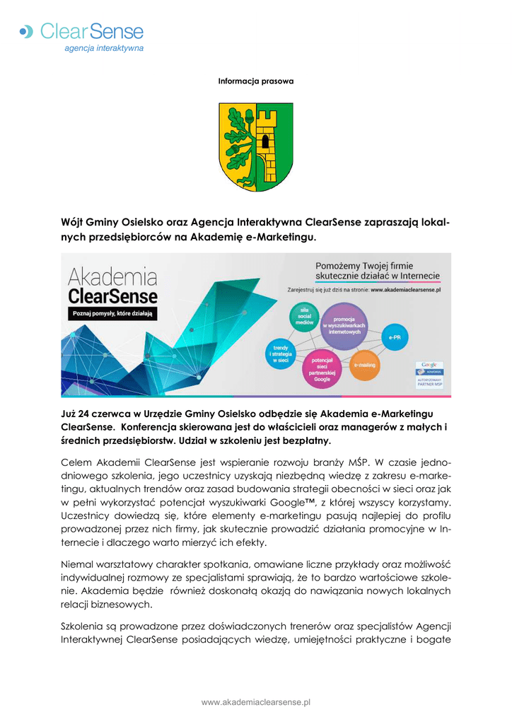 Informacja prasowa Wójt Gminy Osielsko oraz Agencja Interaktywna ClearSense zapraszają lokalnych przedsiębiorców na Akademię e-Marketingu. Już 24 czerwca w Urzędzie Gminy Osielsko odbędzie się Akademia e-Marketingu ClearSense. Konferencja skierowana jest do właścicieli oraz managerów z małych i średnich przedsiębiorstw. Udział w szkoleniu jest bezpłatny. Celem Akademii ClearSense jest wspieranie rozwoju branży MŚP. W czasie jednodniowego szkolenia, jego uczestnicy uzyskają niezbędną wiedzę z zakresu e-marketingu, aktualnych trendów oraz zasad budowania strategii obecności w sieci oraz jak w pełni wykorzystać potencjał wyszukiwarki Google™, z której wszyscy korzystamy. Uczestnicy dowiedzą się, które elementy e-marketingu pasują najlepiej do profilu prowadzonej przez nich firmy, jak skutecznie prowadzić działania promocyjne w Internecie i dlaczego warto mierzyć ich efekty. Niemal warsztatowy charakter spotkania, omawiane liczne przykłady oraz możliwość indywidualnej rozmowy ze specjalistami sprawiają, że to bardzo wartościowe szkolenie. Akademia będzie również doskonałą okazją do nawiązania nowych lokalnych relacji biznesowych. Szkolenia są prowadzone przez doświadczonych trenerów oraz specjalistów Agencji Interaktywnej ClearSense posiadających wiedzę, umiejętności praktyczne i bogate www.akademiaclearsense.pl doświadczenie w tematyce konferencji. Każdy uczestnik spotkania otrzyma materiały szkoleniowe oraz certyfikat Akademii ClearSense. Podstawowe informacje: Akademia e-Marketingu ClearSense, Termin: 24 czerwca 2015 Czas trwania: 10.00 – 14.00 Miejsce: Sala nr 8 w budynku Urzędu Gminy w Osielsku, ul. Szosa Gdańska 55A, 86031 Osielsko Zgłoszenia mailowe prosimy przesyłać na adres: [email protected] Więcej informacji o całym projekcie: www.akademiaclearsense.pl Honorowym Patronem Akademii e-Marketingu jest Związek Pracodawców Branży Internetowej IAB Polska www.iab.org.pl Agencja interaktywna ClearSense swoje działania kieruje do sektora małych i średnich przedsiębiorstw, oferując efektywne rozwiązania z zakresu marketingu internetowego. W portfolio agencji znajduje się: projektowanie stron www, SEO, AdWords, Display, e-Mailing, Social Media, Content Marketing. Jako Autoryzowany Partner MSP Google AdWordsTM, prezentuje na organizowanych wewnętrznie Akademiach najbardziej efektywne metody promocji w wyszukiwarce Google. Google i Google AdWords są zastrzeżonymi znakami towarowymi Google Inc Kontakt dla mediów Kasia Jacobson m: 606 823 148 Agencja Interaktywna ClearSense ul. Jagiellońska 69, 03-303 Warszawa www.akademiaclearsense.pl www.akademiaclearsense.pl