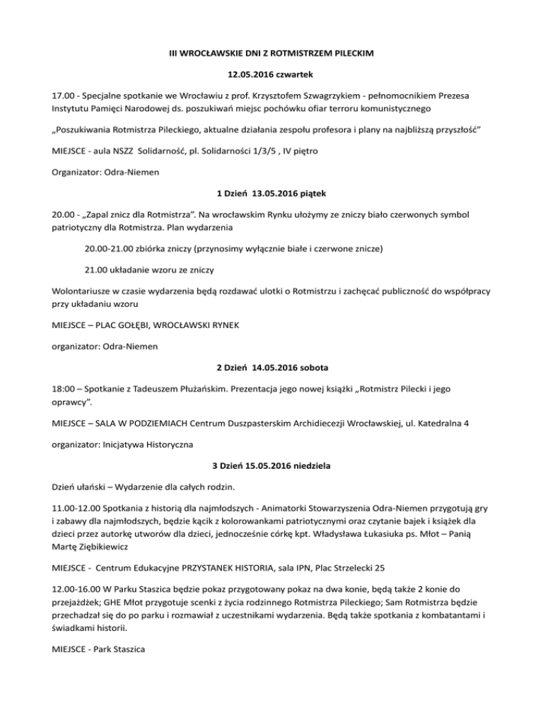 III WROCŁAWSKIE DNI Z ROTMISTRZEM PILECKIM 12.05.2016 czwartek 17.00 - Specjalne spotkanie we Wrocławiu z prof. Krzysztofem Szwagrzykiem - pełnomocnikiem Prezesa Instytutu Pamięci Narodowej ds. poszukiwań miejsc pochówku ofiar terroru komunistycznego „Poszukiwania Rotmistrza Pileckiego, aktualne działania zespołu profesora i plany na najbliższą przyszłość” MIEJSCE - aula NSZZ Solidarność, pl. Solidarności 1/3/5 , IV piętro Organizator: Odra-Niemen 1 Dzień 13.05.2016 piątek 20.00 - „Zapal znicz dla Rotmistrza”. Na wrocławskim Rynku ułożymy ze zniczy biało czerwonych symbol patriotyczny dla Rotmistrza. Plan wydarzenia 20.00-21.00 zbiórka zniczy (przynosimy wyłącznie białe i czerwone znicze) 21.00 układanie wzoru ze zniczy Wolontariusze w czasie wydarzenia będą rozdawać ulotki o Rotmistrzu i zachęcać publiczność do współpracy przy układaniu wzoru MIEJSCE – PLAC GOŁĘBI, WROCŁAWSKI RYNEK organizator: Odra-Niemen 2 Dzień 14.05.2016 sobota 18:00 – Spotkanie z Tadeuszem Płużańskim. Prezentacja jego nowej książki „Rotmistrz Pilecki i jego oprawcy”. MIEJSCE – SALA W PODZIEMIACH Centrum Duszpasterskim Archidiecezji Wrocławskiej, ul. Katedralna 4 organizator: Inicjatywa Historyczna 3 Dzień 15.05.2016 niedziela Dzień ułański – Wydarzenie dla całych rodzin. 11.00-12.00 Spotkania z historią dla najmłodszych - Animatorki Stowarzyszenia Odra-Niemen przygotują gry i zabawy dla najmłodszych, będzie kącik z kolorowankami patriotycznymi oraz czytanie bajek i książek dla dzieci przez autorkę utworów dla dzieci, jednocześnie córkę kpt. Władysława Łukasiuka ps. Młot – Panią Martę Ziębikiewicz MIEJSCE - Centrum Edukacyjne PRZYSTANEK HISTORIA, sala IPN, Plac Strzelecki 25 12.00-16.00 W Parku Staszica będzie pokaz przygotowany pokaz na dwa konie, będą także 2 konie do przejażdżek; GHE Młot przygotuje scenki z życia rodzinnego Rotmistrza Pileckiego; Sam Rotmistrza będzie przechadzał się do po parku i rozmawiał z uczestnikami wydarzenia. Będą także spotkania z kombatantami i świadkami historii. MIEJSCE - Park Staszica organizator: Odra-Niemen 4 Dzień 16.05.2016 poniedziałek 13.00 „Rotmistrz Pilecki w więzieniu” - prezentacja filmu „Witold” i spotkanie z więźniami z Zakładu Karnego przy ul. Kleczkowskiej. Organizacja i prowadzenie spotkania Dominika Arendt-Witchen oraz red. Krzysztof Kunert organizator: Inicjatywa Historyczna 18:00 Debata społeczno-polityczna „Co zrobiono dla Rotmistrza od 2006 roku: polityka, biznes, ruchy społeczne” - debatują: Michał Ujazdowski były Minister Kultury, Europoseł; Wojciech Setny- Prezes Surge Polonia; Maciej Rajfur, Krzysztof Kunert, dziennikarze; Ilona Gosiewska Stowarzyszenie Odra-Niemen ruch społeczny; Dominika Arendt-Wittchen, Stowarzyszenie Inicjatywa Historyczna – moderator spotkania. MIEJSCE – SALA W PODZIEMIACH Centrum Duszpasterskim Archidiecezji Wrocławskiej, ul. Katedralna 4 organizator: Inicjatywa Historyczna 5 Dzień 17.05.2016 wtorek Klub Dyskusyjno-filmowy. Prezentacja filmu „Zapora”, najnowszej produkcji IPN. Gość specjalny p. Teresa Partyka-Gaj "Kotwica". Sanitariuszka, żołnierz WSK, narzeczona Hieronima Dekutowskiego "Zapory" . Spotkania z gośćmi, z rodzinami Żołnierzy Wyklętych. Pokaz filmu jest organizowany dzięki pomocy IPN w ramach wydarzenia „Echa Katynia". MIEJSCE – SALA W PODZIEMIACH Centrum Duszpasterskim Archidiecezji Wrocławskiej, ul. Katedralna 4 organizator: Inicjatywa Historyczna 6 Dzień 18.05.2016 środa Konkurs z cennymi nagrodami na Facebooku "Co wiemy o Rotmistrzu" organizator: Odra-Niemen 7 Dzień 19.05.2016 czwartek 19.00 ‘’Za sprawę mojej Ojczyzny w potrzebie, krwi własnej ani życia nie szczędzić’’ -Witold Pilecki. Debata młodych nt. jak budować postawy patriotyczne wśród młodych ludzi? Jaki ma być patriotyzm w XXI wieku? Czy dobrze wykorzystujemy potencjał Pileckiego? O Rotmistrzu i fenomenie jego popularności. dyskutować będę przedstawiciele wrocławskich środowisk młodzieżowych MIEJSCE - Centrum Edukacyjne PRZYSTANEK HISTORIA, sala IPN, Plac Strzelecki 25 organizator: Stowarzyszenie Koliber/Odra Niemen/Inicjatywa Historyczna 8 Dzień 20.05.2016 piątek Finał VII edycji projektu Instytutu Pamięci Narodowej, OBEP we Wrocławiu, Kamienie Pamięci „…za to, że byli Polakami” 9.30-12.00 prezentacja opracowań grup projektowych, demonstrowanie wyników pracy ekspertom, którzy na uroczystej gali podzielą się swoimi wrażeniami 10.00-11.15 wyjazd reprezentantów każdej grupy pod pomnik Ofiar Terroru Komunistycznego 19451956, zapalenie zniczy 10.00-12.00 prezentacja filmów dokumentalnych 12.00-12.30 zamknięcie stoisk 12.30-14.00 uroczysta gala wręczenia dyplomów oraz Kamieni Pamięci MIEJSCE - Centrum Kultury AGORA, ul. Serbska 5 Organizator: IPN 14.00 18.00 Prezentacja zwiastuna teledysku do utworu raper Sovy „Modlitwa Żołnierzy Wyklętych". W teledysku wzięli udział członkowie GHE Młot. Spotkanie będzie też okazją do rozmowy z młodymi artystami na temat tworzenia muzycznych form opisujących polską historię. MIEJSCE – Klub Pieśniarze , ul. Szewska organizator: Odra-Niemen 9 Dzień 21.05.2016 sobota 12.00-15.00 Piknik rodzinno-sportowy– turniej szachowy, pokaz szermierki, spotkania z kombatantami, kącik edukacyjny dla dzieciaków, różne gry sportowe dla najmłodszych, ale też dla całych rodzin, na zakończenie wspólny bieg „Rodzinnie dla Rotmistrza” MIEJSCE - stadion MKSu, ul. Lotnicza 72, Wrocław organizator: Odra-Niemen 10 Dzień 22.05.2016 niedziela 9.00- 17.00 Rajd rowerowy „Dla Rotmistrza”. START 9.00 Wrocław Pomnik Pileckiego – META 12.00 Sobótka Pomnik Pileckiego 12.00-14.00 spotkania pod Pomnikiem Rotmistrza Pileckiego 14.00-17.00 Powrót do Wrocławia organizator: Odra-Niemen 11 Dzień 23.05.2016 poniedziałek 13.00 „Rotmistrz Pilecki w więzieniu” - prezentacja filmu „Witold” i spotkanie z więź