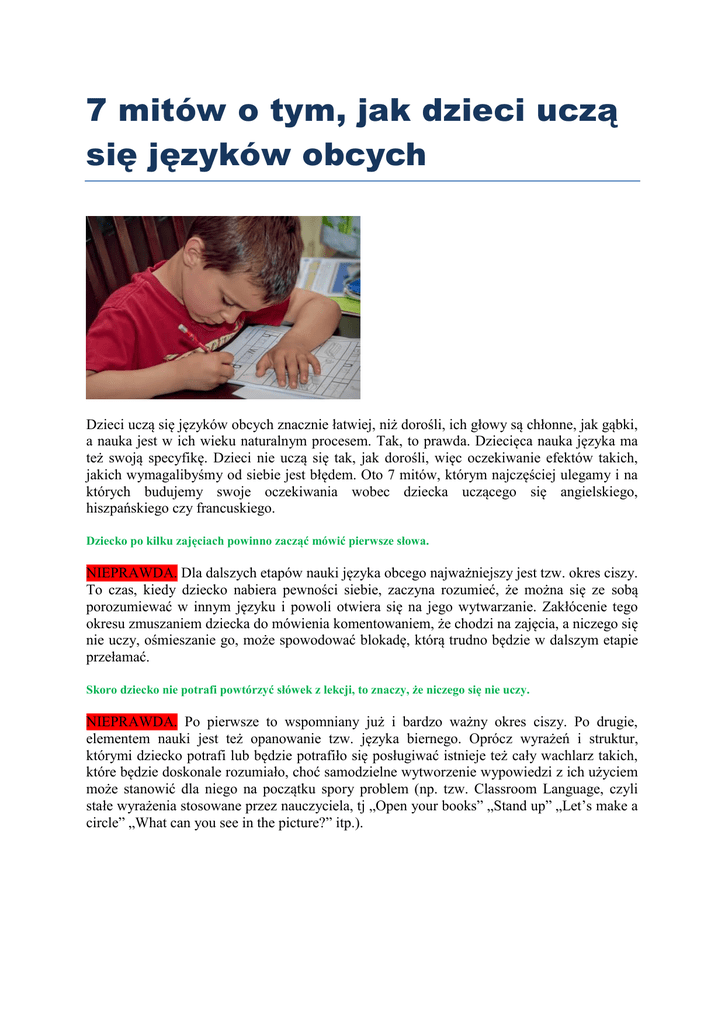 7 mitów o tym, jak dzieci uczą się języków obcych Dzieci uczą się języków obcych znacznie łatwiej, niż dorośli, ich głowy są chłonne, jak gąbki, a nauka jest w ich wieku naturalnym procesem. Tak, to prawda. Dziecięca nauka języka ma też swoją specyfikę. Dzieci nie uczą się tak, jak dorośli, więc oczekiwanie efektów takich, jakich wymagalibyśmy od siebie jest błędem. Oto 7 mitów, którym najczęściej ulegamy i na których budujemy swoje oczekiwania wobec dziecka uczącego się angielskiego, hiszpańskiego czy francuskiego. Dziecko po kilku zajęciach powinno zacząć mówić pierwsze słowa. NIEPRAWDA. Dla dalszych etapów nauki języka obcego najważniejszy jest tzw. okres ciszy. To czas, kiedy dziecko nabiera pewności siebie, zaczyna rozumieć, że można się ze sobą porozumiewać w innym języku i powoli otwiera się na jego wytwarzanie. Zakłócenie tego okresu zmuszaniem dziecka do mówienia komentowaniem, że chodzi na zajęcia, a niczego się nie uczy, ośmieszanie go, może spowodować blokadę, którą trudno będzie w dalszym etapie przełamać. Skoro dziecko nie potrafi powtórzyć słówek z lekcji, to znaczy, że niczego się nie uczy. NIEPRAWDA. Po pierwsze to wspomniany już i bardzo ważny okres ciszy. Po drugie, elementem nauki jest też opanowanie tzw. języka biernego. Oprócz wyrażeń i struktur, którymi dziecko potrafi lub będzie potrafiło się posługiwać istnieje też cały wachlarz takich, które będzie doskonale rozumiało, choć samodzielne wytworzenie wypowiedzi z ich użyciem może stanowić dla niego na początku spory problem (np. tzw. Classroom Language, czyli stałe wyrażenia stosowane przez nauczyciela, tj „Open your books” „Stand up” „Let’s make a circle” „What can you see in the picture?” itp.). Dzieci na zajęciach tylko śpiewają i kolorują, to żadna nauka. NIEPRAWDA. Kolorowanie to jedna z wielu aktywności, w których dziecko bierze udział. Przy każdym ćwiczeniu (również przy kolorowance) nauczyciel używa (a przynajmniej powinien) języka angielskiego – daje polecenia, zadaje pytania do ilustracji, zachęca dzieci do samodzielnego wydawania poleceń grupie, opisuje obrazki itd. Kolorowanka jest zwykle zwieńczeniem kilku innych zabaw opartych na utrwalaniu wyrażeń. Piosenki natomiast to doskonały sposób na naukę mówienia. Są one zazwyczaj tak wymyślone, żeby podczas ich śpiewania dzieci powtarzały określoną strukturę gramatyczną lub słownictwo. Śpiewając i rymując uczniowie „mówią” nawet nie zdając sobie z tego sprawy. Dodatkowo piosenki są tak napisane, aby pomóc opanować akcenty oraz charakterystyczną dla danego języka melodię. Żeby dziecko dobrze nauczyło się mówić można mu obok angielskiego słówka zapisać jego fonetyczną wymowę. NIEPRAWDA. Tego absolutnie nie powinno się robić. Po pierwsze dlatego, że na etapie uczenia się pisania w obcym języku, dziecko zaczyna popełniać wiele błędów, ponieważ zwykle zdąży już zapamiętać tę wersję zapisaną fonetycznie. Po drugie dlatego, że dzieci uczą się inaczej niż dorośli, nie potrzeba im przeczytania słówka, aby zapamiętać poprawną jego wymowę. Zachęcam raczej do częstego słuchania piosenek i rymowanek. Niektóre szkoły językowe opierają się na materiałach autorskich. Warto korzystać z ich elementów w domu (np. z płyt CD pomocnych w powtarzaniu piosenek). Ćwiczenie w domu pisania, czytania, robienie „rodzicielskich testów” z 6-8 letnim dzieckiem pomaga w szybszej nauce. NIEZUPEŁNIE. Dzieciom testy (a co za tym idzie ocena) nie są potrzebne do zwiększenia motywacji. Podstawowym powodem, dla którego dziecko w wieku do około 7-8 roku życia uczęszcza na zajęcia językowe jest fakt, że je lubi. Darzy sympatią osobę prowadzącą, dobrze się czuje na lekcji, ciekawi je i pociąga możliwość dogadania się z kimś z innego kraju. Jeśli pracuje w miłej atmosferze, bawi się, śpiewa, a nawet nie odczuwa pracy w ogóle, a postrzega ten moment jako zabawę, w dodatku nie jest spięte z powodu tego, że po przyjściu do domu zostanie przepytane przez rodziców, babcie, dziadków i sąsiadkę ze znajomości nowego słownictwa, to zapewne najszybciej przyswoi sobie nowy materiał. Kiedy stoję pod drzwiami sali, w której odbywają się zajęcia to ciągle słyszę harmider, dzieci coś mówią, śmieją się, śpiewają głośno itd. Jak można pracować w takich warunkach? MOŻNA. A nawet trzeba. Oczywiście nie mówimy tu o sytuacji, w której uczniowie robią, co chcą, a osoba prowadząca nie jest w stanie przeprowadzić żadnej aktywności. Na jednym ze szkoleń, w których brałam udział, prelegent podkreślił, że jeśli na zajęciach językowych za drzwiami jest cisza, to znaczy, że dzieci się NIE uczą. I to jest samo sedno, bo żeby zacząć mówić, trzeba śpiewać, rymować, powtarzać… Im więcej aktywności, w których uczniowie mają możliwość wytworzyć język, tym lepiej, a więc nie zawsze hałas za drzwiami sal językowych oznacza nieporządek w pracy. Dziecko jest już w drugiej klasie, uczy się kolejny rok i ciągle są kolory, zwierzątka, a w ogóle nie ma gramatyki. Taka nauka to strata czasu. Lepiej zapisać na kurs jak będzie starsze. NIEPRAWDA. Z wieloletniego doświadczenia wiem, że na etapie klasy piątej czy szóstej, kiedy w grupie znajdzie się część osób, które nie uczęszczały na zajęcia językowe i część takich, które rozpoczęły naukę języka w wieku przedszkolnym lub wczesnoszkolnym różnica między nimi jest wyraźnie dostrzegalna. Ci drudzy znacznie szybciej przyswajają nowe słownictwo. Nie mają też większych problemów z poprawną pisownią. Szybciej i chętniej reagują w sytuacjach komunikacyjnych (odpowiadają bez większych oporów w obcym języku). Program w początkowych latach nauki faktycznie jest podobny, jednak z kolejnym rokiem liczba słówek z danego zakresu temat