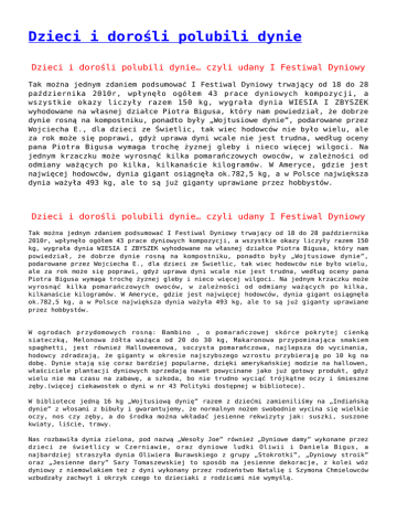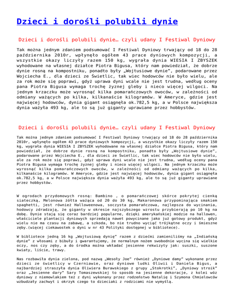 Dzieci i dorośli polubili dynie Dzieci i dorośli polubili dynie… czyli udany I Festiwal Dyniowy Tak można jednym zdaniem podsumować I Festiwal Dyniowy trwający od 18 do 28 października 2010r, wpłynęło ogółem 43 prace dyniowych kompozycji, a wszystkie okazy liczyły razem 150 kg, wygrała dynia WIESIA I ZBYSZEK wyhodowane na własnej działce Piotra Bigusa, który nam powiedział, że dobrze dynie rosną na kompostniku, ponadto były „Wojtusiowe dynie”, podarowane przez Wojciecha E., dla dzieci ze Świetlic, tak wiec hodowców nie było wielu, ale za rok może się poprawi, gdyż uprawa dyni wcale nie jest trudna, według oceny pana Piotra Bigusa wymaga trochę żyznej gleby i nieco więcej wilgoci. Na jednym krzaczku może wyrosnąć kilka pomarańczowych owoców, w zależności od odmiany ważących po kilka, kilkanaście kilogramów. W Ameryce, gdzie jest najwięcej hodowców, dynia gigant osiągnęła ok.782,5 kg, a w Polsce największa dynia ważyła 493 kg, ale to są już giganty uprawiane przez hobbystów. Dzieci i dorośli polubili dynie… czyli udany I Festiwal Dyniowy Tak można jednym zdaniem podsumować I Festiwal Dyniowy trwający od 18 do 28 października 2010r, wpłynęło ogółem 43 prace dyniowych kompozycji, a wszystkie okazy liczyły razem 150 kg, wygrała dynia WIESIA I ZBYSZEK wyhodowane na własnej działce Piotra Bigusa, który nam powiedział, że dobrze dynie rosną na kompostniku, ponadto były „Wojtusiowe dynie”, podarowane przez Wojciecha E., dla dzieci ze Świetlic, tak wiec hodowców nie było wielu, ale za rok może się poprawi, gdyż uprawa dyni wcale nie jest trudna, według oceny pana Piotra Bigusa wymaga trochę żyznej gleby i nieco więcej wilgoci. Na jednym krzaczku może wyrosnąć kilka pomarańczowych owoców, w zależności od odmiany ważących po kilka, kilkanaście kilogramów. W Ameryce, gdzie jest najwięcej hodowców, dynia gigant osiągnęła ok.782,5 kg, a w Polsce największa dynia ważyła 493 kg, ale to są już giganty uprawiane przez hobbystów. W ogrodach przydomowych rosną: Bambino , o pomarańczowej skórce pokrytej cienką siateczką, Melonowa żółta ważąca od 20 do 30 kg, Makaronowa przypominająca smakiem spaghetti, jest również Halloweenowa, soczysta pomarańczowa, najlepsza do wycinania, hodowcy zdradzają, że giganty w okresie najszybszego wzrostu przybierają po 10 kg na dobę. Dynie stają się coraz bardziej popularne, dzięki amerykańskiej modzie na hallowen, właściciele plantacji dyniowych sprzedają nawet powycinane jako już gotowy produkt, gdyż wielu nie ma czasu na zabawę, a szkoda, bo nie trudno wyciąć trójkątne oczy i śmieszne zęby.(więcej ciekawostek o dyni w nr 43 Polityki dostępnej w bibliotece). W bibliotece jedną 16 kg „Wojtusiową dynię” razem z dziećmi zamieniliśmy na „Indiańską dynie” z włosami z bibuły i gwarantujemy, że normalnym nożem swobodnie wycina się wielkie oczy, nos czy zęby, a do środka można wkładać jesienne rekwizyty jak: suszki, suszone kwiaty, liście, trawy. Nas rozbawiła dynia zielona, pod nazwą „Wesoły Joe” również „Dyniowe damy” wykonane przez dzieci ze świetlicy w Czerniawie, oraz dyniowe ludki Oliwii i Daniela Bigus, a najbardziej straszyła dynia Oliwiera Burawskiego z grupy „Stokrotki”, „Dyniowy stroik” oraz „Jesienne dary” Sary Tomaszewskiej to sposób na jesienne dekoracje, z kolei wóz dyniowy z niemowlakiem też z dyni wykonany przez rodzeństwo Natalię i Szymona Chmielowców wzbudzały zachwyt i okrzyk czego to dzieciaki z rodzicami nie wymyślą. Prace były starannie wykonane, a co najważniejsze stanowiły świetną zabawę z dorosłymi. Dzieci z aktywu czytelniczego w Czerniawie wykonały Panienkę z dyni, a Olszewski Kuba z mamą i młodszą siostrą wymyślili „Śpiącą gąskę” i „Ważkę potwora”. Ponadto grupa dzieci z „Biedronek” ułożyła wiersz o dyni, która się pytała wszystkich „Dlaczego jestem taka, nie inna, troszeczkę smukła i bardziej zwinna” Gdy ktoś mnie mijał – to głowa kiwał (…) Teraz, gdy jesień piękna nastała dynia swą wartość w końcu dojrzała i dumna z siebie – głośno się śmiała, aż w ogródeczku grządka zadrżała Hania to słysząc dynię zerwała do swego domu ją przykulała Z miąższu tak delikatnego i do tego mięciutkiego przyrządziła coś smacznego Z zupy dyni smakowała ciastem wszystkich częstowała tylko kucharz dobrze wie, z dynią wiele uda się. To udowodnił Piotr Bigus – dostarczając ciasto dyniowe, było pycha!, po degustacji stwierdzili jednocześnie radni z burmistrzem na czele, również zupa, którą gotuje czytelnik jest bardzo smaczna i zdrowa, przepisy nam zdradzili panowie i namawiamy wszystkich do wykonania, gdyż dynia ma dużo wapnia, potasu, beta – karotenu oraz jest zalecana dla cukrzyków, gdyż zmniejsza insulinę, do tego kwasy tłuszczowe z grupy omega 3 , witaminy B, selen, magnez i cynk, a pestki zawierają witaminę płodności – tokoferol ( za Polityką dostępną w bibliotece). Bohaterem I Festiwalu Dyniowego stał się Piotr Bigus, za dynie wyhodowane we własnym ogródku i jak na razie będzie to pobicie rekordu 18 kg dynia WIESIA, za Tartę dyniową oraz a prace wspólnie wykonane z dziećmi własnymi oraz ze Świetlicy. W ostatnim dniu I Festiwalu ciekawe przepisy dostarczyła Joanna, czyli zupę krem z dyni, naprawdę łatwa do wykonania oraz kopytka z dynia, czyli cebule i czosnek posiekać, dynie kilogramową obgotować, przestudzić pokroić w kostkę i wymieszać z cebulą i czosnkiem, 2 papryki obrane ze skóry, pokrojone i upieczone w piekarniku, wymieszać z pozostałymi składnikami, kopytka wyłożyć do naczynia żaroodpornego, dodając przygotowane warzywa doprawić do smaku pieprzem, sola i gałką. Na wierzch posypać żółtym serem i natką pietruszki, zapiec w temp. Ok 180° 10 min, aż ser się rozpuści, podawać gorące. Wypróbowany przepi