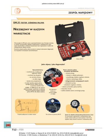 Section 19-1 GMP PL_noir 1/03/05 14:52 Page 712 pobrano ze strony www.imbth.com.pl NARZĘDZIA SPECJALISTYCZNE ZESPÓŁ NAPĘDOWY DM.35 TESTER CIŚNIENIA PALIWA NIEZBĘDNY W KAŻDYM WARSZTACIE Od początku lat 90-tych, wraz z upowszechnieniem się w Europie montażu w nowych samochodach układów wydechowych z katalizatorami, duża cześć samochodów z silnikami benzynowymi jest wyposażona w jedno-lub wielopunktowe układy wtrysku. Kontrola ciśnienia paliwa stała się przez to ważnym elementem diagnostyki we wszystkich warsztatach samochodowych. Zestaw DM.35 Jakie objawy i jaka diagnostyka? Samochód który: – uruchamia się z trudem przy nagrzanym silniku, – uruchamia się, ale gaśnie, – ma nierówne obroty, – ma słabe osiągi, – szarpie przy przyspieszaniu, – ma zbyt wysokie zużycie paliwa, wymaga kontroli układu wtrysku za pomocą czytnika kodu X.8000 i X.10000 Facom dla systemu elektronicznego i, jeżeli jest on sprawny, kontroli za pomocą testera ciśnienia paliwa DM.35 dla układu zasilania. Przykład podłączenia do układu wtrysku 712 - F05 Test kalkulatora wtrysku za pomocą X.8000 i X.10000 Tester ciśnienia paliwa umożliwia sprawdzenie: – ciśnienia pompy, – ciśnienia w układzie paliwowym, – prawidłowego działania regulatora ciśnienia, – ciśnienia rezydualnego układu, i zdiagnozowanie następujących awarii: – uszkodzenie pompy, – uszkodzenie regulatora ciśnienia, – zatkanie przewodów paliwa lub filtra, – nieszczelny wtrysk, – wadliwe działanie zaworu zwrotnego pompy. Test ciśnienia za pomocą DM.35 Zestaw do układów jednopunktowych(manometr 2 bar) W samochodach wyposażonych w jednopunktowy układ wtrysku ciśnienie paliwa jest niższe (poniżej 2 bar).W tym wypadku należy stosować manometr z dostosowaną skalą. Katalog elektroniczny na www.facom.com IM Kraków : 31-231 Kraków, ul. Siewna 30, tel. (012) 415-80-81, fax. (012) 415-80-39, [email protected] IM Chorzów : 41-500 Chorzów, ul. Młodzieżowa 17, tel. (032) 241-20-20, fax. (032) 247-63-31, [email protected]