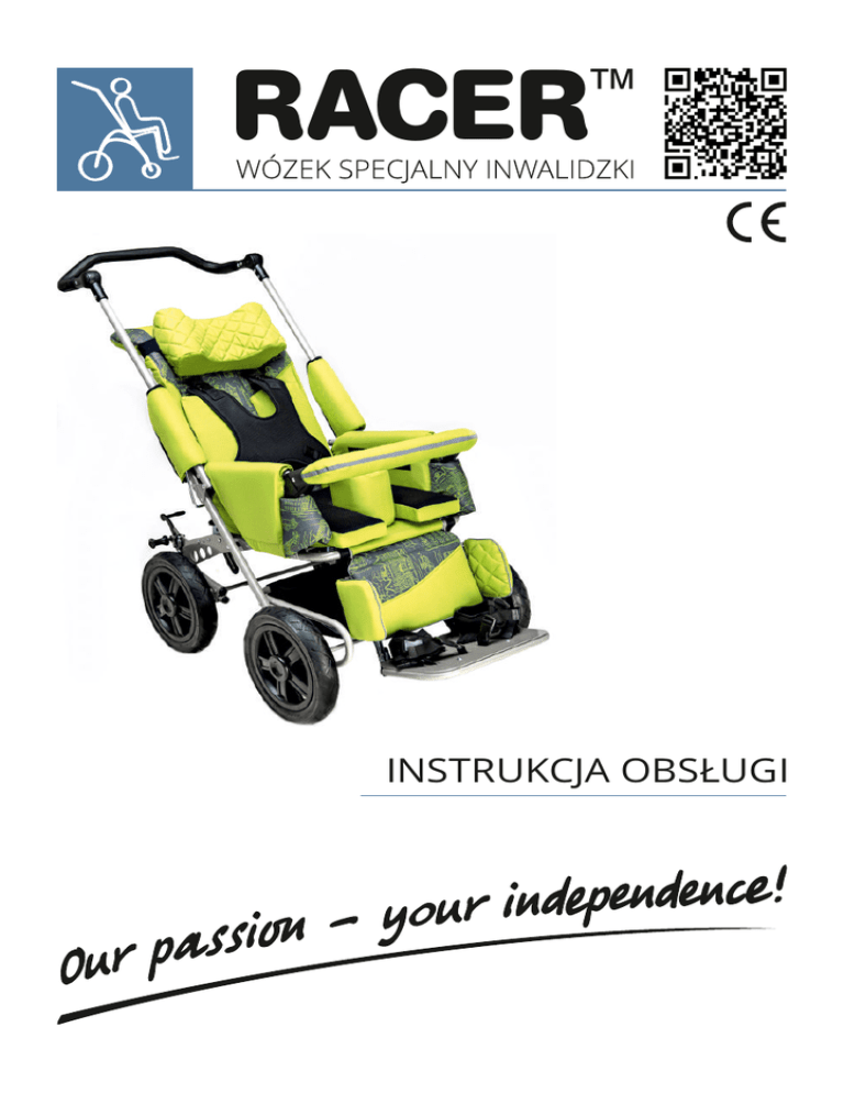 RACER ™ INSTRUKCJA OBSŁUGI R 5 903240 632312 UWAGA! Producent ponosi odpowiedzialność za właściwe funkcjonowanie sprzętu wyłącznie w wypadku jego zakupu u wykwalifikowanego pracownika firmy Akces-MED sp. z o.o. lub w wyspecjalizowanym sklepie medycznym! UWAGA! AKCES-MED Sp. z o.o. zastrzega sobie prawo do wprowadzania zmian technicznych i handlowych w treści instrukcji bez wcześniejszego uprzedzenia. Wyrób medyczny klasy I zgodny z Dyrektywą 93/42/EWG Parlamentu Europejskiego i Rady w sprawie wyrobów medycznych oraz z ustawą z dnia 20 maja 2010 r. o wyrobach medycznych (Dz.U. z 2010 r,Nr 107, poz. 679). Na wyrób producent wystawił stosowaną deklarację zgodności. Oznaczenie producenta w Urzędzie Rejestracji Produktów Leczniczych, Wyrobów Medycznych i Produktów Biobójczych: PL/CA01 04088/W Firma Akces-Med Sp. z o.o. wdrożyła system zarządzania jakością zgodny z normą ISO 13485 w zakresie projektowania całości produkcji, sprzedaży i serwisu. System certyfikowany przez Det Norske Veritas. RACER SPIS TREŚCI 1. Przeznaczenie instrukcji........................................................................................................6 2. Wskazania do stosowania wyrobu......................................................................................6 3. Ogólna budowa wózka ........................................................................................................7 3.1. Wyposażene standardowe..........................................................................................7 3.2. Wyposażenie ponadstandardowe..............................................................................8 4. Tabela wymiarowa..............................................................................................................12 5. Opis montażu wózka..........................................................................................................13 6. Szczegółowy opis obsługi wózka.....................................................................................13 6.1 Rozkładanie wózka .................................................................................................13 6.2 Składanie wózka ....................................................................................................15 6.3 Regulacja długości podnóżka................................................................................16 6.4 Regulacja kąta pochylenia oparcia..........................................................................17 6.5 Regulacja kąta położenia podnóżka...................................................................17 6.6 Pasy stabilizujące stopy..............................................................................................17 6.7 Zagłówek....................................................................................................................17 6.8 Kamizelka.........................................................................................................18 6.9 Peloty boczne............................................................................................................19 6.10 Klin międzyudowy.....................................................................................19 6.11 Koła..........................................................................................................19 6.12 Hamulec postojowy..................................................................................20 6.13 Barierka bezpieczeństwa..........................................................................20 6.14 Regulowana rączka...................................................................................21 6.15 Osłony mechanizmu składania wózka....................................................21 7. Montaż wyposażenia ponadstandardowego...................................................................22 7.1 RCR_101 Pasy odwodzące uda......................................................................22 7.2 RCR_402 Parasolka........................................................................................23 7.3 RCR_403 Stolik..............................................................................................23 7.4 RCR_405 Daszek...........................................................................................24 7.5 RCR_404 Daszek z pokrowcem.....................................................................24 : www.akces-med.com ' +48 17 864 04 70 * [email protected] RACER 7.6 RCR_501 Torba.......................................................................................................25 7.7 RCR_107 Pas biodrowy........................................................................................25 7.8 RCR_121 Zagłówek z podparciem głowy........................................................26 7.9 RCR_410 Pokrowiec na zagłówek..........................................................................26 7.10 RCR_411 Uchwyt na kubek..................................................................................26 7.11 RCR_412 Poduszka przeciwodleżynowa ELASTICO..........................................27 7.12 RCR_417 Śpiwór zimowy.......................................................................................28 7.13 RCR_418 Kapturek do śpiwora zimowego...........................................................29 7.14 RCR_004 Niskie osłony boczne głowy...............................................................30 7.15 RCR_005 Wysokie osłony boczne głowy...........................................................30 7.16 RCR_124 Pelota lędźwiowa..................................................................................30 7.17 RCR_420 Daszek z osłonami bocznymi............................................................31 7.18 RCR_126 Pas tułowia...........................................................................................32 7.19 RCR_137 Poduszka zawężająca si