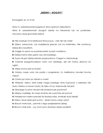 „BIEDNY – BOGATY” Ewangelia: Łk 16,19-22 Aktor A- przedstawiciel bogatych (stoi z jednym dzieckiem) Aktor B- przedstawiciel ubogich (siedzi na taborecie lub na podłodze, otoczony dużą gromadą dzieci) A: Nie smakuje mi ta kiełbasa! Wyrzucę ją - i tak nikt nie widzi! B: Dzieci, zobaczcie, czy znajdziecie jeszcze coś na śmietnisku. Nie wystarczy dzisiaj dla wszystkich. A: Ciągle to samo na podwieczorek: budyń waniliowy. B: Dzisiaj mamy tylko garść ryżu dla każdego. A: Zupa nie jest dzisiaj dobrze przyprawiona. Czegoś w niej brakuje. B: Chętnie przygotowałbym wam coś ciepłego, ale nie mamy drewna na ogień. A: Mięso znowu jest za tłuste! B: Gdyby nasze woły nie padły z pragnienia, to mielibyśmy również trochę mięsa! A: Ciasta już mam po dziurki w nosie! B: Widzicie, dzieci, biali ludzie mogą każdego dnia kupować u piekarza tak dużo chleba a nawet ciasta, ile tylko chcą. Naprawdę tak jest! A: Dlaczego to piwo nie jest tak słodzone jak powinno? B: Miejmy nadzieję, że nasza studnia nie wyschnie do końca! A: Następnym razem przynieś tę droższą rybę, smakuje dużo lepiej! B: Dzieci, teraz rzeka jest sucha. - Skąd mamy wziąć ryby? A: Brzuch mnie boli... pewnie z tego przejedzenia dzisiaj. B: Brzuch mnie boli... czy choć jutro dostanę ciepły posiłek?