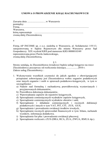 UMOWA O PROWADZENIE KSIĄG RACHUNKOWYCH Zawarta dnia .......................... , w Warszawie pomiędzy: Firmą............................................................................................................ Warszawa, którą reprezentuje ............................................................................ zwaną dalej Zleceniodawcą a Firmą AP INCOME sp. z o.o. siedzibą w Warszawie, al. Solidarności 155/13, zarejestrowaną w Sądzie Rejonowym dla miasta Warszawy przez Sąd Gospodarczy XIX wydział KRS pod numerem KRS 0000010349 reprezentowaną przez Pawła Jankowskiego, zwaną dalej Zleceniobiorcą. § 1. Strony ustalają, że Zleceniobiorca świadczyć będzie usługi księgowe na rzecz Zleceniodawcy począwszy od rozliczenia miesiąca...................2010 r. Zakres usług Zleceniobiorcy : 1. Wykonywanie wszelkich czynności do jakich zgodnie z obowiązującymi przepisami zobowiązany jest Zleceniodawca wobec organów podatkowych oraz innych organów i osób w sprawach podatkowo-księgowych, w tym w szczególności: a) Nadzór nad formalną i rachunkową prawidłowością wystawianych i przyjmowanych dokumentów, b) Prawidłowa dekretacja dokumentów, c) Wprowadzanie zapisów do rejestrów księgowych, d) Sporządzanie comiesięcznych wydruków zapisów księgowych, e) Sporządzanie comiesięcznych wydruków obrotów i sald, f) Sporządzanie i składanie comiesięcznych i rocznych deklaracji podatkowych i innych w tym VAT, PIT, CIT, ZUS, GUS, g) Sporządzanie i prowadzenie ewidencji środków trwałych, h) Sporządzanie rocznych sprawozdań finansowych w tym: bilans, rachunek wyników, informacja dodatkowa. i) Sporządzanie list płac i prowadzenie ewidencji płacowej. j) Sporządzanie rozliczeń z ZUS (DRA, RCA, ZUA, ZWUA, RMUA itp.). 1 2. Reprezentowanie Zleceniodawcy w Urzędzie Skarbowym i ZUS w związku z przyjętym zleceniem. Do podpisywania formularzy i deklaracji podatkowych Zleceniodawca upoważni Pana Pawła Jankowskiego. 3. Prowadzenie bieżących konsultacji dotyczących księgowości firmy Zleceniodawcy oraz pomoc w sprawach organizacyjnych. § 2. 1. Zleceniobiorca zobowiązuje się do rzetelnego i terminowego wykonywania usług zgodnie z obowiązującymi przepisami prawa (ustawy o rachunkowości z dn. 29.09.1994 r. Dz.U.121 poz.591 z późniejszymi zmianami ). 2. Wszelkie informacje, uzyskane od Zleceniodawcy w związku z wykonywaniem tej umowy Zleceniobiorca zobowiązuje się zachować w tajemnicy. 3. Usługi księgowe wykonywane będą w siedzibie Zleceniobiorcy, tam też przechowywane będą dokumenty księgowe Zleceniodawcy aż do momentu ich odbioru. § 3. Zleceniodawca zobowiązuje się do : a) przekazywania Zleceniobiorcy wszelkiej dokumentacji księgowej, niezbędnej do prawidłowego wykonania usługi, w terminie do 5-go dnia każdego miesiąca za miesiąc poprzedni. Powyższa dokumentacja zawierać będzie : opisane i zatwierdzone faktury sprzedaży, faktury zakupu, raporty kasowe, wyciągi bankowe, dokumenty kadrowopłacowe, oraz inne niezbędne dokumenty, które udostępniane będą Zleceniobiorcy niezwłocznie na jego prośbę, b) przez przekazanie dokumentacji rozumie się dostarczenie do siedziby Zleceniobiorcy lub odebranie od Zleceniodawcy opracowanych pod względem merytorycznym dokumentów księgowych, c) udzielania wszelkich informacji dot. dokumentacji księgowej w celu umożliwienia prawidłowego wykonania usługi , e) terminowego opłacania należności za usługę księgową. § 4. 1. Za wykonane usługi księgowe określone w § 1 umowy, Zleceniodawca będzie wypłacał Zleceniobiorcy wynagrodzenie w kwocie ............... zł brutto, płatne gotówką lub przelewem w terminie 7 dni od otrzymania faktury. 2. Za sporządzenie rocznego sprawozdania finansowego (bilansu) Zleceniobiorcy przysługuje wynagrodzenie oddzielne w wysokości jednego średniego miesięcznego wynagrodzenia. 3. W przypadku jednomiesięcznej zwłoki w płatności za fakturę Zleceniobiorca ma prawo zawiesić wykonanie usługi lub rozwiązać niniejszą umowę ze skutkiem natychmiastowym. 2 4. W przypadku zawieszenia usługi Zleceniodawca będzie przekazywał deklaracje „0” Zleceniodawcy do organów podatkowych i ZUS. § 5. 1. Umowa zostaje zawarta na czas nieokreślony. 2. Każda ze stron może odstąpić od umowy z zachowaniem okresu wypowiedzenia który wynosi jeden miesiąc. 1. 2. 3. 4. § 6. Zleceniobiorca oświadcza, że posiada obowiązkowe ubezpieczenie od OC w związku z usługowym prowadzeniem ksiąg rachunkowych. Zleceniobiorca oświadcza, że spełnia warunki wynikające z ustawy o rachunkowości w odniesieniu do obowiązku posiadania licencji zawodowej. Zleceniobiorca ponosi odpowiedzialność za szkody wynikłe jedynie z zawinionego przez siebie niewykonania lub nienależytego wykonania usługi. W takim przypadku Zleceniobiorca dokona niezbędnych korekt bez dodatkowego wynagrodzenia. Zleceniobiorca nie ponosi odpowiedzialności za prawidłowość ksiąg rachunkowych oraz wyliczonych danych w przypadku nieotrzymania kompletu dokumentów, nieterminowego ich przekazania lub nieprawidłowego ich wystawienia i opracowania od strony merytorycznej przez Zleceniodawcę. § 7. We wszelkich sprawach nieuregulowanych niniejszą umową mają zastosowanie właściwe przepisy Kodeksu Cywilnego. § 8. Zmiany dotyczące niniejszej umowy wymagają formy pisemnej podpisanej przez obie strony pod rygorem nieważności. § 9. Niniejsza umowa została sporządzona egzemplarzach po jednym dla każdej ze stron. Zleceniodawca w dwóch jednobrzmiących Zleceniobiorca 3