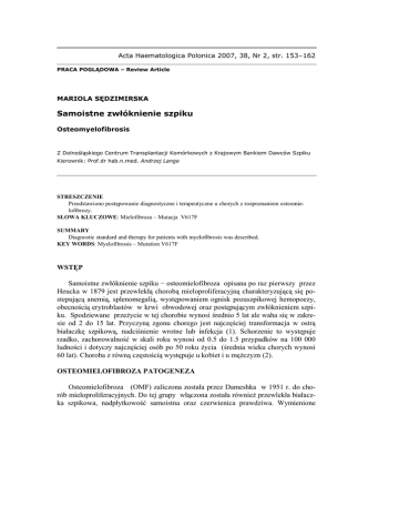 Acta Haematologica Polonica 2007, 38, Nr 2, str. 153–162 PRACA POGLĄDOWA – Review Article MARIOLA SĘDZIMIRSKA Samoistne zwłóknienie szpiku Osteomyelofibrosis Z Dolnośląskiego Centrum Transplantacji Komórkowych z Krajowym Bankiem Dawców Szpiku Kierownik: Prof.dr hab.n.med. Andrzej Lange STRESZCZENIE Przedstawiono postępowanie diagnostyczne i terapeutyczne u chorych z rozpoznaniem osteomielofibrozy. SŁOWA KLUCZOWE: Mielofibroza – Mutacja V617F SUMMARY Diagnostic standard and therapy for patients with myelofibrosis was described. KEY WORDS: Myelofibrosis – Mutation V617F WSTĘP Samoistne zwłóknienie szpiku − osteomielofibroza opisana po raz pierwszy przez Heucka w 1879 jest przewlekłą chorobą mieloproliferacyjną charakteryzującą się postepującą anemią, splenomegalią, występowaniem ognisk pozaszpikowej hemopoezy, obecnością erytroblastów w krwi obwodowej oraz postępującym zwłóknieniem szpiku. Spodziewane przeŜycie w tej chorobie wynosi średnio 5 lat ale waha się w zakresie od 2 do 15 lat. Przyczyną zgonu chorego jest najczęściej transformacja w ostrą białaczkę szpikową, nadciśnienie wrotne lub infekcja (1). Schorzenie to występuje rzadko, zachorowalność w skali roku wynosi od 0.5 do 1.5 przypadków na 100 000 ludności i dotyczy najczęściej osób po 50 roku Ŝycia (średnia wieku chorych wynosi 60 lat). Choroba z równą częstością występuje u kobiet i u męŜczyzn (2). OSTEOMIELOFIBROZA PATOGENEZA Osteomielofibroza (OMF) zaliczona została przez Dameshka w 1951 r. do chorób mieloproliferacyjnych. Do tej grupy włączona została równieŜ przewlekła białaczka szpikowa, nadpłytkowość samoistna oraz czerwienica prawdziwa. Wymienione 154 M. SĘDZIMIRSKA schorzenia tworzą klasyczną grupę chorób mieloproliferacyjnych. Dameshek wyodrębnił tę grupę chorób na drodze obserwacji klinicznych. UwaŜał, Ŝe są one wyrazem mieloproliferacyjnej aktywności komórek szpiku w odpowiedzi na bodziec. Nieznane były wówczas cechy mogące jednoznacznie opisać poszczególne jednostki chorobowe zaliczane do schorzeń mieloproliferacyjnych. UwaŜano Ŝe mogą one transformować z jednej postaci w drugą i ostatecznie ewoluować w ostrą białaczkę szpikową (3). W 1960 Nowell i Hungerford opisali pierwszy cytogenetyczny marker choroby mieloproliferacyjnej – chromosom Filadelfia występujący w przewlekłej białaczce szpikowej (4). W latach osiemdziesiątych po wprowadzeniu technik molekularnych opisano gen bcr/abl, który powstaje w wyniku translokacji protoonkogenu abl z chromosomu 9 na chromosom 22 gdzie ulega on fuzji z regionem bcr. Na matrycy bcr/abl powstaje chimeryczne białko o aktywności kinazy tyrozynowej (5). Odkrycie genu fuzyjnego bcr/abl zweryfikowało pogląd Dameshka i pozwoliło na wyodrębnienie z grupy chorób mieloproliferacyjnych przewlekłej białaczki szpikowej i opisanie jej w odniesieniu do obecności genu bcr/abl. Od tej pory dzielimy choroby mieloproliferacyjne ze względu na obecność genu fuzyjnego bcr/abl. WyróŜniamy bcr/abl dodatnią przewlekłą białaczkę szpikową oraz bcr/abl ujemną grupę chorób do której zaliczana jest nadpłytkowość samoistna, czerwienica prawdziwa i osteomielofibroza. Kolejnym krokiem było odkrycie pojedynczej mutacji V617F w obrębie genu dla kinazy tyrozynowej JAK 2. Spotykana jest ona w wysokim procencie u pacjentów z rozpoznaniem czerwienicy prawdziwej, nadpłytkowości samoistnej i osteomielofibrozy co moŜe sugerować istotność mutacji JAK 2 V617F dla powstawania tych chorób (6). Mutacja ta natomiast z małą częstością występuje w zespołach MDS i nieklasycznych chorobach mieloproliferacyjnych. JAK 2 − janusowa kinaza 2 jest kinazą tyrozynową naleŜącą do grupy kinaz białkowych katalizujących fosforylację białek. Przenoszenie grup fosforanowych jest kluczową reakcją zapewniającą przekazywanie sygnałów w komórce, zaś kinaza JAK 2 bierze udział w przekazywaniu sygnału z receptorów dla cytokin do wnętrza komórki. Cytokiny wpływają na wiele funkcji komórki między innymi wzrost, róŜnicowanie, chemotaksję, cytotoksyczność, biorą równieŜ udział w regulacji odporności (7). Swoje działanie wywołują po związaniu z odpowiednim receptorem. Następuje wówczas aktywacja kinazy tyrozynowej JAK 2, która powoduje ufosforylowanie cząsteczek STAT (signal transducers and activators of transcription), które wnikają do jądra komórki pobudzając transkrypcję docelowych genów. Droga przewodzenia sygnału JAK/STAT odgrywa główną rolę w proliferacji i przeŜyciu komórek (8). Kinaza tyrozynowa JAK 2 posiada dwie C końcowe domeny: C końcową funkcjonalną domenę JH1 (Jak homolog domain1) oraz C końcową niefunkcjonalną domenę tzw. pseudokinazę JH2 (Jak homolog domain2). Domena JH2 moŜe hamować aktywność kinazy. Gen dla JAK 2 zlokalizowany jest na krótkim ramieniu chromosomu 9. W punktowej mutacji V617F valina w pozycji 617 zostaje zastąpiona przez fenyloalaninę co powoduje destabilizację domeny JH2 i utratę zdolności autohamowania kinazy (9). MoŜe to tłumaczyć stałą cechę chorób mieloproliferacyjnych jaką jest nadmierna odpowiedź na działanie cytokin. Mutację JAK 2 V617F opisano w granulocytach, limfocytach T oraz w komórkach prekursorowych dla erytrocytów, granulocytów Samoistne zwłóknienie szpiku 155 i makrofagów . Częstość występowania mutacji JAK2 V617F w przypadku bcr/abl negatywnych chorób mieloproliferacyjnych wynosi: w czerwienicy prawdziwej od 65% do 97%, samoistnej nadpłytkowości od 23% do 57% zaś w osteomielofibrozie od 35% do 57% (10). OSTEOMIELOFIBROZA JAKO CHOROBA KLONALNA Megakariopoeza i granulopoeza w osteomielofibrozie jest efektem klonalnej proliferacji komórek macierzystych, natomiast rozrost fibroblastów powodujący zwłóknienie szpiku jest poliklonalny, ma charakter odczynowy i jest odpowiedzią na produkcję cytokin przez megakariocyty i monocyty. Produkowan