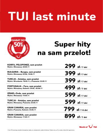 Super hity na sam przelot! KORFU, PELOPONEZ, sam przelot Wylot z Warszawy: 20.05.11 BUŁGARIA - Burgas, sam przelot Wylot z Warszawy: 03.06, 10.06.11 TURCJA - Antalya, sam przelot Wylot z Wrocławia: 18.05.11, z Poznania: 23.05.11 PORTUGALIA - Faro, sam przelot Wylot z Warszawy, Katowic: 29.05, .05.06.11 IZRAEL-Ovda, sam przelot Wylot z Warszawy: 19.05.11 TURCJA - Antalya, sam przelot Wylot z Warszawy, Poznania: 25.05.11 GRAN CANARIA, sam przelot Wylot z Poznania, Katowic: 24.05.11 GRAN CANARIA, sam przelot Wylot z Warszawy: 17.05.11 299 zł 399 zł 399 zł 499 zł 599 zł 599 zł 799 zł 899 zł + Ceny TUI zawierają wszystkie obowiązkowe opłaty, np. ubezpieczenie, opłaty lotniskowe. Podane ceny „od” za osobę. Liczba ofert ograniczona. / 7 dni / 7 dni / 7 dni / 7 dni / 7 dni / 7 dni / 14 dni / 7 dni