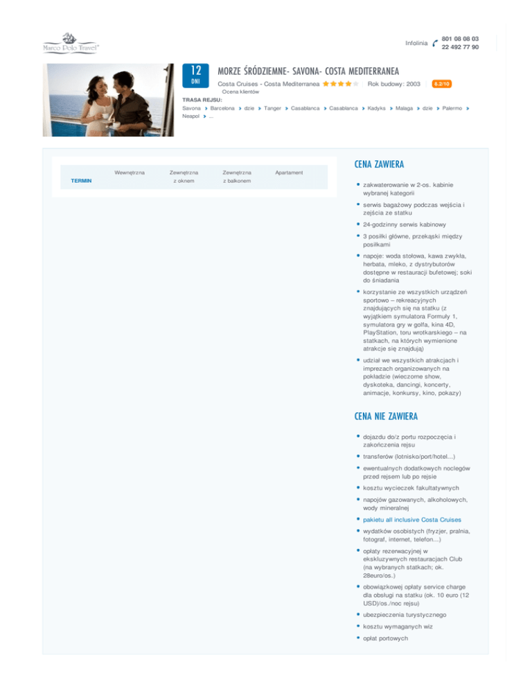 Infolinia 12 MORZE ŚRÓDZIEMNE- SAVONA- COSTA MEDITERRANEA DNI Costa Cruises - Costa Mediterranea | Rok budowy: 2003 | 801 08 08 03 22 492 77 90 8.2/10 Ocena klientów TRASA REJSU: Wewnętrzna TERMIN Savona Barcelona Neapol ... dzie Zewnętrzna Zewnętrzna z oknem z balkonem Tanger Casablanca Apartament Casablanca Kadyks Malaga dzie Palermo CENA ZAWIERA zakwaterowanie w 2-os. kabinie wybranej kategorii serwis bagażowy podczas wejścia i zejścia ze statku 24-godzinny serwis kabinowy 3 posiłki główne, przekąski między posiłkami napoje: woda stołowa, kawa zwykła, herbata, mleko, z dystrybutorów dostępne w restauracji bufetowej; soki do śniadania korzystanie ze wszystkich urządzeń sportowo – rekreacyjnych znajdujących się na statku (z wyjątkiem symulatora Formuły 1, symulatora gry w golfa, kina 4D, PlayStation, toru wrotkarskiego – na statkach, na których wymienione atrakcje się znajdują) udział we wszystkich atrakcjach i imprezach organizowanych na pokładzie (wieczorne show, dyskoteka, dancingi, koncerty, animacje, konkursy, kino, pokazy) CENA NIE ZAWIERA dojazdu do/z portu rozpoczęcia i zakończenia rejsu transferów (lotnisko/port/hotel...) ewentualnych dodatkowych noclegów przed rejsem lub po rejsie kosztu wycieczek fakultatywnych napojów gazowanych, alkoholowych, wody mineralnej pakietu all inclusive Costa Cruises wydatków osobistych (fryzjer, pralnia, fotograf, internet, telefon...) opłaty rezerwacyjnej w ekskluzywnych restauracjach Club (na wybranych statkach; ok. 28euro/os.) obowiązkowej opłaty service charge dla obsługi na statku (ok. 10 euro (12 USD)/os./noc rejsu) ubezpieczenia turystycznego kosztu wymaganych wiz opłat portowych