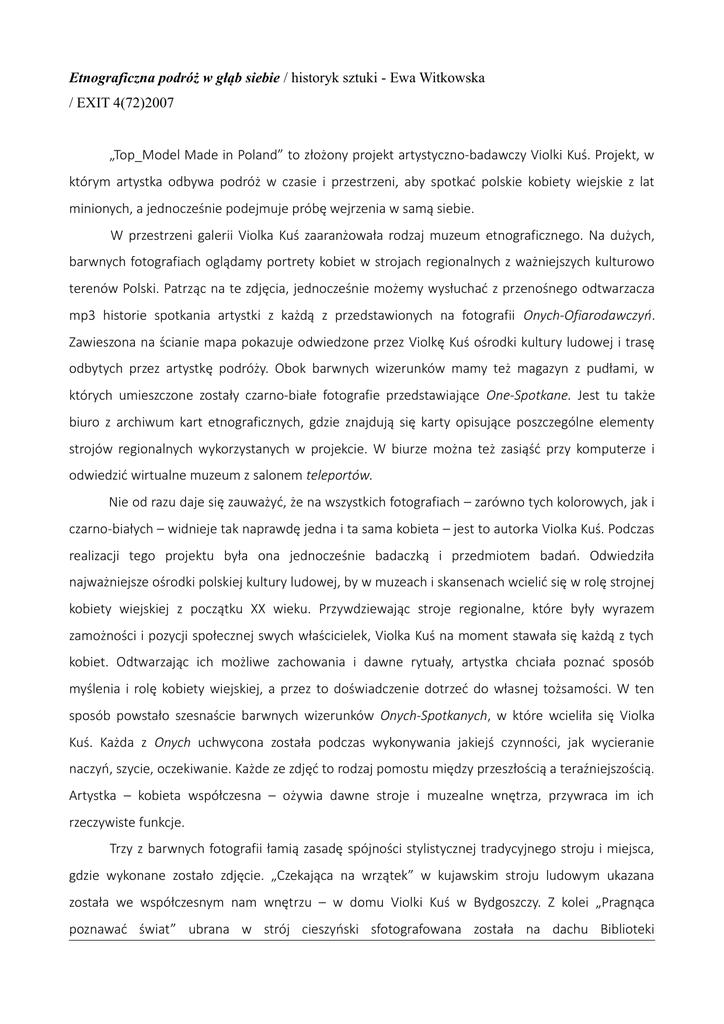 Etnograficzna podróż w głąb siebie / historyk sztuki - Ewa Witkowska / EXIT 4(72)2007 „Top_Model Made in Poland” to złożony projekt artystyczno-badawczy Violki Kuś. Projekt, w którym artystka odbywa podróż w czasie i przestrzeni, aby spotkać polskie kobiety wiejskie z lat minionych, a jednocześnie podejmuje próbę wejrzenia w samą siebie. W przestrzeni galerii Violka Kuś zaaranżowała rodzaj muzeum etnograficznego. Na dużych, barwnych fotografiach oglądamy portrety kobiet w strojach regionalnych z ważniejszych kulturowo terenów Polski. Patrząc na te zdjęcia, jednocześnie możemy wysłuchać z przenośnego odtwarzacza mp3 historie spotkania artystki z każdą z przedstawionych na fotografii Onych-Ofiarodawczyń. Zawieszona na ścianie mapa pokazuje odwiedzone przez Violkę Kuś ośrodki kultury ludowej i trasę odbytych przez artystkę podróży. Obok barwnych wizerunków mamy też magazyn z pudłami, w których umieszczone zostały czarno-białe fotografie przedstawiające One-Spotkane. Jest tu także biuro z archiwum kart etnograficznych, gdzie znajdują się karty opisujące poszczególne elementy strojów regionalnych wykorzystanych w projekcie. W biurze można też zasiąść przy komputerze i odwiedzić wirtualne muzeum z salonem teleportów. Nie od razu daje się zauważyć, że na wszystkich fotografiach – zarówno tych kolorowych, jak i czarno-białych – widnieje tak naprawdę jedna i ta sama kobieta – jest to autorka Violka Kuś. Podczas realizacji tego projektu była ona jednocześnie badaczką i przedmiotem badań. Odwiedziła najważniejsze ośrodki polskiej kultury ludowej, by w muzeach i skansenach wcielić się w rolę strojnej kobiety wiejskiej z początku XX wieku. Przywdziewając stroje regionalne, które były wyrazem zamożności i pozycji społecznej swych właścicielek, Violka Kuś na moment stawała się każdą z tych kobiet. Odtwarzając ich możliwe zachowania i dawne rytuały, artystka chciała poznać sposób myślenia i rolę kobiety wiejskiej, a przez to doświadczenie dotrzeć do własnej tożsamości. W ten sposób powstało szesnaście barwnych wizerunków Onych-Spotkanych, w które wcieliła się Violka Kuś. Każda z Onych uchwycona została podczas wykonywania jakiejś czynności, jak wycieranie naczyń, szycie, oczekiwanie. Każde ze zdjęć to rodzaj pomostu między przeszłością a teraźniejszością. Artystka – kobieta współczesna – ożywia dawne stroje i muzealne wnętrza, przywraca im ich rzeczywiste funkcje. Trzy z barwnych fotografii łamią zasadę spójności stylistycznej tradycyjnego stroju i miejsca, gdzie wykonane zostało zdjęcie. „Czekająca na wrzątek” w kujawskim stroju ludowym ukazana została we współczesnym nam wnętrzu – w domu Violki Kuś w Bydgoszczy. Z kolei „Pragnąca poznawać świat” ubrana w strój cieszyński sfotografowana została na dachu Biblioteki Uniwersyteckiej w Warszawie. Trzecie zdjęcie to zamykający cały cykl autoportret artystki w jej własnym, współczesnym stroju, jako „Szukającej własnej zguby” przy kapliczce św. Antoniego w zagrodzie bogatego chłopa z terenu Kujaw. Tym razem artystka nie spotyka kolejnej Onej z lat minionych – spotyka samą siebie. Jednocześnie odkrywa się przed widzem jako kobieta współczesna, ujawnia całą maskaradę, którą tak doskonale budowała na poprzednich fotografiach. Po przebyciu 9 tysięcy kilometrów w poszukiwaniu dawnej ludowej tożsamości kobiecej, Violka Kuś powraca do samej siebie, przyznaje, iż wcielanie się w role kobiet z lat minionych było dla niej tak naprawdę próbą dotarcia do prawdy o sobie samej. „Czy jestem inna?” – pyta artystka na koniec tej podróży i odpowiada: „Jestem taka sama, ale już nie ta sama (...)”.