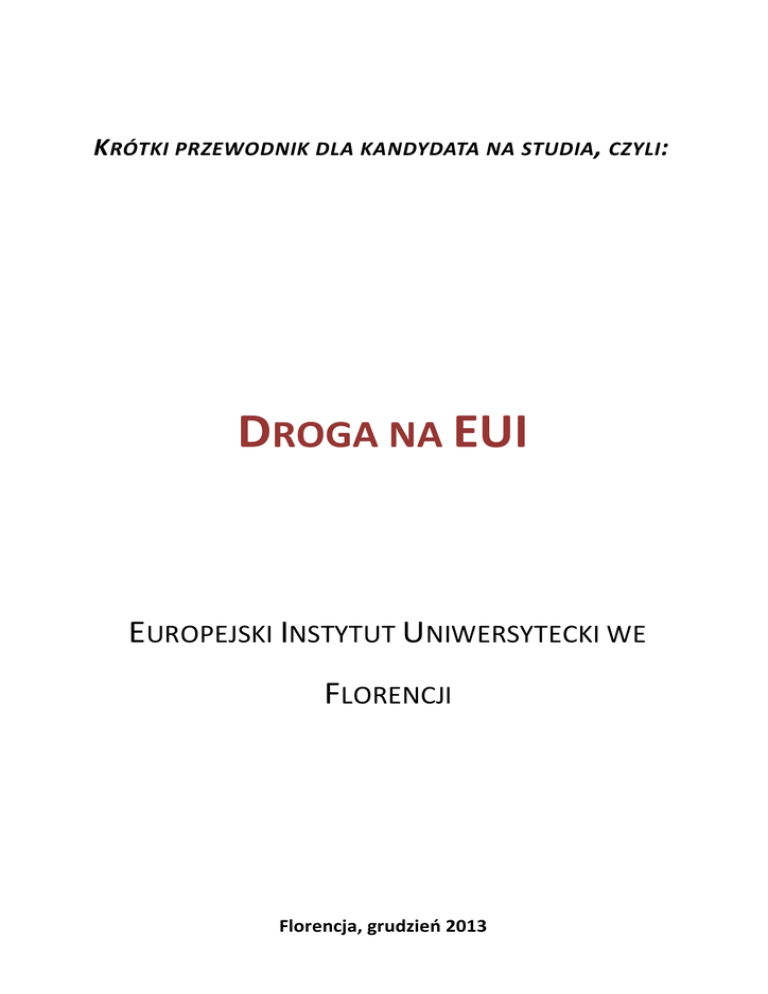 KRÓTKI PRZEWODNIK DLA KANDYDATA NA STUDIA , CZYLI: DROGA NA EUI EUROPEJSKI INSTYTUT UNIWERSYTECKI WE FLORENCJI Florencja, grudzień 2013 1 Spis treści 1. CZYM JEST EUROPEJSKI INSTYTUT UNIWERSYTECKI? ................................................................. 4 2. REKRUTACJA ............................................................................................................................................... 5 3. KILKA PORAD NATURY OGÓLNEJ ......................................................................................................... 5 4. PORADY SZCZEGÓŁOWE.......................................................................................................................... 8 4.1 EKONOMIA (ECO) ................................................................................................................................... 8 4.2 HISTORIA I CYWILIZACJA (HEC) ..........................................................................................................11 4.3 NAUKI POLITYCZNE I SPOŁECZNE (SPS) ..............................................................................................14 4.4 PRAWO (LAW) .....................................................................................................................................16 5. NAJCZĘSTSZE OBAWY ............................................................................................................................21 6. CZYM JEST POLISH COMMITTEE DZIAŁAJĄCE W EUI? .................................................................23 2 Droga Kandydatko, Drogi Kandydacie, każdy z nas podjął kiedyś decyzję o aplikowaniu na studia doktoranckie do Europejskiego Instytutu Uniwersyteckiego (EUI – European University Institute) i nikt z nas tej decyzji nie żałuje. Instytut jest miejscem, w którym wysoki poziom nauczania łączy się z możliwością dyskutowania o nurtujących nas problemach z czołowymi przedstawicielami nauk ekonomicznych, historycznych, politologicznych, prawnych i socjologicznych. Możemy również uczestniczyć w wymianach zagranicznych oraz w międzynarodowych programach badawczych. Naszym głównym zadaniem jest prowadzenie badań naukowych i przygotowanie pracy doktorskiej na jak najwyższym poziomie. Stypendium rządu polskiego sprawia, że możemy liczyć na 4 lata naukowej swobody i jak mówi Prezydent EUI, prof. J.H.H. Weiler – mieć czas na czytanie i myślenie. No i oczywiście na cieszenie się pięknem Florencji. Międzynarodowa renoma EUI, jak również opisane powyżej fakty sprawiają, że absolwenci Instytutu są świetnie przygotowani do podjęcia pracy po zakończeniu studiów doktoranckich. Fakt, że jesteśmy zadowoleni z naszego pobytu we Florencji, skłonił nas do przygotowania dla Ciebie krótkiego przewodnika „Droga na EUI”. Nie gwarantuje on co prawda, że z pewnością dostaniesz się na EUI, jesteśmy jednak przekonani, że poradnik może ułatwić Ci przygotowanie dobrego projektu badawczego, który pomoże Ci trafić na rozmowę kwalifikacyjną, a następnie na same studia. Już teraz zachęcamy Cię do spróbowania swoich sił w procesie rekrutacyjnym prowadzonym przez EUI, życzymy powodzenia i w razie dodatkowych pytań zapraszamy do kontaktu z nami. Adres mailowy znajdziesz na końcu niniejszego „przewodnika”. Członkowie Polish Committee działającego w EUI Niniejszy poradnik zawiera porady obecnych polskich studentów EUI, napisane w oparciu o ich osobiste doświadczenia zdobyte w procesie rekrutacji. Mimo dołożonych starań do jak najlepszego jego przygotowania, autorzy nie mogą zagwarantować, że zastosowanie się do tych porad zapewni kandydatom przyjęcie na EUI. Poradnik powstał wyłącznie z inicjatywy polskich studentów EUI, a władze Instytutu nie ponoszą odpowiedzialności za trafność zawartych w nim informacji. 3 1. Czym jest Europejski Instytut Uniwersytecki? Europejski Instytut Uniwersytecki jest organizacją międzynarodową, powołaną do życia w 1972 roku przez państwa członkowskie Wspólnot Europejskich. Celem tej unikatowej jednostki naukowej jest kształcenie na poziomie doktoranckim i podoktoranckim oraz prowadzenie zaawansowanych badań naukowych w dziedzinach, które są szczególnie ważne dla rozwoju Europy. EUI prowadzi czteroletnie studia doktoranckie oraz staże podoktorskie w ramach Robert Schuman Centre for Advanced Studies oraz Max Weber Programme, który jest największym tego typu programem na świecie. Instytut składa się z czterech departamentów: Nauk Politycznych i Społecznych, Ekonomii, Prawa oraz Historii i Cywilizacji, a doktorat w nich uzyskany należy do najbardziej cenionych w Europie i na świecie. Co roku o około 150 miejsc dostępnych w programie studiów doktoranckich ubiega się ok. 1700 kandydatów. Na EUI pracuje ponad 1000 osób z 60 krajów. Prowadzone przez nich badania mają charakter transnarodowy i interdyscyplinarny. Pod tym względem jest to instytucja nawiązująca do najlepszych renesansowych tradycji Florencji. Od 1986 roku na EUI mieszczą się ponadto Historyczne Archiwa Unii Europejskiej. Na EUI odbywa się ogromna (imponująca) liczba seminariów, debat, konferencji i wykładów, w których udział biorą osobistości ze świata nauki i polityki, dziennikarze i intelektualiści oraz urzędnicy instytucji unijnych. Co roku EUI organizuje kilkudniową konferencję The State of the Union, gdzie Przewodniczący Komisji Europejskiej wygłasza przemówienie o „kondycji” i aktualnych wyzwaniach Unii Europejskiej. Polska zaczęła współpracę z EUI w 2000 roku. Pięć lat później, tj. z chwilą, gdy Sejm ratyfikował Konwencję ustanawiającą Europejski Instytut Uniwersytecki, Polacy uzyskali możliwość odbywania tutaj studiów doktoranckich. Polska posiada swe przedstawicielstwo w Wysokiej Radzie (High Council), w której reprezentowane są państwa-‐strony Konwencji i która jest organem zarządzającym Instytutem, jak równie