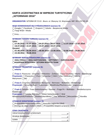 KARTA UCZESTNICTWA W IMPREZIE TURYSTYCZNEJ „SZTORMIAKI 2016” ORGANIZATOR: SZTORM SP Z O.O . Biuro: ul. Okaryny 13, Warszawa. NIP: 951-237-81-43 SKĄD DOWIEDZIAŁEŚ SIĘ O PÓŁKOLONIACH (zaznacz X): ⃝ Google ⃝ Facebook ⃝ Znajomi ⃝ Szkoła – Bezpieczna Woda ⃝ Targi Wiatr i Woda ⃝ Inny.................................................................. WYBRANY TERMIN TURNUSU (zaznacz X): Lipiec ⃝ 27.06.2016 – 01.07.2016 ⃝ 04.07.2016 – 08.07.2016 ⃝ 11.07.2016 – 15.07.2016 ⃝ 18.07.2016 – 22.07.2016 ⃝ 25.07.2016 – 29.07.2016 Sierpień ⃝ 01.08.2016 – 05.08.2016 ⃝ 08.08.2016 – 12.08.2016 ⃝ 16.08.2016 – 19.08.2016 ⃝ 22.08.2016 – 26.08.2016 WYBRANY RODZAJ PÓŁKOLONII (zaznacz X): ⃝ MALI PIRACI ⃝ MALI KAPITANOWIE ⃝OPTYMIST ⃝ SURVIVALOWE ⃝AKADEMIA REGATOWA - SZTORM REGATTA TEAM WYBRANY TRANSPORT (zaznacz X): ⃝ własny ⃝ Trasa 1: Piaseczno - Ursynów – Mokotów – Żoliborz - Trasa Toruńska – Marki – Białobrzegi Przystanek: ⃝ Piaseczno ⃝ Pyry ⃝Ursynów ⃝ SGH ⃝ Dw. Centralny ⃝ Metro Marymont ⃝ M1 ⃝ Trasa 2: Ursynów– Obwodnica Warszawy – Bemowo – Białołęka – Białobrzegi Przystanek: ⃝Ursynów Real ⃝ Lazurowa ⃝Modlińska/Płochocińska ⃝Legionowo ⃝ Trasa 3: Sadyba– Trasa Siekierkowska – Gocław – Praga Pn – Białołęka - - Rembelszczyzna Białobrzegi Przystanek: ⃝ Sadyba Best Mall ⃝Most Siekierkowski ⃝ Wał Miedzeszyński/Fieldorfa ⃝Stadion Narodowy ⃝ Dw. Wileński ⃝Marywilska ⃝ Rondka ATRAKCJE DODATKOWE (zaznacz X): ⃝ Przejażdżka motorówką (30zł) ⃝ Koszulka żeglarska (20zł) ⃝ Dostęp do zdjęć z kolonii (30zł) ⃝ Przejażdżka Jeepem w terenie (30zł) CENA CAŁKOWITA Udział dziecka/dzieci w koloniach …….....zł Atrakcje dodatkowe …….....zł SUMA .……....zł DANE UCZESTNIKA 1: Imię i nazwisko: ………………………………………………………………………………………………………………… Data urodzenia: ………………………………………………………………………………………………………………… PESEL: ………………………………………………………………………………………………………………………………. Adres zamieszkania: ………………………………………………………………………………………………………… DANE UCZESTNIKA 2: Imię i nazwisko: ………………………………………………………………………………………………………………… Data urodzenia: ………………………………………………………………………………………………………………… PESEL: ………………………………………………………………………………………………………………………………. Adres zamieszkania: …………………………………………………………………………………………………………. DANE ZGŁASZAJĄCEGO (RODZIC LUB OPIEKUN PRAWNY): Imię i nazwisko: ……………………………………………………………………………………………………………………. Telefon kontaktowy: ……………………………………………………………………………………………………………… Adres zamieszkania: ……………………………………………………………………………………………………………… e-mail: ………………………………………………………………………………………………………………………………….. DANE KONTAKTOWE RODZICÓW LUB OPIEKUNÓW PRAWNYCH: Matka (opiekun 1): Imię i nazwisko: …….……………………………………………………………………………… Telefon kontaktowy: …………………………………………………………………………………………………………….. Adres zamieszkania: ……………………………………………………………………………………………………………… e-mail: ………………………………………………………………………………………………………………………………….. Ojciec (opiekun 2): Imię i nazwisko: ……….……………………………………………………………………………… Telefon kontaktowy: …………………………………………………………………………………………………………….. Adres zamieszkania: ……………………………………………………………………………………………………………… e-mail: ………………………………………………………………………………………………………………………………….. INFORMACJE RODZICÓW (OPIEKUNÓW) O STANIE ZDROWIA DZIECKA (np. na jakie pokarmy i leki dziecko jest uczulone, jakie wykluczenia z diety, czy Rodzice zgłaszają jakieś uwagi na temat stanu zdrowia Uczestnika) ……………………………………………………………………………………………………………………………………………….. ……………………………………………………………………………………………………………………………………………….. ……………………………………………………………………………………………………………………………………………….. ……………………………………………………………………………………………………………………………………………….. Oświadczam, że podałam(em) wszystkie znane mi informacje o dziecku, które mogą pomóc w zapewnieniu właściwej opieki nad dzieckiem. Matka(opiekun 1)/Ojciec(opiekun 2): Imię i nazwisko: 
