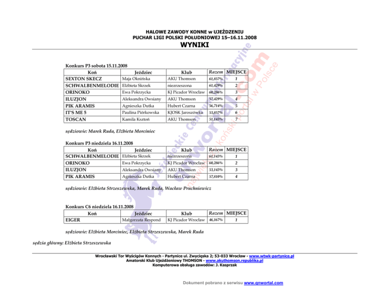 HALOWE ZAWODY KONNE w UJEŻDZENIU PUCHAR LIGI POLSKI POŁUDNIOWEJ 15–16.11.2008 WYNIKI Konkurs P3 sobota 15.11.2008 Koń Jeździec Maja Oknińska SEXTON SKECZ SCHWALBENMELODIE Elżbieta Skrzek Ewa Pokrzycka ORINOKO Aleksandra Owsiany ILUZJON Agnieszka Dutka PIK ARAMIS Paulina Piórkowska IT'S ME 5 Kamila Ksztoń TOSCAN Klub Razem MIEJSCE AKU Thomson 61,857% 1 niezrzeszona 61,429% 2 KJ Picador Wrocław 60,286% 3 AKU Thomson 57,429% 4 Hubert Czarna 56,714% 5 KJOSK Jaroszówka 53,857% 6 AKU Thomson 51,143% 7 sędziowie: Marek Ruda, Elżbieta Morciniec Konkurs P3 niedziela 16.11.2008 Koń Jeździec SCHWALBENMELODIE Elżbieta Skrzek Ewa Pokrzycka ORINOKO Aleksandra Owsiany ILUZJON Agnieszka Dutka PIK ARAMIS Klub Razem MIEJSCE niezrzeszona 61,143% 1 KJ Picador Wrocław 60,286% 2 AKU Thomson 53,143% 3 Hubert Czarna 57,810% 4 sędziowie: Elżbieta Strzeszewska, Marek Ruda, Wacław Pruchniewicz Konkurs C6 niedziela 16.11.2008 Koń Jeździec Małgorzata Respond EIGER Klub KJ Picador Wrocław Razem MIEJSCE 46,167% 1 sędziowie: Elżbieta Morciniec, Elżbieta Strzeszewska, Marek Ruda sędzia główny: Elżbieta Strzeszewska Wrocławski Tor Wyścigów Konnych - Partynice ul. Zwycięska 2; 53-033 Wrocław - www.wtwk-partynice.pl Amatorski Klub Ujeżdżeniowy THOMSON - www.akuthomson.republika.pl Komputerowa obsługa zawodów: J. Kasprzak Dokument pobrano z serwisu www.qnwortal.com HALOWE ZAWODY KONNE w UJEŻDZENIU PUCHAR LIGI POLSKI POŁUDNIOWEJ 15–16.11.2008 WYNIKI Halowy Puchar Ligi Polski Południowej (otwarty) Koń BROKER LOUSIANA GARNIZON RIPOSTA HA DRONT NAZAR ROSALINDE DERESSA Razem MIEJSCE N-9 C-3 Anna Brodowska LKJ Lewada Zakrzów 62,093% 63,905% 125,998% Karolina Mazurek SLKS Książ 61,279% 62,095% 123,374% Małgorzata Orłowska jun. KJ Absolut 57,907% 58,762% 116,669% Paulina Szołtys jun. AKU Thomson 54,186% 58,286% 112,472% Małgorzata Skubisz AKU Thomson --- 62,667% 62,667% Marta Ginda LKJ Lewada Zakrzów --- 61,429% 61,429% Aleksandra Wójcik KJ Absolut 59,767% --- 59,767% Patrycja Popławska KJ Absolut 56,744% --- 56,744% Jeździec Klub 1 2 3 4 Halowy Puchar Ligi Polski Południowej Juniorów Koń BROKER GARNIZON RIPOSTA HA N-9 C-3 Anna Brodowska jun. LKJ Lewada Zakrzów 62,093% 63,905% 125,998% Małgorzata Orłowska jun. KJ Absolut 57,907% 58,762% 116,669% Paulina Szołtys jun. AKU Thomson 54,186% 58,286% 112,472% Jeździec Klub Razem MIEJSCE 1 2 3 sędziowie: Marek Ruda, Wacław Pruchniewicz sędziowie: Elżbieta Strzeszewska, Elżbieta Morciniec, Marek Ruda sędzia główny: Elżbieta Strzeszewska Wrocławski Tor Wyścigów Konnych - Partynice ul. Zwycięska 2; 53-033 Wrocław - www.wtwk-partynice.pl Amatorski Klub Ujeżdżeniowy THOMSON - www.akuthomson.republika.pl Komputerowa obsługa zawodów: J. Kasprzak Dokument pobrano z serwisu www.qnwortal.com HALOWE ZAWODY KONNE w UJEŻDZENIU PUCHAR LIGI POLSKI POŁUDNIOWEJ 15–16.11.2008 WYNIKI Halowy Puchar Ligi Polski Południowej (otwarty) Koń Jeździec Klub Anna Brodowska jun. LKJ Lewada Zakrzów LADY CHATTERLAY Ewa Wężyk jun. KJ Lider WHY NOT 193 Małgorzata Skubisz AKU Thomson DRONT Marta Ginda LKJ Lewada Zakrzów NAZAR Jolanta Żarska Sułecka UKJ Wesoła CHMIEL C-5 CC-2 Razem MIEJSCE 62,667% 61,778% 124,445% 1 62,583% 61,259% 123,842% 2 --- 62,000% 61,333% --- 61,333% --- 60,667% 60,667% 62,000% Halowy Puchar Ligi Polski Południowej Młodych Jeźdźców Koń Jeździec Klub C-5 CC-2 Razem MIEJSCE Anna Brodowska jun. LKJ Lewada Zakrzów 62,667% 61,778% 124,445% 1 LADY CHATTERLAY Ewa Wężyk jun. KJ Lider 62,583% 61,259% 123,842% 2 WHY NOT 193 sędziowie: Elżbieta Strzeszewska, Elżbieta Morciniec, Wacław Pruchniewicz sędziowie: Elżbieta Strzeszewska, Marek Ruda, Wacław Pruchniewicz sędzia główny: Elżbieta Strzeszewska Wrocławski Tor Wyścigów Konnych - Partynice ul. Zwycięska 2; 53-033 Wrocław - www.wtwk-partynice.pl Amatorski Klub Ujeżdżeniowy THOMSON - www.akuthomson.republika.pl Komputerowa obsługa zawodów: J. Kasprzak Dokument pobrano z serwisu www.qnwortal.com HALOWE ZAWODY KONNE w UJEŻDZENIU PUCHAR LIGI POLSKI POŁUDNIOWEJ 15–16.11.2008 WYNIKI Halowy Puchar Ligi Polski Południowej (otwarty) Koń Jeździec Klub WITH YOU PEGASUS HB CASALE 2 MARKIZA FINEST 003 LEON CHMIEL BETINA CC-4 CC-8 Żaneta Skowrońska sen. LKJ Lewada Zakrzów 67,250% 66,150% 133,400% Razem MIEJSCE 1 Karolina Mazurek sen. SLKS Książ 64,667% 64,867% 129,534% 2 Żaneta Skowrońska sen. LKJ Lewada Zakrzów 65,417% 64,083% 129,500% 3 Marta Ginda sen. LKJ Lewada Zakrzów 63,333% 60,000% 123,333% 4 Łukasz Wituchowski sen. WLKS Krakus 60,583% 62,433% 123,016% 5 Ewa Szwed sen. KJ Aromer 58,917% 63,133% 122,050% 6 Jolanta Żarska-Sułecka sen. UKJ Wesoła 56,167% --- 56,167% Dorota Berent sen. KJ Imperial 49,000% --- 49,000% sędziowie: Elżbieta Strzeszewska, Marek Ruda, Wacław Pruchniewicz sędziowie: Wacław Pruchniewicz, Elżbieta Morciniec, Marek Ruda Halowy Puchar Ligi Polski Południowej Seniorów Koń Jeździec Klub WITH YOU PEGASUS HB MARKIZA FINEST 003 LEON CC-4 CC-8 Razem MIEJSCE Żaneta Skowrońska sen. LKJ Lewada Zakrzów 67,250% 66,150% 133,400% 1 Karolina Mazurek sen. SLKS Książ 64,667% 64,867% 129,534% 2 Marta Ginda sen. LKJ Lewada Zakrzów 63,333% 60,000% 123,333% 3 Łukasz Wituchowski sen. WLKS Krakus 60,583% 62,433% 123,016% 4 Ewa Szwed sen. KJ Aromer 58,917% 63,133% 122,050% 5 sędziowie: Elżbieta Strzeszewska, Marek Ruda, Wacław Pruchniewicz sędziowie: Wacław Pruchniewicz, Elżbieta Morciniec, Marek Ruda sędzia główny: Elżbieta Strzeszewska Wrocławski Tor Wyścigów Konnych - Partynice ul. Zwycięska 2; 53-033 Wrocław - www.wtwk-partynice.pl Amatorski Klub Ujeżdżeniowy THOMSON - www.akuthomson.republika.pl Komputerowa obsługa zawodów: J. Kasprzak Dokument pobrano z serwisu www.qnwortal.com HALOWE ZAWODY KONNE w UJEŻDZENIU PUCHAR LIGI POLSKI POŁUDNIOWEJ 15–16.11.2008 WYNIKI Business Class Ligi Polski Południowej (poziom I) Koń Jeździec Klub N-1 N-3 61,389% 59,912% 121,301% ---- 56,667% 56,