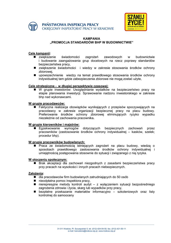 KAMPANIA „PROMOCJA STANDARDÓW BHP W BUDOWNICTWIE” Cele kampanii: zwiększenie świadomości zagrożeń zawodowych w budownictwie i budowanie zaangażowania grup docelowych na rzecz poprawy standardów bezpieczeństwa pracy, zwiększenie świadomości i wiedzy w zakresie stosowania środków ochrony zbiorowej, upowszechnienie wiedzy na temat prawidłowego stosowania środków ochrony indywidualnej tam gdzie zabezpieczenia zbiorowe nie mogą zostać użyte, Cele strategiczne - w długiej perspektywie czasowej: W grupie inwestorów: Uwzględnianie wydatków na bezpieczeństwo pracy na etapie planowania inwestycji. Sprawowanie nadzoru inwestorskiego w zakresie bhp nad wykonawcami. W grupie pracodawców: Faktyczna realizacja obowiązków wynikających z przepisów spoczywających na pracodawcy w zakresie organizacji bezpiecznej pracy na placu budowy. Preferowanie środków ochrony zbiorowej eliminujących ryzyko wypadku niezależnie od zachowania pracownika. W grupie kierowników i majstrów: Egzekwowanie wymogów dotyczących bezpiecznych zachowań przez pracowników (zastosowanie środków ochrony indywidualnej – kasków, szelek; procedur bhp). W grupie pracowników budowlanych: Praca ze świadomością istniejących zagrożeń na placu budowy, wiedzą o sposobach prawidłowego zastosowania środków ochrony indywidualnej i umiejętnością postępowania stosownie do sytuacji i związanego z nią ryzyka. W otoczeniu społecznym: Brak akceptacji dla zachowań niezgodnych z zasadami bezpieczeństwa pracy przy pracach na wysokości i innych pracach niebezpiecznych. Założenia: dla pracodawców firm budowlanych zatrudniających do 50 osób nieodpłatna pomoc inspektora pracy, nierepresyjne metody kontroli audyt – z wyłączeniem sytuacji bezpośredniego zagrożenia zdrowia i życia, skarg lub wypadków przy pracy, bezpłatne przekazanie materiałów informacyjno – szkoleniowych oraz listy kontrolnej do samooceny _______________________________________________________________________________________________________________________________________________________________________________ 31-011 Kraków, Pl. Szczepański 5, tel. (012) 424-04-50, fax. (012) 421-50-11 e-mail: [email protected], www.krakow.oip.pl Kampania „Bezpieczeństwo pracy w budownictwie” – chronologia. 2009. Część pierwsza „Bezpieczeństwo pracy w budownictwie - upadki, poślizgnięcia – zagrożenie upadkiem z wysokości”. 2010. Druga edycja kampanii pod nazwą „Bezpieczeństwo pracy w budownictwie” – realizowana jest pod hasłem „Szanuj życie! Bezpieczna praca na wysokości”. 2011.Trzeci rok kampanii pod nazwą „Bezpieczeństwo pracy w budownictwie” realizowany jest pod hasłem „Przygotowanie pracowników do pracy”. W trzecim roku Kampanii działania polegają na inspirowaniu pracodawców i przedsiębiorców budowlanych do rzetelnego spełniania obowiązków w zakresie ogólnej organizacji pracy, nadzoru nad wykonywaną pracą, w szczególności w zakresie przeprowadzania szkoleń wstępnych i okresowych dotyczących bezpieczeństwa i higieny pracy, przestrzegania wymogów dotyczących badań lekarskich, sprawowania kompetentnego i bezpośredniego nadzoru nad pracownikami oraz właściwie przeprowadzonej ocenie ryzyka zawodowego, dostosowanego do percepcji pracowników. Realizacja kampanii w roku 2011 przez OIP KRAKÓW: • • • • • przeprowadzono 25 szkoleń, przede wszystkim na terenie budów, aby nie odrywać pracowników od pracy, szkoleniom poddało się 374 uczestników, w tym 142 pracodawców, 187 pracowników, studenci, służba bhp, do programu przystąpił niemal co drugi przeszkolony pracodawca, podejmując zobowiązanie podwyższania standardów bezpieczeństwa, działania prewencyjne prowadzone są również na dużych budowach, gdzie prace realizowane są przez małe firmy – adresata Kampanii, generalni wykonawcy wspierają działania inspekcji pracy, organizując spotkania, a nawet wydając polecenia udziału w programie. Aktywne działanie wykazują firmy, które z tytułu zaangażowania uzyskały status Partnera lub Współpartnera Kampanii. Włączają się one poprzez udostępnianie terenu budowy celem zorganizowania pokazów zabezpieczeń zbiorowych: rusztowań, deskowania, podpór, a także stosowania środków ochrony indywidualnej. Przykłady: 1. Firma Wertykal Sp. z o.o., pierwsza zaproponowała pokazy sprzętu ochronnego przed upadkiem z wysokości, które przeprowadziła kilkakrotnie, w tym zainscenizowała akcję ratowniczą pracownika, który w uprzęży zawisł poniżej płaszczyzny pracy. Zostało to przedstawione podczas ubiegłorocznej konferencji prasowej przy wiadukcie w ciągu ulic Nowohucka - Powstańców. 2. Bardzo ciekawą praktyką jest realizowana przez Global Business Group Akademia Profesjonalnego Budownictwa, która organizuje bezpłatne szkolenia techniczne, gdzie poza prezentacją własną firmy, Inspektorzy Państwowej Inspekcji Pracy promują bezpieczne zachowania na budowach i pozyskują kontrahentów do programu prewencyjnego. 3. Firma „Mota Engil Central Europe” S. A. w ramach realizowanych przez Firmę działań prewencyjnych zaprosiła inspektorów pracy, którzy na budowie mostu w Zembrzycach przeprowadzili szkolenie dla kadry kierowniczej budowy, połączone z pokazem środków ochrony przed upadkiem z wysokości. Spośród ponadstandardowych działań podkreślić trzeba współpracę inspektorów pracy ze służbą bhp przy redagowaniu firmowej broszury dotyczącej bezpieczeństwa przy pracach budowlanych. Działanie to realizuje jeden z 2 celów kampanii jakim jest trwała zmiana sposobu myślenia o bezpieczeństwie pracy w grupie pracowników budowlanych. W treści znalazła się informacja o kampanii prewencyjnej PIP. 4. Skanska S. A. Oddział Budownictwa Hydro-inżynieryjnego w Krakowie w ramach Tygodnia Bezpieczeństwa zaprosiła inspektorów pracy, którzy przeprowadzili szkolenie dla kadry kierowniczej i pra