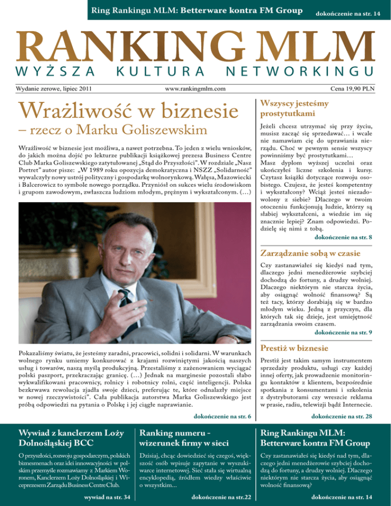 Ring Rankingu MLM: Betterware kontra FM Group WYŻSZA K U LT U R A Wydanie zerowe, lipiec 2011 dokończenie na str. 14 NETWORKINGU www.rankingmlm.com Wrażliwość w biznesie – rzecz o Marku Goliszewskim Wrażliwość w biznesie jest możliwa, a nawet potrzebna. To jeden z wielu wniosków, do jakich można dojść po lekturze publikacji książkowej prezesa Business Centre Club Marka Goliszewskiego zatytułowanej „Stąd do Przyszłości”. W rozdziale „Nasz Portret” autor pisze: „W 1989 roku opozycja demokratyczna i NSZZ „Solidarność” wywalczyły nowy ustrój polityczny i gospodarkę wolnorynkową. Wałęsa, Mazowiecki i Balcerowicz to symbole nowego porządku. Przyniósł on sukces wielu środowiskom i grupom zawodowym, zwłaszcza ludziom młodym, prężnym i wykształconym. (…) Cena 19,90 PLN Wszyscy jesteśmy prostytutkami Jeżeli chcesz utrzymać się przy życiu, musisz zacząć się sprzedawać… i wcale nie namawiam cię do uprawiania nierządu. Choć w pewnym sensie wszyscy powinniśmy być prostytutkami… Masz dyplom wyższej uczelni oraz ukończyłeś liczne szkolenia i kursy. Czytasz książki dotyczące rozwoju osobistego. Czujesz, że jesteś kompetentny i wykształcony? Wciąż jesteś niezadowolony z siebie? Dlaczego w twoim otoczeniu funkcjonują ludzie, którzy są słabiej wykształceni, a wiedzie im się znacznie lepiej? Znam odpowiedzi. Podzielę się nimi z tobą. dokończenie na str. 8 Zarządzanie sobą w czasie Czy zastanawiałeś się kiedyś nad tym, dlaczego jedni menedżerowie szybciej dochodzą do fortuny, a drudzy wolniej. Dlaczego niektórym nie starcza życia, aby osiągnąć wolność finansową? Są też tacy, którzy dorabiają się w bardzo młodym wieku. Jedną z przyczyn, dla których tak się dzieje, jest umiejętność zarządzania swoim czasem. dokończenie na str. 9 Pokazaliśmy światu, że jesteśmy zaradni, pracowici, solidni i solidarni. W warunkach wolnego rynku umiemy konkurować z krajami rozwiniętymi jakością naszych usług i towarów, naszą myślą produkcyjną. Przestaliśmy z zażenowaniem wyciągać polski paszport, przekraczając granicę. (…) Jednak na marginesie pozostali słabo wykwalifikowani pracownicy, rolnicy i robotnicy rolni, część inteligencji. Polska bezkrwawa rewolucja zjadła swoje dzieci, preferując te, które odnalazły miejsce w nowej rzeczywistości”. Cała publikacja autorstwa Marka Goliszewskiego jest próbą odpowiedzi na pytania o Polskę i jej ciągłe naprawianie. dokończenie na str. 6 Prestiż w biznesie Prestiż jest takim samym instrumentem sprzedaży produktu, usługi czy każdej innej oferty, jak prowadzenie monitoringu kontaktów z klientem, bezpośrednie spotkania z konsumentami i szkolenia z dystrybutorami czy wreszcie reklama w prasie, radiu, telewizji bądź Internecie. dokończenie na str. 28 Wywiad z kanclerzem Loży Dolnośląskiej BCC Ranking numeru wizerunek firmy w sieci Ring Rankingu MLM: Betterware kontra FM Group O przyszłości, rozwoju gospodarczym, polskich biznesmenach oraz idei innowacyjności w polskim przemyśle rozmawiamy z Markiem Woronem, Kanclerzem Loży Dolnośląskiej i Wiceprezesem Zarządu Business Centre Club. Dzisiaj, chcąc dowiedzieć się czegoś, większość osób wpisuje zapytanie w wyszukiwarce internetowej. Sieć stała się wirtualną encyklopedią, źródłem wiedzy właściwie o wszystkim... Czy zastanawiałeś się kiedyś nad tym, dlaczego jedni menedżerowie szybciej dochodzą do fortuny, a drudzy wolniej. Dlaczego niektórym nie starcza życia, aby osiągnąć wolność finansową? wywiad na str. 34 dokończenie na str.22 dokończenie na str. 14 Słowo od wydawcy Drodzy Czytelnicy! Minęły czasy, kiedy branża marketingu sieciowego miała okrojony dostęp do informacji. Dziś MLM powinien docierać do jak najszerszego kręgu odbiorców, dlatego też postanowiliśmy stworzyć gazetę zarówno elektroniczną, jak i w drukowanej wersji. Oddajemy w Wasze ręce pierwszy numer gazety Ranking MLM, z której możecie czerpać jakże potrzebną w branży praktyczną wiedzę. Rozpoczęliśmy ekspansję na rynki zagraniczne. Portal Ranking MLM został już przetłumaczony na kilka języków, co pozwoli Wam rozwijać się nie tylko w kraju, ale także ułatwi nawiązywanie międzynarodowych kontaktów biznesowych. Gazeta jest kolejnym elementem w planie rozwoju firmy, która już niebawem zostanie przekształcona w spółkę z ograniczoną odpowiedzialnością. Dzięki prężnej działalności i realizacji kolejnych postawionych sobie zadań i obranych celów w ciągu trzech lat wprowadzimy spółkę na tak zwany mały parkiet: New Connect. Wprowadzimy jeszcze wiele nowości, które ułatwią Wam pracę i osiąganie zawodowych celów. Dlatego też na bieżąco obserwujcie zarówno portal, jak i kolejne numery gazety. Tymczasem życzę inspirującej lektury. Joanna Bromboszcz dyrektor zarządzający Słowo od redaktora naczelnego Szanowna branżo MLM! Informacja, wiedza, kompetencja i kultura, to cztery filary, na których wznosić będziemy razem z Wami stabilny, solidny i niewzruszony w posadach gmach pod nazwą Ranking MLM. Dlaczego gmach? Dlatego, że będzie to reprezentacyjny, pełen bogactw i wszelkiego dobra obiekt, z którego będziecie dumni i w którym – tak, jak w rodzinnym domu – będziecie mogli znaleźć schronienie, pomoc i wsparcie. Na Ranking MLM będzie się mogli powoływać, czerpać z niego inspirację, dzięki niemu rozwijać swój własny biznes. Naszą wspólną przygodę rozpoczęliśmy w styczniu, kiedy to w Internecie ukazał się portal internetowy www.rankingmlm.com – gazeta, to nasz drugi krok na drodze do celu, którym jest jak najbardziej ścisła współpraca z Wami, jako przedstawicielami branży. Zapraszamy Was do nawiązania i podtrzymywania takiej współpracy, do przesyłania ważnych dla Was informacji, które zamieścimy w dziale informacyjnym, do pisania artykułów, które opublikujemy w dzi