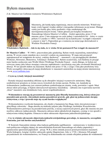 Byłem masonem Z dr. Maurice’em Cailletem rozmawia Włodzimierz Rędzioch Fot. Archiwum prywatne Masonerię, jak każdą tajną organizację, otacza aureola misterium. Wokół niej krąży wiele legend i trudno zdobyć wiarygodne informacje na jej temat. Dlatego cenny jest każdy głos, który pochodzi z tego zamkniętego dla niewtajemniczonych świata. Takim głosem jest książka-świadectwo francuskiego lekarza Maurice’a Cailleta – kiedyś agnostyka, przez 15 lat masona, przez 2 lata stojącego na czele jednej z masońskich lóż – który w czasie pobytu w Lourdes w 1984 r. nawrócił się na katolicyzm i wystąpił z masonerii („mason w śnie”). Poprosiłem go o rozmowę na temat jego doświadczeń w Wielkim Wschodzie Francji. Włodzimierz Rędzioch: – Jak to się stało, że w wieku 36 lat postanowił Pan wstąpić do masonerii? Dr Maurice Caillet: – W 1968 r. pracowałem jako ginekolog. Byłem wtedy racjonalistą, materialistą i ateistą. W owym czasie starałem się o rozwód i czułem się osamotniony. W maju mój przyjaciel zaproponował mi wstąpienie do nowej „rodziny duchowej” – masonerii, z jej pociągającymi ideałami Wolności, Równości, Braterstwa, Tolerancji i Solidarności. Byłem oczarowany, tym bardziej że przyjął mnie bardzo serdecznie sam Wielki Mistrz Wielkiego Wschodu Francji – może dlatego, że byłem już wówczas znany jako lekarz stosujący sztuczne zapłodnienie i sterylizację oraz jako zwolennik liberalizacji aborcji. W ten sposób stałem się masonem. Byłem nim przez 15 lat, z czego 2 lata jako przełożony loży. Wiele szczegółów dotyczących mojej działalności w masonerii umieściłem na mojej stronie internetowej: www.cailletm.com. – Czym są rytuały inicjacji masońskiej? – Rytuały inicjacji masońskiej zbliżone są do obrzędów inicjacji wyznawców animizmu. Mają symbolizować przejście ze świata rzeczy świeckich do świata sacrum. Profan, tzn. kandydat na wolnomularza, poddawany jest czterem próbom symbolizującym ziemię, wodę, powietrze i ogień. Musi złożyć także przysięgę, iż będzie dotrzymywał tajemnicy masońskiej – zabrania ona wyjawiania nazwisk „braci” masonów oraz działalności loży, nawet współmałżonkowi. – Wolnomularze starają się prezentować masonerię jako filozofię humanistyczną, której celem jest poszukiwanie prawdy. Jak jednak można poszukiwać prawdy, gdy głosi się jednocześnie skrajny relatywizm, a więc i prawda staje się czymś bardzo względnym? – Wolnomularstwo wychwala humanizm, ale chodzi o humanizm bez Boga, który dowartościowuje i gloryfikuje człowieka – Boga określa się niekiedy jedynie jako Wielkiego Architekta Wszechświata. Wolnomularstwo poświęca się poszukiwaniu prawdy, a raczej częściowych prawd, gdyż dla masona nie jest możliwe odkrycie żadnej prawdy. Masoneria odrzuca także jakiekolwiek dogmaty, czyniąc w ten sposób z relatywizmu rodzaj dogmatu. Oznacza to także odrzucenie objawienia judeochrześcijańskiego. – Czy to właśnie odrzucenie objawienia judeochrześcijańskiego powoduje, że masoneria, szczególnie francuska, jest tak bardzo antykatolicka? – W Kościele francuskim istnieje silna tradycja gallikańska (gallikanizm – zainicjowany w średniowieczu ruch polityczno-religijny dążący do uniezależnienia Kościoła francuskiego od władzy papieskiej i ograniczenia uprawnień papieskich – przyp. W.R.), która istniała jeszcze przed powstaniem masonerii. Wielu biskupów, książąt i królów odrzucało opiekę Magisterium. Gdy w 1738 r. Klemens XII potępił przynależność do wolnomularstwa, we Francji ta ekskomunika nie została oficjalnie podana do wiadomości ani przez państwo, ani przez Episkopat. W czasie rewolucji francuskiej w 1789 r. duchowieństwo i arystokracja stały się kozłem ofiarnym władz rewolucyjnych – większość księży zostało zamordowanych lub skazanych na wygnanie. Po okresie względnego spokoju, w latach 1895-1905, Kościół francuski znowu był prześladowany przez rządy masońskie, aż do definitywnego rozdziału Kościoła od państwa, co nastąpiło w 1905 r. Z kolei rząd Vichy (kolaborujący z nazistowskimi Niemcami rząd Philippe’a Pétaina z siedzibą w mieście Vichy – przyp. W. R.), począwszy od 1940 r., prześladował masonów, którzy byli oddawani w ręce policji, więzieni i często wywożeni do Niemiec. Wzajemna niechęć pozostaje wciąż żywa, tym bardziej że w 1983 r. kard. Joseph Ratzinger uznał, iż dla katolika przynależność do wolnomularstwa jest grzechem ciężkim, który nie pozwala na przyjmowanie Komunii św. (chodzi o dokument „Declaratio de associationibus massonicis”, wydany w 1983 r. przez Kongregację Nauki Wiary, której prefektem był kard. Joseph Ratzinger – przyp. W. R.). – Masoni składają przysięgę, która zobowiązuje ich do wzajemnej pomocy. Jakie praktyczne konsekwencje ma ta przysięga? – Konsekwencje są różnorodne. Z punktu widzenia politycznego i społecznego wprowadza to pewien zamęt, który nie służy zdrowej demokracji. „Bracia” masoni przynależą zarówno do partii prawicowych, jak i lewicowych, lecz gdy chodzi o pewne kwestie społeczne – działają razem w tajemnicy, aby wprowadzać ustawy dotyczące np. antykoncepcji, aborcji, rozwodów, „małżeństw” osób tej samej płci, adopcji dzieci przez homoseksualistów, eutanazji czy manipulacji ludzkimi embrionami. Z punktu widzenia gospodarczego niektóre prace zarezerwowane są w pierwszym rzędzie dla ludzi należących do masonerii, a to dzięki kontaktom w loży, a szczególnie w bractwach (les Fraternelles), które skupiają masonów określonej gałęzi działalności, np. Bractwo Budownictwa i Robót Publicznych. Gdy chodzi o wymiar sprawiedliwości, spotykamy się z różnymi formami faworyzowania, jeżeli osoba osądzana należy do masonerii. Masoni odgrywają dużą rolę w świecie kultury, szczególnie w mediac