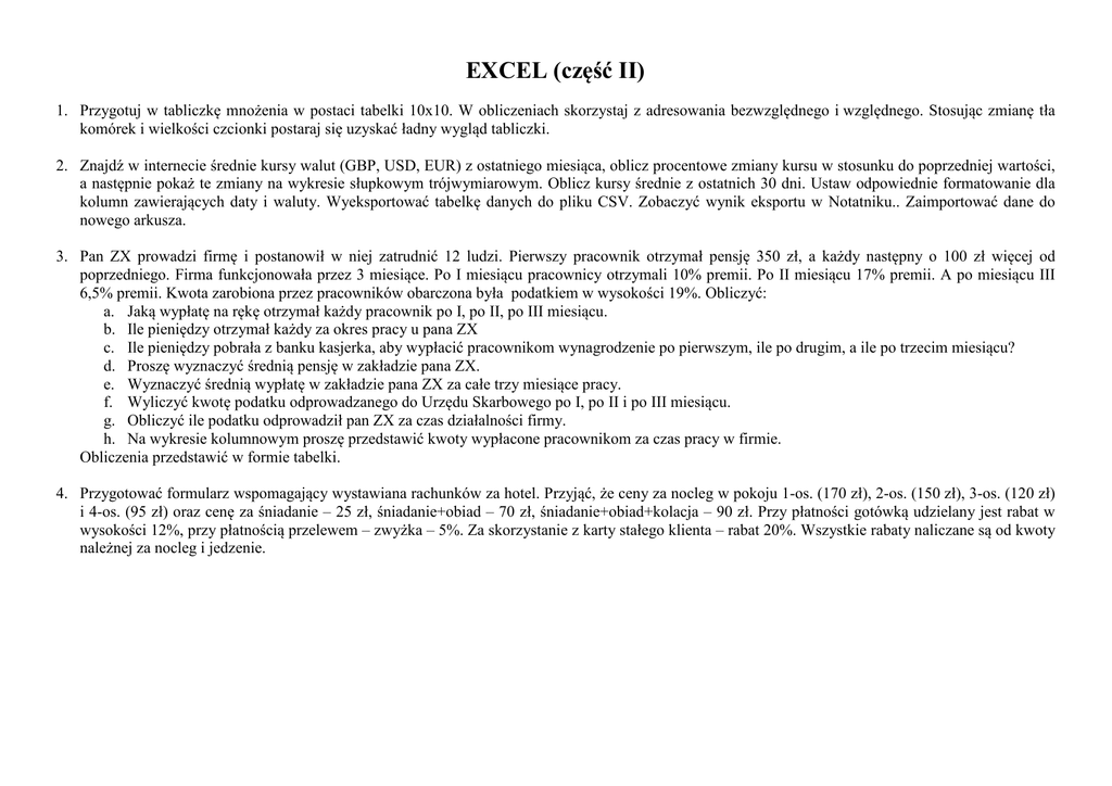 EXCEL (część II) 1. Przygotuj w tabliczkę mnożenia w postaci tabelki 10x10. W obliczeniach skorzystaj z adresowania bezwzględnego i względnego. Stosując zmianę tła komórek i wielkości czcionki postaraj się uzyskać ładny wygląd tabliczki. 2. Znajdź w internecie średnie kursy walut (GBP, USD, EUR) z ostatniego miesiąca, oblicz procentowe zmiany kursu w stosunku do poprzedniej wartości, a następnie pokaż te zmiany na wykresie słupkowym trójwymiarowym. Oblicz kursy średnie z ostatnich 30 dni. Ustaw odpowiednie formatowanie dla kolumn zawierających daty i waluty. Wyeksportować tabelkę danych do pliku CSV. Zobaczyć wynik eksportu w Notatniku.. Zaimportować dane do nowego arkusza. 3. Pan ZX prowadzi firmę i postanowił w niej zatrudnić 12 ludzi. Pierwszy pracownik otrzymał pensję 350 zł, a każdy następny o 100 zł więcej od poprzedniego. Firma funkcjonowała przez 3 miesiące. Po I miesiącu pracownicy otrzymali 10% premii. Po II miesiącu 17% premii. A po miesiącu III 6,5% premii. Kwota zarobiona przez pracowników obarczona była podatkiem w wysokości 19%. Obliczyć: a. Jaką wypłatę na rękę otrzymał każdy pracownik po I, po II, po III miesiącu. b. Ile pieniędzy otrzymał każdy za okres pracy u pana ZX c. Ile pieniędzy pobrała z banku kasjerka, aby wypłacić pracownikom wynagrodzenie po pierwszym, ile po drugim, a ile po trzecim miesiącu? d. Proszę wyznaczyć średnią pensję w zakładzie pana ZX. e. Wyznaczyć średnią wypłatę w zakładzie pana ZX za całe trzy miesiące pracy. f. Wyliczyć kwotę podatku odprowadzanego do Urzędu Skarbowego po I, po II i po III miesiącu. g. Obliczyć ile podatku odprowadził pan ZX za czas działalności firmy. h. Na wykresie kolumnowym proszę przedstawić kwoty wypłacone pracownikom za czas pracy w firmie. Obliczenia przedstawić w formie tabelki. 4. Przygotować formularz wspomagający wystawiana rachunków za hotel. Przyjąć, że ceny za nocleg w pokoju 1-os. (170 zł), 2-os. (150 zł), 3-os. (120 zł) i 4-os. (95 zł) oraz cenę za śniadanie – 25 zł, śniadanie+obiad – 70 zł, śniadanie+obiad+kolacja – 90 zł. Przy płatności gotówką udzielany jest rabat w wysokości 12%, przy płatnością przelewem – zwyżka – 5%. Za skorzystanie z karty stałego klienta – rabat 20%. Wszystkie rabaty naliczane są od kwoty należnej za nocleg i jedzenie. W pierwszej kolejności należy utworzyć formularz według poniższego rysunku. Pomocny będzie pasek narzędziowy Formularze. Następnie należy przygotować w tym samym arkuszu cenniki wg poniższego wzoru: Ustawić dla pól kombi odpowiednie Zakresy wyjściowe oraz poprzez Łącze komórki wskazać komórkę w której otrzymamy wynik wyboru. W polu Cena formularza należy wpisać formułę, korzystając z funkcji Przesunięcie, ustawiając Odwołanie – na komórkę z napisem Cena, Wiersze – na Łącze komórki odpowiedniego pola kombi (wynik wyboru), Kolumny – na 0. W ten sposób wskazujemy, aby Excel pobrał wartość z komórki przesuniętej względem komórki z napisem Cena o zadaną liczbę wierszy. Wymnażając liczbę noclegów i otrzymaną cenę pokoju oraz dodając cenę wyżywienia otrzymamy wartość usługi, od której naliczane są rabaty. Aby uwzględnić rabaty należy skorzystać z funkcji JEŻELI, która pozwala wykonać stosowne obliczenia w zależności od spełnienia warunku. 5. * Wpisz do tabeli dane kilku swoich znajomych (imiona, nazwiska oraz daty urodzin). Podaj formułę, która liczy liczbę dni od dnia dzisiejszego do ich najbliższych urodzin. Stosując formatowanie warunkowe (Menu ▬►Format ▬►Formatowanie warunkowe), zmień kolor tła komórek, gdzie do najbliższych rodzin zostało mniej niż 90 dni. Posortuj listę osób alfabetycznie. Wskaż sposoby filtrowania listy (np. nazwiska na K)