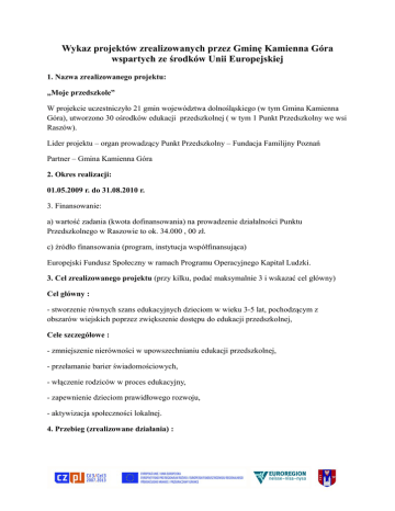 Wykaz projektów zrealizowanych przez Gminę Kamienna Góra wspartych ze środków Unii Europejskiej 1. Nazwa zrealizowanego projektu: „Moje przedszkole” W projekcie uczestniczyło 21 gmin województwa dolnośląskiego (w tym Gmina Kamienna Góra), utworzono 30 ośrodków edukacji przedszkolnej ( w tym 1 Punkt Przedszkolny we wsi Raszów). Lider projektu – organ prowadzący Punkt Przedszkolny – Fundacja Familijny Poznań Partner – Gmina Kamienna Góra 2. Okres realizacji: 01.05.2009 r. do 31.08.2010 r. 3. Finansowanie: a) wartość zadania (kwota dofinansowania) na prowadzenie działalności Punktu Przedszkolnego w Raszowie to ok. 34.000 , 00 zł. c) źródło finansowania (program, instytucja współfinansująca) Europejski Fundusz Społeczny w ramach Programu Operacyjnego Kapitał Ludzki. 3. Cel zrealizowanego projektu (przy kilku, podać maksymalnie 3 i wskazać cel główny) Cel główny : - stworzenie równych szans edukacyjnych dzieciom w wieku 3-5 lat, pochodzącym z obszarów wiejskich poprzez zwiększenie dostępu do edukacji przedszkolnej, Cele szczegółowe : - zmniejszenie nierówności w upowszechnianiu edukacji przedszkolnej, - przełamanie barier świadomościowych, - włączenie rodziców w proces edukacyjny, - zapewnienie dzieciom prawidłowego rozwoju, - aktywizacja społeczności lokalnej. 4. Przebieg (zrealizowane działania) : Wykaz projektów zrealizowanych przez Gminę Kamienna Góra wspartych ze środków Unii Europejskiej W ramach przedmiotowego projektu utworzony został Punkt Przedszkolny w świetlicy wiejskiej w Raszowie. Do zadań gminy w okresie trwania projektu należało zapewnienie bazy pod działalność przedszkolną i pokrycie kosztów utrzymania pomieszczenia świetlicy wiejskiej (energia, woda, ogrzewanie, sprzątanie etc.). Punkt przedszkolny funkcjonował w okresie od maja 2009 r. do sierpnia 2010 r. Zajęcia w prowadzone były przez wykwalifikowaną kadrę pedagogiczną , pięć dni w tygodniu od poniedziałku do piątku /w wymiarze 20 h – tygodniowo/. Nauczyciel w swojej pracy wspomagany był przez dodatkowego pracownika tzw. pomoc nauczyciela. Ponadto zapewnione zostało dodatkowe wsparcie w postaci konsultacji i opieki psychologicznej i logopedycznej. Punkt przedszkolny wyposażony został w meble, zabawki, materiały plastyczne, pomoce dydaktyczne. 5. Grupa docelowa, ilość uczestników (w przypadku działań społecznych) Wsparciem zostało objętych ok. 20 os. (dzieci w wieku 3-5 lat) z terenu Gminy Kamienna Góra. Wykaz projektów zrealizowanych przez Gminę Kamienna Góra wspartych ze środków Unii Europejskiej Przykład dobrej praktyki w Gminie Kamienna Góra województwo:dolnośląskie / : Projekt pt."Dajmy sobie szansę na rozwój". Okres realizacji projektu : od 01.01.2013 r. do 31.01.2014 r. Źródła finansowania : Projekt dofinansowany z Europejskiego Funduszu Społecznego w ramach środków pochodzących z Programu Operacyjnego Kapitał Ludzki. Kwota dofinansowania : 78.000,00 PLN Beneficjent : Gmina Kamienna Góra Grupy docelowe (instytucje objęte wsparciem, uczestnicy) : Projekt realizowany w Publicznej Szkole Podstawowej w Ptaszkowie. Projekt skierowany do dzieci (uczniów klas 1-6 szkoły podstawowej) Liczba uczestników projektu : 90 osób Cele projektu (cel główny) : Wzrost jakości i atrakcyjności zajęć oraz poszerzenie oferty edukacyjnej szkoły. Cele szczegółowe : zwiększenie dostępu do zajęć pozalekcyjnych i pozaszkolnych, zgodnie z indywidualnymi potrzebami i możliwosciami edukacyjnymi, rozwojowymi oraz zainteresowaniami, wzrost jakości nauczania oraz atrakcyjności zajęć poprzez wdrożenie w PSP w Ptaszkowie interaktywnych pomocy/ metod dydaktycznych, poprawa wyników nauczania i zmniejszenia deficytów rozwojowych, zwiększenie dostępności wyjazdów na wycieczki dydaktyczne i turystycznokrajoznawcze. Realizowane działania : 1. Zajęcia dydaktyczno-wyrównawcze i specjalistyczne : - zajęcia wyrównawcze z matematyki pt. "Nie taka matma straszna" – zajęcia pozwalające nadrobić braki wiadomości i umiejętności w matematyce, a także pozwalające na uzyskanie lepszych wyników w nauce - zajęcia z matematyki pt. "Dam radę matmie" - zajęcia "Ortograffiti z Bartkiem" – przeznaczone dla dyslektyków i dzieci zagrożonych dysleksją - zajęcia z języka polskiego "Od czytania do pisania"- rozwiązywanie problemów czytania ze zrozumieniem, interpretowania tekstu, wszukiwania wypowiedzi itd. Wykaz projektów zrealizowanych przez Gminę Kamienna Góra wspartych ze środków Unii Europejskiej - zajęcia tearpeutyczne, - zajęcia wyrównawcze z języka niemieckiego, 2. Koła zainteresowań: - Matematyczne łamanie głowy", - zajęcia humanistyczno-dziennikarskie, - zajęcia z j.angielskiego, - zajęcia "komputer i ja", - zajęcia przyrodnicze z elementami turystyki i krajoznastwa", Wykaz projektów zrealizowanych przez Gminę Kamienna Góra wspartych ze środków Unii Europejskiej 1) 2) 3) 4) 5) 6) 7) Beneficjent : Fundacja Pomocy Dzieciom i Młodzieży SALVATOR z Wałbrzycha Partner projektu : Gmina Kamienna Góra Tytuł projektu : „Dziecięce liczenie- edukacja matematyczna od przedszkola” Wartość projektu/kwota dofinansowania : 49 600,00 zł Okres realizacji – 01.10.2010 – 30.03.2011 Źródła finansowania : Projekt dofinansowany z Europejskiego Funduszu Społecznego w ramach środków pochodzących z Programu Operacyjnego Kapitał Ludzki. 8) Działanie IX – Rozwój wykształcenia i kompetencji w regionach 9) Działanie 9.5 – Oddolne inicjatywy edukacyjne na terenach wiejskich Priorytet IX – Rozwój wykształcenia i kompetencji w regionach 10) Realizowane działania : 11) W ramach projektu skierowano wsparcie do dzieci 45 dzieci w wieku 3-5 lat z trzech punktów przedszkolnych: w Pisarzowicach, Czadrowie i Krzeszowie oraz ich rodziców. W czasie dodatkowych godziny zajęć (380h) realizowano edukację matematyczną dla przedszkolaków. Nauczyciele prowadzący te zaję