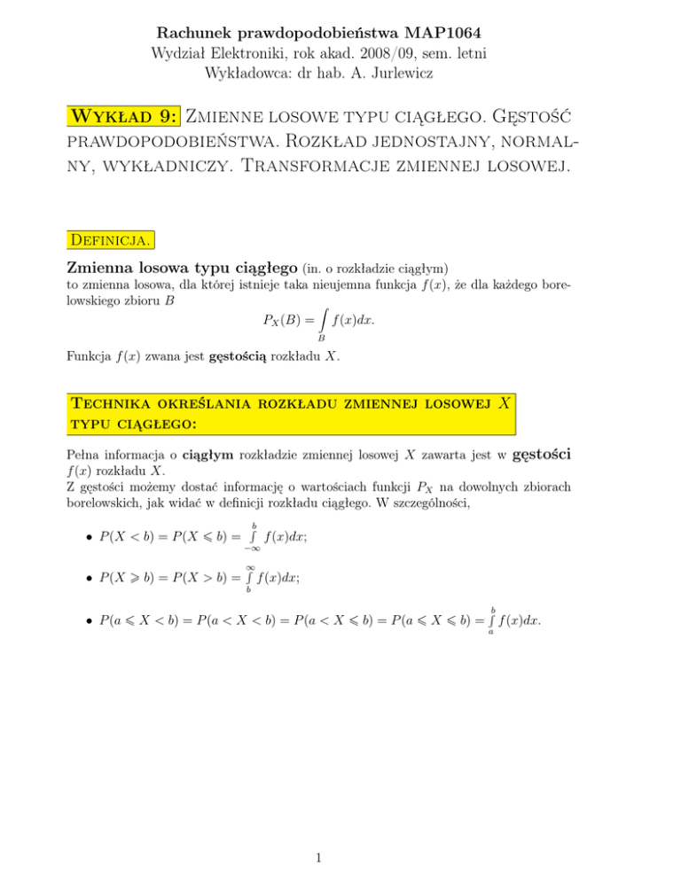 Wykład 9: Zmienne losowe typu ciągłego. Gęstość