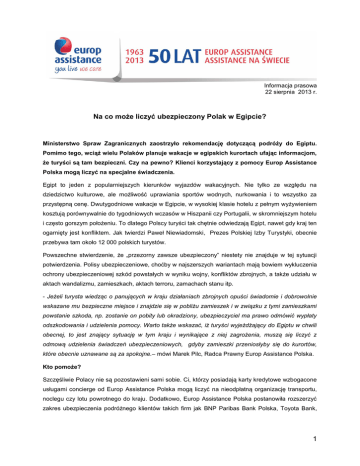 Informacja prasowa 22 sierpnia 2013 r. Na co może liczyć ubezpieczony Polak w Egipcie? Ministerstwo Spraw Zagranicznych zaostrzyło rekomendację dotyczącą podróży do Egiptu. Pomimo tego, wciąż wielu Polaków planuje wakacje w egipskich kurortach ufając informacjom, że turyści są tam bezpieczni. Czy na pewno? Klienci korzystający z pomocy Europ Assistance Polska mogą liczyć na specjalne świadczenia. Egipt to jeden z popularniejszych kierunków wyjazdów wakacyjnych. Nie tylko ze względu na dziedzictwo kulturowe, ale możliwość uprawiania sportów wodnych, nurkowania i to wszystko za przystępną cenę. Dwutygodniowe wakacje w Egipcie, w wysokiej klasie hotelu z pełnym wyżywieniem kosztują porównywalnie do tygodniowych wczasów w Hiszpanii czy Portugalii, w skromniejszym hotelu i często gorszym położeniu. To dlatego Polscy turyści tak chętnie odwiedzają Egipt, nawet gdy kraj ten ogarnięty jest konfliktem. Jak twierdzi Paweł Niewiadomski, Prezes Polskiej Izby Turystyki, obecnie przebywa tam około 12 000 polskich turystów. Powszechne stwierdzenie, że „przezorny zawsze ubezpieczony” niestety nie znajduje w tej sytuacji potwierdzenia. Polisy ubezpieczeniowe, choćby w najszerszych wariantach mają bowiem wykluczenia ochrony ubezpieczeniowej szkód powstałych w wyniku wojny, konfliktów zbrojnych, a także udziału w aktach wandalizmu, zamieszkach, aktach terroru, zamachach stanu itp. - Jeżeli turysta wiedząc o panujących w kraju działaniach zbrojnych opuści świadomie i dobrowolnie wskazane mu bezpieczne miejsce i znajdzie się w pobliżu zamieszek i w związku z tymi zamieszkami powstanie szkoda, np. zostanie on pobity lub okradziony, ubezpieczyciel ma prawo odmówić wypłaty odszkodowania i udzielenia pomocy. Warto także wskazać, iż turyści wyjeżdżający do Egiptu w chwili obecnej, to jest znający sytuację w tym kraju i wynikające z niej zagrożenia, muszą się liczyć z odmową udzielenia świadczeń ubezpieczeniowych, gdyby zamieszki przeniosłyby się do kurortów, które obecnie uznawane są za spokojne.– mówi Marek Pilc, Radca Prawny Europ Assistance Polska. Kto pomoże? Szczęśliwie Polacy nie są pozostawieni sami sobie. Ci, którzy posiadają karty kredytowe wzbogacone usługami concierge od Europ Assistance Polska mogą liczyć na nieodpłatną organizację transportu, noclegu czy lotu powrotnego do kraju. Dodatkowo, Europ Assistance Polska postanowiła rozszerzyć zakres ubezpieczenia podróżnego klientów takich firm jak BNP Paribas Bank Polska, Toyota Bank, 1 Informacja prasowa 22 sierpnia 2013 r. BRE Ubezpieczenia, Citi Handlowy. Turyści ubezpieczeni za pośrednictwem tych firm mogą liczyć dodatkowo na takie świadczenia jak: Całodobowa infolinia o sytuacji w poszczególnych regionach Egiptu Nieodpłatna organizacja powrotu do kraju Nieodpłatna organizacja bezpiecznego transportu na lotnisko Nieodpłatna organizacja noclegu w bezpiecznym miejscu Pod całodobowym numerem telefonu do Centrum Alarmowego wskazanym w polisie ubezpieczeniowej, turyści mogą liczyć na pomoc profesjonalnych Koordynatorów, którzy zadbają o ich bezpieczeństwo. Więcej informacji udzieli: Małgorzata Morańska PR & Marketing Specialist Tel. 0-22 205 50 15 E-mail: [email protected] Grupa Europ Assistance, twórca idei assistance i założyciel tej branży na świecie, powstała w 1963 roku. Dziś jest jednym z liderów w zakresie kompleksowych usług assistance - niesienia natychmiastowej pomocy przez 24 godziny na dobę, 7 dni w tygodniu, w każdym miejscu na świecie. Corocznie Grupa Europ Assistance interweniowała w ponad 11 milionach spraw, w 208 krajach na 5 kontynentach. Działalność Grupy Europ Assistance obejmuje szeroko rozumianą pomoc assistance przede wszystkim w czterech dziedzinach: Podróż, Zdrowie, Samochód, Dom i Rodzina. Jednym z priorytetowych obszarów jej wzrostu jest stałe rozszerzanie palety usług z zakresu assistance medycznego, uwzględniających zmieniające się preferencje klientów oraz trendy społecznodemograficzne, wynikające m.in. z postępującej urbanizacji, wzrostu mobilności społeczeństwa oraz rosnącej średniej długości życia. Więcej informacji na temat Europ Assistance można znaleźć na stronach: www.europ-assistance.com www.europ-assistance.pl 2