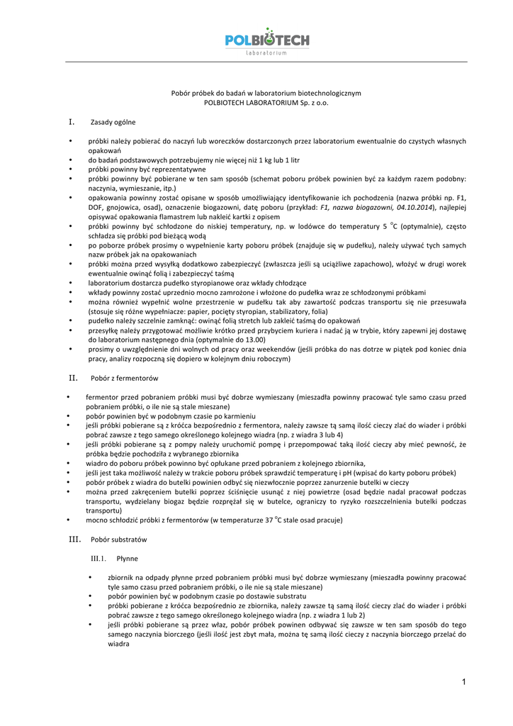 Pobór próbek do badań w laboratorium biotechnologicznym POLBIOTECH LABORATORIUM Sp. z o.o. I. • • • • • • • • • • • • • • Zasady ogólne próbki należy pobierać do naczyń lub woreczków dostarczonych przez laboratorium ewentualnie do czystych własnych opakowań do badań podstawowych potrzebujemy nie więcej niż 1 kg lub 1 litr próbki powinny być reprezentatywne próbki powinny być pobierane w ten sam sposób (schemat poboru próbek powinien być za każdym razem podobny: naczynia, wymieszanie, itp.) opakowania powinny zostać opisane w sposób umożliwiający identyfikowanie ich pochodzenia (nazwa próbki np. F1, DOF, gnojowica, osad), oznaczenie biogazowni, datę poboru (przykład: F1, nazwa biogazowni, 04.10.2014), najlepiej opisywać opakowania flamastrem lub nakleić kartki z opisem o próbki powinny być schłodzone do niskiej temperatury, np. w lodówce do temperatury 5 C (optymalnie), często schładza się próbki pod bieżącą wodą po poborze próbek prosimy o wypełnienie karty poboru próbek (znajduje się w pudełku), należy używać tych samych nazw próbek jak na opakowaniach próbki można przed wysyłką dodatkowo zabezpieczyć (zwłaszcza jeśli są uciążliwe zapachowo), włożyć w drugi worek ewentualnie owinąć folią i zabezpieczyć taśmą laboratorium dostarcza pudełko styropianowe oraz wkłady chłodzące wkłady powinny zostać uprzednio mocno zamrożone i włożone do pudełka wraz ze schłodzonymi próbkami można również wypełnić wolne przestrzenie w pudełku tak aby zawartość podczas transportu się nie przesuwała (stosuje się różne wypełniacze: papier, pocięty styropian, stabilizatory, folia) pudełko należy szczelnie zamknąć: owinąć folią stretch lub zakleić taśmą do opakowań przesyłkę należy przygotować możliwie krótko przed przybyciem kuriera i nadać ją w trybie, który zapewni jej dostawę do laboratorium następnego dnia (optymalnie do 13.00) prosimy o uwzględnienie dni wolnych od pracy oraz weekendów (jeśli próbka do nas dotrze w piątek pod koniec dnia pracy, analizy rozpoczną się dopiero w kolejnym dniu roboczym) II. • • • • • • • • • III. Pobór z fermentorów fermentor przed pobraniem próbki musi być dobrze wymieszany (mieszadła powinny pracować tyle samo czasu przed pobraniem próbki, o ile nie są stale mieszane) pobór powinien być w podobnym czasie po karmieniu jeśli próbki pobierane są z króćca bezpośrednio z fermentora, należy zawsze tą samą ilość cieczy zlać do wiader i próbki pobrać zawsze z tego samego określonego kolejnego wiadra (np. z wiadra 3 lub 4) jeśli próbki pobierane są z pompy należy uruchomić pompę i przepompować taką ilość cieczy aby mieć pewność, że próbka będzie pochodziła z wybranego zbiornika wiadro do poboru próbek powinno być opłukane przed pobraniem z kolejnego zbiornika, jeśli jest taka możliwość należy w trakcie poboru próbek sprawdzić temperaturę i pH (wpisać do karty poboru próbek) pobór próbek z wiadra do butelki powinien odbyć się niezwłocznie poprzez zanurzenie butelki w cieczy można przed zakręceniem butelki poprzez ściśnięcie usunąć z niej powietrze (osad będzie nadal pracował podczas transportu, wydzielany biogaz będzie rozprężał się w butelce, ograniczy to ryzyko rozszczelnienia butelki podczas transportu) o mocno schłodzić próbki z fermentorów (w temperaturze 37 C stale osad pracuje) Pobór substratów III.1. Płynne • zbiornik na odpady płynne przed pobraniem próbki musi być dobrze wymieszany (mieszadła powinny pracować tyle samo czasu przed pobraniem próbki, o ile nie są stale mieszane) • pobór powinien być w podobnym czasie po dostawie substratu • próbki pobierane z króćca bezpośrednio ze zbiornika, należy zawsze tą samą ilość cieczy zlać do wiader i próbki pobrać zawsze z tego samego określonego kolejnego wiadra (np. z wiadra 1 lub 2) • jeśli próbki pobierane są przez właz, pobór próbek powinen odbywać się zawsze w ten sam sposób do tego samego naczynia biorczego (jeśli ilość jest zbyt mała, można tę samą ilość cieczy z naczynia biorczego przelać do wiadra 1 • • • III.2. wiadro lub naczynie do poboru próbek powinno być opłukane przed pobraniem z kolejnego zbiornika jeśli jest taka możliwość należy w trakcie poboru próbek sprawdzić temperaturę i pH (wpisać do karty poboru próbek) pobór próbek do butelki powinien odbyć się niezwłocznie po poborze ze zbiornika poprzez zanurzenie butelki w cieczy lub nalanie z naczynia biorczego Stałe • • • • odpady stałe ze względu na ich różnorodność muszą być pobierane w taki sposób aby zapewnić reprezentatywność próbki jeżeli struktura odpadu w przechowywanym miejscu jest różnorodna, należy pobrać do naczynia kilka próbek z różnych miejsc (pryzmy, zasobnika, płyty) po wymieszaniu napełnić worek lub butelkę odpowiednią ilością jeśli odpad podlega przed podaniem zmieleniu, prosimy o pobranie próbki w takim stanie pobór powinien być w podobnym czasie po dostawie substratu, jeśli jest taka możliwość należy w trakcie poboru próbek sprawdzić temperaturę i pH (wpisać do karty poboru próbek) 2