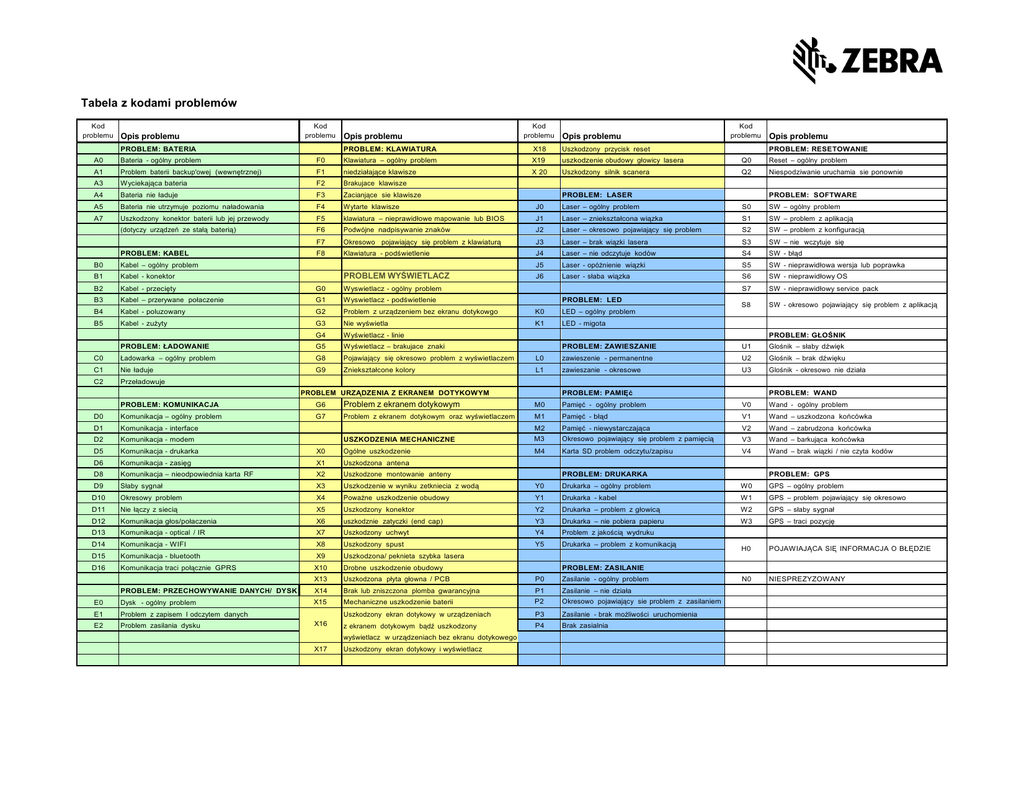 Tabela z kodami problemów Kod problemu Opis problemu Kod problemu PROBLEM: BATERIA Opis problemu Kod problemu Opis problemu PROBLEM: KLAWIATURA X18 Uszkodzony przycisk reset Kod problemu Opis problemu PROBLEM: RESETOWANIE A0 Bateria - ogólny problem F0 Klawiatura – ogólny problem X19 uszkodzenie obudowy głowicy lasera Q0 Reset – ogólny problem A1 Problem baterii backup'owej (wewnętrznej) F1 niedziałające klawisze X 20 Uszkodzony silnik scanera Q2 Niespodziwanie uruchamia sie ponownie A3 Wyciekająca bateria F2 Brakujace klawisze A4 Bateria nie ładuje F3 Zacianjące sie klawisze A5 Bateria nie utrzymuje poziomu naładowania F4 Wytarte klawisze J0 Laser – ogólny problem S0 SW – ogólny problem A7 Uszkodzony konektor baterii lub jej przewody F5 klawiatura – nieprawidłowe mapowanie lub BIOS J1 Laser – zniekształcona wiązka S1 SW – problem z aplikacją (dotyczy urządzeń ze stałą baterią) F6 Podwójne nadpisywanie znaków J2 Laser – okresowo pojawiający się problem S2 SW – problem z konfiguracją F7 Okresowo pojawiający się problem z klawiaturą J3 Laser – brak wiązki lasera S3 SW – nie wczytuje się F8 Klawiatura - podświetlenie J4 Laser – nie odczytuje kodów S4 SW - błąd J5 Laser - opóżnienie wiązki S5 SW - nieprawidłowa wersja lub poprawka J6 Laser - słaba wiązka S6 SW - nieprawidłowy OS S7 SW - nieprawidłowy service pack S8 SW - okresowo pojawiający się problem z aplikacją PROBLEM: KABEL PROBLEM: LASER B0 Kabel – ogólny problem B1 Kabel - konektor B2 Kabel - przecięty G0 Wyswietlacz - ogólny problem B3 Kabel – przerywane połaczenie G1 Wyswietlacz - podświetlenie B4 Kabel - poluzowany G2 Problem z urządzeniem bez ekranu dotykowgo K0 LED – ogólny problem B5 Kabel - zużyty G3 Nie wyświetla K1 LED - migota G4 Wyświetlacz - linie PROBLEM: ŁADOWANIE G5 Wyświetlacz – brakujace znaki C0 Ładowarka – ogólny problem G8 Pojawiający się okresowo problem z wyświetlaczem C1 Nie ładuje G9 Zniekształcone kolory C2 Przeładowuje PROBLEM WYŚWIETLACZ PROBLEM: LED PROBLEM: SOFTWARE PROBLEM: GŁOŚNIK PROBLEM: ZAWIESZANIE U1 Glośnik – słaby dźwięk L0 zawieszenie - permanentne U2 Glośnik – brak dźwięku L1 zawieszanie - okresowe U3 Glośnik - okresowo nie działa PROBLEM URZĄDZENIA Z EKRANEM DOTYKOWYM PROBLEM: PAMIĘć PROBLEM: WAND PROBLEM: KOMUNIKACJA G6 Problem z ekranem dotykowym M0 Pamięć - ogólny problem V0 Wand - ogólny problem D0 Komunikacja – ogólny problem G7 Problem z ekranem dotykowym oraz wyświetlaczem M1 Pamięć - błąd V1 Wand – uszkodzona końcówka D1 Komunikacja - interface M2 Pamięć - niewystarczająca V2 Wand – zabrudzona końcówka D2 Komunikacja - modem USZKODZENIA MECHANICZNE M3 Okresowo pojawiający się problem z pamięcią V3 Wand – barkująca końcówka D5 Komunikacja - drukarka X0 Ogólne uszkodzenie M4 Karta SD problem odczytu/zapisu V4 Wand – brak wiązki / nie czyta kodów D6 Komunikacja - zasięg X1 Uszkodzona antena D8 Komunikacja – nieodpowiednia karta RF X2 Uszkodzone montowanie anteny D9 Słaby sygnał X3 Uszkodzenie w wyniku zetkniecia z wodą Y0 Drukarka – ogólny problem W0 GPS – ogólny problem D10 Okresowy problem X4 Poważne uszkodzenie obudowy Y1 Drukarka - kabel W1 GPS – problem pojawiający się okresowo D11 Nie łączy z siecią X5 Uszkodzony konektor Y2 Drukarka – problem z głowicą W2 GPS – słaby sygnał D12 Komunikacja głos/połaczenia X6 uszkodznie zatyczki (end cap) Y3 Drukarka – nie pobiera papieru W3 GPS – traci pozycję D13 Komunikacja - optical / IR X7 Uszkodzony uchwyt Y4 Problem z jakością wydruku D14 Komunikacja - WIFI X8 Uszkodzony spust Y5 Drukarka – problem z komunikacją D15 Komunikacja - bluetooth X9 Uszkodzona/ peknieta szybka lasera H0 POJAWIAJĄCA SIĘ INFORMACJA O BŁĘDZIE D16 Komunikacja traci połącznie GPRS N0 NIESPREZYZOWANY PROBLEM: DRUKARKA X10 Drobne uszkodzenie obudowy X13 Uszkodzona płyta głowna / PCB P0 Zasilanie - ogólny problem PROBLEM: PRZECHOWYWANIE DANYCH/ DYSK X14 Brak lub zniszczona plomba gwarancyjna P1 Zasilanie – nie działa E0 Dysk - ogólny problem X15 Mechaniczne uszkodzenie baterii P2 Okresowo pojawiający sie problem z zasilaniem E1 Problem z zapisem I odczytem danych Uszkodzony ekran dotykowy w urządzeniach P3 Zasilanie - brak możliwości uruchomienia E2 Problem zasilania dysku z ekranem dotykowym bądź uszkodzony P4 Brak zasialnia X16 wyświetlacz w urządzeniach bez ekranu dotykowego X17 Uszkodzony ekran dotykowy i wyświetlacz PROBLEM: GPS PROBLEM: ZASILANIE