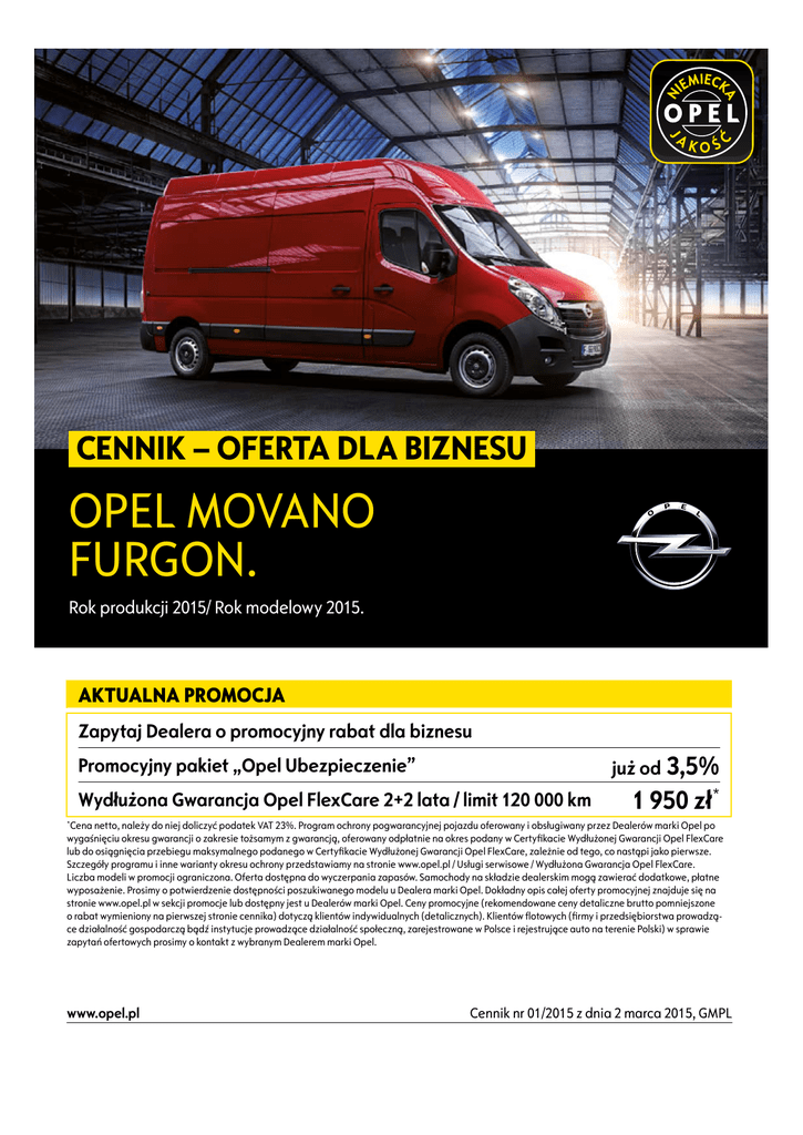 CENNIK – OFERTA DLA BIZNESU OPEL MOVANO FURGON. Rok produkcji 2015/ Rok modelowy 2015. AKTUALNA PROMOCJA Zapytaj Dealera o promocyjny rabat dla biznesu już od 3,5% Promocyjny pakiet „Opel Ubezpieczenie” Wydłużona Gwarancja Opel FlexCare 2+2 lata / limit 120 000 km 1 950 zł* Cena netto, należy do niej doliczyć podatek VAT 23%. Program ochrony pogwarancyjnej pojazdu oferowany i obsługiwany przez Dealerów marki Opel po wygaśnięciu okresu gwarancji o zakresie tożsamym z gwarancją, oferowany odpłatnie na okres podany w Certyfikacie Wydłużonej Gwarancji Opel FlexCare lub do osiągnięcia przebiegu maksymalnego podanego w Certyfikacie Wydłużonej Gwarancji Opel FlexCare, zależnie od tego, co nastąpi jako pierwsze. Szczegóły programu i inne warianty okresu ochrony przedstawiamy na stronie www.opel.pl / Usługi serwisowe / Wydłużona Gwarancja Opel FlexCare. Liczba modeli w promocji ograniczona. Oferta dostępna do wyczerpania zapasów. Samochody na składzie dealerskim mogą zawierać dodatkowe, płatne wyposażenie. Prosimy o potwierdzenie dostępności poszukiwanego modelu u Dealera marki Opel. Dokładny opis całej oferty promocyjnej znajduje się na stronie www.opel.pl w sekcji promocje lub dostępny jest u Dealerów marki Opel. Ceny promocyjne (rekomendowane ceny detaliczne brutto pomniejszone o rabat wymieniony na pierwszej stronie cennika) dotyczą klientów indywidualnych (detalicznych). Klientów flotowych (firmy i przedsiębiorstwa prowadzące działalność gospodarczą bądź instytucje prowadzące działalność społeczną, zarejestrowane w Polsce i rejestrujące auto na terenie Polski) w sprawie zapytań ofertowych prosimy o kontakt z wybranym Dealerem marki Opel. * www.opel.pl Cennik nr 01/2015 z dnia 2 marca 2015, GMPL Cennik – Opel Movano Furgon z pojedynczą kabiną/z podwójną kabiną, rok produkcji 2015, rok modelowy 2015 Oferta dla biznesu (zł netto*) Modele i wersje 2.3 CDTI 110 KM** 2.3 CDTI 125 KM 2.3 CDTI 135 KM S/S 2.3 CDTI 150 KM MA6 2.3 CDTI 165 KM S/S zł netto* zł netto* zł netto* zł netto* zł netto* L1H1 FWD 2,8t M6 83 000 86 049 89 301 – 92 350 L1H1 FWD 3,3t M6/MA6 1 , 2 85 0333 88 0813 91 3333 –/103 3253 , 2 94 3823 L1H1 FWD 3,5t M6/MA6 1 , 2 86 6593 89 7073 92 9593 –/104 9513 , 2 96 0083 L1H2 FWD 2,8t M6 84 463 87 512 90 764 – 93 813 L1H2 FWD 3,3t M6/MA6 1 , 2 86 4963 89 5453 92 7973 –/104 7893 , 2 95 8463 L1H2 FWD 3,5t M6/MA6 1 88 1223 91 1713 94 4233 99 0983 97 4723 L2H2 FWD 3,3t M6/MA6 1 87 3093 90 3583 93 6103 98 2853 96 6593 L2H2 FWD 3,5t M6/MA6 1 88 9353 91 9843 95 2363 99 9113 98 2853 L2H3 FWD 3,3t M6/MA6 1 89 748 92 797 96 049 100 724 99 098 L2H3 FWD 3,5t M6/MA6 1 91 374 94 423 97 675 102 350 100 724 L3H2 FWD 3,5t M6/MA6 1 90 3983 93 4473 96 6993 101 3743 99 7483 L3H3 FWD 3,5t M6/MA6 1 92 837 95 886 99 138 103 813 102 187 L3H2 RWD SW 3,5t M6 – 97 0653 98 8543 – 101 8213 L3H2 RWD TW 3,5t M6 – 98 6913 100 4803 – 103 4473 L3H3 RWD TW 3,5t M6 – 101 130 102 919 – 105 886 L4H2 RWD SW 3,5t M6 – – 100 886 – 103 935 L4H2 RWD TW 3,5t M6 – 100 805 102 593 – 105 561 L4H2 RWD TW 4,5t M6 – 105 683 107 472 – 110 439 L4H3 RWD TW 3,5t M6 – 103 244 105 033 – 108 000 L4H3 RWD TW 4,5t M6 – 108 122 109 911 – 112 878 L – dostępne długości nadwozia: 1 = krótka, 2 = średnia, 3 = długa, 4 = przedłużona H – dostępne wysokości nadwozia: 1 = niska, 2 = średnia, 3 = wysoka FWD = napęd na przednie koła RWD = napęd na tylne koła SW = pojedyncze koła na osi tylnej TW = podwójne koła na osi tylnej MA6 = 6-biegowa zautomatyzowana skrzynia biegów: dopłata 4 878 zł jako opcja z silnikiem 125 KM, wyposażenie standardowe dla wersji 150 KM. Silniki ze skrzynią zautomatyzowaną dostępne tylko i wyłącznie w wersji z podwójną kabiną 3) Model dostępny z podwójną kabiną (patrz: drugi rząd siedzeń): dopłata 7 317 zł 1) 2) * Wszystkie ceny zawarte w niniejszym cenniku są rekomendowanymi cenami netto, należy do nich doliczyć podatek VAT 23%. Liczba modeli w promocji ograniczona. Oferta dostępna do wyczerpania zapasów. Samochody na składzie dealerskim mogą zawierać dodatkowe, płatne wyposażenie. Prosimy o potwierdzenie dostępności poszukiwanego modelu u Dealera marki Opel. Dokładny opis całej oferty promocyjnej znajduje się na stronie www.opel.pl w sekcji promocje lub dostępny jest u Dealerów marki Opel. Ceny promocyjne dotyczą klientów indywidualnych (detalicznych). Klientów flotowych (firmy i przedsiębiorstwa prowadzące działalność gospodarczą bądź instytucje prowadzące działalność społeczną, zarejestrowane w Polsce i rejestrujące auto na terenie Polski)prosimy o kontakt z wybranym Dealerem marki Opel. . Dane techniczne silników Skrzynie biegów Pojemność skokowa, cm3 Moc maksymalna, kW/KM przy obr./min Maks. moment obrotowy, Nm przy obr./min Norma emisji spalin Zużycie paliwa, cykl mieszany, l/100 km* Emisja CO2, cykl mieszany, g/km* Obowiązkowe przeglądy okresowe 2.3 CDTI 110 KM (S/S)** 2.3 CDTI 125 KM 2.3 CDTI BiTurbo 135 KM S/S 2.3 CDTI 150 KM 2.3 CDTI BiTurbo 165 KM S/S 6-biegowa manualna 6-biegowa manualna / zautomat. Easytronic® 6-biegowa manualna 6-biegowa zautomat. Easytronic® 6-biegowa manualna 2 298 2 298 2 298 2 298 2 298 81 / 110 przy 3 500 92 / 125 przy 3 500 100 / 135 przy 3 500 110 / 150 przy 3 500 120 / 165 przy 3 500 285 przy 1 250-2 000 310 przy 1 250-2 500 340 przy 1 500-2 500 350 przy 1 500-2 750 360 przy 1 500-3 000 Euro 5 Euro 5 Euro 5 Euro 5 Euro 5 7,7 – 8,0 FWD: 7,8-8,0/7,4-7,9 RWD: 8,9-9,5/ – FWD: 6,8 – 7,2 RWD: 8,1 – 8,3 8,0 – 8,3 FWD: 6,8 – 7,2 RWD: 8,1 – 8,3 201 – 213 FWD:207-213/194-206 RWD: 232-248/ – FWD: 177 – 188 RWD: 212 – 219 209 – 217 FWD: 177 – 188 RWD: 212 – 219 co 40 000 km lub 2 lata co 40 000 km lub 2 lata co 40 000 km lub 2 lata co 40 000 km lub 2 lata co 40 000 km lub 2 lata * Wszystkie informacje były aktualne w momencie publikacji materiału. Zastrzegamy sobie praw