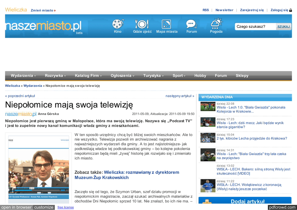 Wieliczka RSS | New sletter | Zarejestruj się | Zaloguj się Zm ień m iasto » Czego szukasz? Kino Wydarzenia Rozrywka Katalog Firm Gdzie zjeść Ogłoszenia Mapa miasta Turystyka Forum Sport SZUKAJ Pogoda Hobby Forum Sklepy Wieliczka » Wydarzenia » Niepołom ice m ają sw oja telew izję « poprzedni artykuł następny artykuł » Niepołomice mają swoja telewizję Anna Górska 2011-05-09, Aktualizacja: 2011-05-09 19:50 WYDARZENIA DNIA dzisiaj 22:08 Wisła - Lech 1:0. "Biała Gwiazda" pokonała Kolejorza w Krakowie... Niepołomice jest pierwszą gminą w Małopolsce, która ma swoją telewizję. Nazywa się „Podcast TV” i jest to zupełnie nowy kanał komunikacji władz gminy z mieszkańcami. dzisiaj 17:23 W ten sposób urzędnicy chcą być bliżej swoich mieszkańców. Ale to nie wszystko. Telewizja pozwoli im archiwizować nagrania z najważniejszych wydarzeń dla gminy. A to jest najistotniejsze- jak podkreślają władze tej podkrakowskiej gminy – bo kolejne pokolenia niepołomiczan będą mieli „żywą” historię jak rozwijało się i zmieniało ich miasto. dzisiaj 15:04 Wisła - Lech: dziś mecz. Jaki będzie wynik starcia gigantów? 2 tys. kibiców Lecha przyjedzie do Krakowa? dzisiaj 14:31 Wisła - Lech: "Biała Gwiazda" trzy lata czeka na zwycięstwo dzisiaj 13:02 Zobacz także: Wieliczka: rozmawiamy z dyrektorem Muzeum Żup Krakowskich Zaczęło się od tego, że Szymon Urban, szef działu promocji w niepołomickim magistracie, zaczął szukać archiwalnych materiałów z obchodów Dni Niepołomic sprzed 10 lat. Nie znalazł, bo ich nie ma. – open in browser customize free license WISŁA - LECH. Bakero: silną stroną Wisły jest skuteczność [VIDEO] dzisiaj 11:22 WISŁA - LECH. Wołąkiewicz: z koronacją (Wisły) należy jeszcze poczekać Dodaj artykuł pdfcrowd.com A szkoda, że wtedy nikt nie pomyślał o tym, by nagrać i zachować historię naszej gminy dla młodszych mieszkańców - żałuje Szymon (© www.podc asttv.pl/niepolomic e) Urban. – To nie są olbrzymie koszty, ale warto je ponieść. Urząd też Masz zdjęcie do tego tematu? Wyślij » musi być nowoczesny i otwarty na różnego rodzaju innowacjeprzekonuje Urban. Przekonał też burmistrza Niepołomic - Romana Ptaka, by zorganizować w gminie swoją lokalną telewizję. By można było produkować relacje filmowe z ciekawych wydarzeń, które odbywają się w Niepołomicach i umieszczać je na specjalnym serwisie, a potem je archiwizować. - Użytkownicy będą mogli albo jeszcze raz przeżyć momenty, w których uczestniczyli osobiście albo za kilka miesięcy lub lat zobaczyć co w Niepołomicach działo się w przeszłości – podkreśla Urban. Na razie wyprodukowano dwa materiały z Niepołomic. Pierwszy raz ekipa filmowa podcasttv.pl zjawiła się w Niepołomicach podczas Targów Wielkanocnych. Drugim razem odwiedzili miasto z okazji oficjalnego otwarcia Małopolskiego Centrum Dźwięku i Słowa. Do końca tego roku w sumie telewizja ma zrealizować dziesięć reportaży. Za każdy z budżetu gminy przeznacza się tysiąc złotych. – Jeśli będzie potrzeba zwiększyć liczbę reportaży, to zrobimy to – zaznacza Urban. Dodaje, że przedsięwzięcie to jest ważne dla rozwoju i promocji gminy i jego zdaniem 10 tys. zł, które teraz przeznaczono na telewizję, nie jest dużym wydatkiem. Tworzy niepołomicką telewizję krakowska firma Red Star Media z Krakowa. Jest to ta sama firma, która prowadzi także kanał telewizyjny dla Małopolskiego Urzędu Zdaniem Wiktora W.Krammera, producenta CBC Film Productions, kanał telewizyjny tworzy doskonałą platformę komunikacyjną dla działu promocji urzędu miasta. - Dobrze promowana gmina to nowi inwestorzy, nowi mieszkańcy – to więcej podatków w gminnej kasie oraz ułatwienie w pozyskiwaniu środków z Unii Europejskiej – podkreśla Wiktor.W.Krammer - producent CBC Film Productions. Niepołomice: Małopolskie Centrum Dźwięku i Słowa zaprasza na dzień otwarty Dodaj artykuł NAJCZĘŚCIEJ Komentowane dodaj artykuł » Czytane Porachunki kiboli na os. Jagiellońskim w Krakowie: 14 lat za zabójstwo 17-latka? 11 Kraków: ul. Lema znów głośna. Są znaki, przystanki, sygnalizacja. Tylko samochodów brak [SONDA] 10 Ochotnica Górna: samobójstwo proboszcza po wypadku samochodowym. Mieszkańcy w szoku 9 Samorządowa delegacja powalczy o wyższą rangę Nowego Sącza 7 Nowy Sącz: straż miejska zlustrowana przez Najwyższą Izbę Kontroli 6 Mieszkańcy Grzegórzek wściekli na MPK 5 Kraków: CBŚ rozbiło gang pseudokibiców - dilerów [VIDEO] 5 Niektórzy właściciele krakowskich kamienic to łajdacy? 4 ZAPISZ SIĘ DO NEWSLETTERA Władze gminy nie chcą skupiać się tylko na relacjonowaniu wydarzeń z życia miasta. Planują także realizować materiały, które przybliżą mieszkańcom i inwestorom działalność urzędu, lokalnych klubów, firm, a także Niepołomickiej Strefy Inwestycyjnej. Najśw ieższe w iadomości z Tw ojego miasta prosto na Tw oją skrzynkę e-mail. Zapisz się do new slettera, żeby dostaw ać najw ażniejsze informacje w ybrane przez naszych redaktorów . Wpisz sw ój adres [email protected] Polecamy w serwisie kryminalnamalopolska.pl: Nowy Targ: kierowca miał aż 4 promile! Sportowetempo.pl. Najlepszy serwis sportowy Zapisz się Reklama Dodaj Do Drukuj Tagi: niepołomice, telewizja niepołomice, Podcast TV open in browser customize free license pdfcrowd.com REKLAMA KOMENTARZE Dodaj Komentarz Brak komentarzy. Możesz być pierwszy! NASZE AKCJE BEZPIECZNI NA DRODZE Niemal każdego dnia dochodzi do tragedii na drogach. Zobacz, co jest ich najczęstszą przyczyną. Przeczytaj wyznania sprawców wypadków i ich ofiar. Reklama OGŁOSZENIA NIERUCHOMOŚCI Mieszkanie 3-pokojowe, 75,33 m2 , 2 piętro 315 000 zł Mieszkanie 2-pokojowe, 45 m2 , parter 279 000 zł DODATKOWY OPIS | Dw upokojow e mieszkanie z ogródkiem i tarasem w Wieliczce Zobacz więcej na dom.gratka.pl » OGŁOSZENIA MOTORYZACYJNE Chrysler