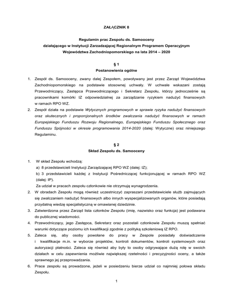 ZAŁĄCZNIK 8 Regulamin prac Zespołu ds. Samooceny działającego w Instytucji Zarzadzającej Regionalnym Programem Operacyjnym Województwa Zachodniopomorskiego na lata 2014 – 2020 §1 Postanowienia ogólne 1. Zespół ds. Samooceny, zwany dalej Zespołem, powoływany jest przez Zarząd Województwa Zachodniopomorskiego na podstawie stosownej uchwały. W uchwale wskazani zostają Przewodniczący, Zastępca Przewodniczącego i Sekretarz Zespołu, którzy jednocześnie są pracownikami komórki IZ odpowiedzialnej za zarządzanie ryzykiem nadużyć finansowych w ramach RPO WZ. 2. Zespół działa na podstawie Wytycznych programowych w sprawie ryzyka nadużyć finansowych oraz skutecznych i proporcjonalnych środków zwalczania nadużyć finansowych w ramach Europejskiego Funduszu Rozwoju Regionalnego, Europejskiego Funduszu Społecznego oraz Funduszu Spójności w okresie programowania 2014-2020 (dalej: Wytyczne) oraz niniejszego Regulaminu. §2 Skład Zespołu ds. Samooceny 1. W skład Zespołu wchodzą: a) 8 przedstawicieli Instytucji Zarządzającej RPO WZ (dalej: IZ); b) 3 przedstawicieli każdej z Instytucji Pośredniczącej funkcjonującej w ramach RPO WZ (dalej: IP). Za udział w pracach zespołu członkowie nie otrzymują wynagrodzenia. 2. W obradach Zespołu mogą również uczestniczyć zapraszani przedstawiciele służb zajmujących się zwalczaniem nadużyć finansowych albo innych wyspecjalizowanych organów, które posiadają przydatną wiedzę specjalistyczną w omawianej dziedzinie. 3. Zatwierdzona przez Zarząd lista członków Zespołu (imię, nazwisko oraz funkcja) jest podawana do publicznej wiadomości. 4. Przewodniczący, jego Zastępca, Sekretarz oraz pozostali członkowie Zespołu muszą spełniać warunki dotyczące poziomu ich kwalifikacji zgodnie z polityką szkoleniową IZ RPO. 5. Zaleca i się, aby osoby powołane do pracy w Zespole posiadały doświadczenie kwalifikacje m.in. w wyborze projektów, kontroli dokumentów, kontroli systemowych oraz autoryzacji płatności. Zaleca się również aby były to osoby odgrywające dużą rolę w swoich działach w celu zapewnienia możliwie największej rzetelności i precyzyjności oceny, a także sprawnego jej przeprowadzania. 6. Prace zespołu są prowadzone, jeżeli w posiedzeniu bierze udział co najmniej połowa składu Zespołu. 1 7. Decyzje podczas posiedzenia podejmowane są zwykłą większością głosów, w głosowaniu jawnym. W przypadku równej liczby głosów, głos rozstrzygający należy do Przewodniczącego Zespołu lub jego Zastępcy. 8. W przypadku gdy jeden z członków Zespołu nie może uczestniczyć w jego pracach (np. zmiana miejsca pracy, urlop wychowawczy, itp.), wówczas na jego miejsce powoływany jest na podstawie uchwały Zarządu Województwa kolejny - nowy członek. 9. Odwołania członków Zespołu dokonuje Zarząd Województwa. §3 Przewodniczący, Z-ca Przewodniczącego i Sekretarz Zespołu ds. Samooceny 1. Pracą Zespołu kieruje Przewodniczący. 2. Zadania i odpowiedzialności Przewodniczącego Zespołu: a) zwoływanie posiedzeń Zespołu w terminach określonych przez Wytyczne i niniejszy Regulamin; b) zapewnienie poufności i przejrzystości procesu oceny ryzyk nadużyć finansowych; c) przekazywanie członkom Zespołu, przed przystąpieniem do prac niezbędnych informacji i dokumentów; d) nadzór nad dokumentacją związaną z pracą Zespołu; e) kierowanie wniosków o odwołanie/powołanie danej osoby, z powodów opisanych w Regulaminie w § 2 pkt 9; f) weryfikowanie prawidłowości dokonanych ocen ryzyk przed zatwierdzeniem Protokołu z prac Zespołu. 3. W przypadku nieobecności Przewodniczącego jego obowiązki przejmuje Zastępca. 4. Sekretarz odpowiedzialny jest za sporządzenie: a) Protokołu z posiedzenia prac Zespołu; b) Listy obecności z posiedzenia prac Zespołu. 5. Dokumenty wskazane w pkt 4 a i b stanowią dokumentację pracy Zespołu, są one zatwierdzane przez Zarząd Województwa i przekazywane kierownikom IP. 6. Obsługę prac Zespołu, w tym Przewodniczącego, zapewnia komórka odpowiedzialna za zarządzanie ryzykiem nadużyć finansowych w IZ. §4 Termin i miejsce prac Zespołu 1. Zespół ds. samooceny dokonuje kompletnej oceny nadużyć finansowych raz w roku, w terminie do 30 listopada za poprzedni rok obrachunkowy, zwanej oceną okresową (zwyczajną). 2. Zespół może dokonywać również oceny bieżącej (nadzwyczajnej), w następujących przypadkach: a) wystąpienia nowego przypadku nadużycia; b) zasadniczych zmian w procedurach lub kadrach IZ i IP; c) stwierdzenia potencjalnie słabych punktów systemu; 2 d) określonych w Wytycznych; e) istotnych i nieprzewidzianych wcześniej elementów samooceny. 3. Spotkania robocze zespołu są zwoływane przez Przewodniczącego Zespołu, w terminie co najmniej 14 dni przed planowanym posiedzeniem Zespołu. Zawiadomienie o posiedzeniu Zespołu zawiera m.in. wstępny porządek obrad. 4. Posiedzenia Zespołu odbywają się w miejscu wskazanym w zawiadomieniu. 5. Przed posiedzeniem Zespołu, każda z IP biorąca udział w realizacji RPO WZ, przekazuje Przewodniczącemu Zespołu, propozycje wyodrębnionych rodzajów ryzyk nadużyć finansowych, które według niej powinny podlegać samoocenie i inne zagadnienia, które powinny być przedmiotem prac zespołu. 6. Obsługę organizacyjną prac Zespołu zapewnia właściwa komórka IZ odpowiedzialna za zarządzanie ryzykiem nadużyć finansowych. 7. Wszelkie niezbędne materiały w trakcie prac Zespołu są udostępniane przez Przewodniczącego/Sekretarza przed posiedzeniem lub w terminie posiedzenia. §5 Zadania Zespołu ds. samooceny 1. Zespół dokonuje regularnej (okresowej lub bieżącej) oceny ryzyka nadużyć finansowych oraz przygotowuje plany reagowania (odpowiednich kontroli) w tego typu sytuacjach. 2. Ponadto Zespół odpowiedzialny jest za: a) ustalenie zakresu, sposobu i częstotliwości publikacji informacji o kontrolach oraz o instytucjach (komórka