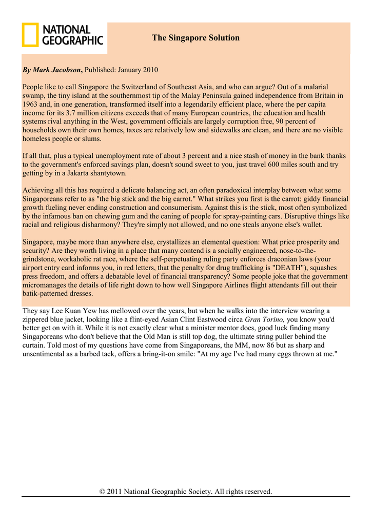 The Singapore Solution By Mark Jacobson, Published: January 2010 People like to call Singapore the Switzerland of Southeast Asia, and who can argue? Out of a malarial swamp, the tiny island at the southernmost tip of the Malay Peninsula gained independence from Britain in 1963 and, in one generation, transformed itself into a legendarily efficient place, where the per capita income for its 3.7 million citizens exceeds that of many European countries, the education and health systems rival anything in the West, government officials are largely corruption free, 90 percent of households own their own homes, taxes are relatively low and sidewalks are clean, and there are no visible homeless people or slums. If all that, plus a typical unemployment rate of about 3 percent and a nice stash of money in the bank thanks to the government's enforced savings plan, doesn't sound sweet to you, just travel 600 miles south and try getting by in a Jakarta shantytown. Achieving all this has required a delicate balancing act, an often paradoxical interplay between what some Singaporeans refer to as "the big stick and the big carrot." What strikes you first is the carrot: giddy financial growth fueling never ending construction and consumerism. Against this is the stick, most often symbolized by the infamous ban on chewing gum and the caning of people for spray-painting cars. Disruptive things like racial and religious disharmony? They're simply not allowed, and no one steals anyone else's wallet. Singapore, maybe more than anywhere else, crystallizes an elemental question: What price prosperity and security? Are they worth living in a place that many contend is a socially engineered, nose-to-thegrindstone, workaholic rat race, where the self-perpetuating ruling party enforces draconian laws (your airport entry card informs you, in red letters, that the penalty for drug trafficking is "DEATH"), squashes press freedom, and offers a debatable level of financial transparency? Some people joke that the government micromanages the details of life right down to how well Singapore Airlines flight attendants fill out their batik-patterned dresses. They say Lee Kuan Yew has mellowed over the years, but when he walks into the interview wearing a zippered blue jacket, looking like a flint-eyed Asian Clint Eastwood circa Gran Torino, you know you'd better get on with it. While it is not exactly clear what a minister mentor does, good luck finding many Singaporeans who don't believe that the Old Man is still top dog, the ultimate string puller behind the curtain. Told most of my questions have come from Singaporeans, the MM, now 86 but as sharp and unsentimental as a barbed tack, offers a bring-it-on smile: "At my age I've had many eggs thrown at me." © 2011 National Geographic Society. All rights reserved. Weronika Piotrowska 07.05.2010 Wzór na Singapur Mark Jacobson Singapur to państwo z lubością nazywane Szwajcarią południowo-wschodniej Azji. I czemu nie? Ta mała wysepka południowej części Półwyspu Malajskiego to niegdyś skażone malarią mokradła, dziś – uwolnione w 1963 roku od wpływów brytyjskich niezależne i w pełni sprawne państwo. Dochód na głowę każdego z 3,7 miliona obywateli przewyższa niejeden europejski. System oświaty oraz służba zdrowia śmiało dorównują Zachodowi. Rzadko kiedy można tu spotkać skorumpowanego urzędnika rządowego. 90% mieszkańców posiada swój własny dom. Podatki są względnie niskie a chodniki czyste. Dzielnice biedoty oraz problem bezdomności tu nie istnieją. Co ciekawe, wszystko to osiągnięto w zasadzie za życia tylko jednego pokolenia. Dodaj do tego stopę bezrobocia nie wyższą niż 3% oraz całkiem przyzwoitą kwotę na koncie, którą zyskujesz dzięki wprowadzonemu przez rząd planu oszczędnościowego. Jeśli wszystko to jeszcze Cię nie przekonało, jedź 950 km na południe i, dla kontrastu, zasmakuj slumsów Dżakarty. Singapur stał się potęgą dzięki subtelnej, często paradoksalnej, współgrze dwóch silnych bodźców: przysłowiowego „kija” i „marchewki”. Przysłowiowa „marchewka” to nagroda w postaci spektakularnego wzrostu na polu finansowym, który z kolei napędza budownictwo oraz wspiera konsumeryczny model życia. „Kij” z kolei to kary typu owiany złą sławą zakaz żucia gumy lub „wsadzanie” ludzi do więzienia za umieszczenie graffiti na jakimkolwiek samochodzie. W Singapurze nie ma też mowy o utarczkach na tle rasowym czy też religijnym. Ukraść komuś portfel? O tym również zapomnij. W tym kraju bardziej niż gdziekolwiek indziej na świecie zachodzi podstawowe pytanie: jaką cenę trzeba zapłacić za cały ten dobrobyt i bezpieczeństwo gwarantowane przez władze kraju? Czy rekompensują one życie pełne trudów, ciężkiej fizycznej pracy, wszechobecnego „wyścigu szczurów”? Czy warto żyć w kraju, w którym jedyna, bo bezalternatywna, rządząca partia wprowadza w życie drakońskie przepisy prawne (wjeżdżając do kraju zostajesz szybko poinformowany, że za przemyt narkotyków grozi Ci śmierć)? W kraju, który nie uznaje ani wolności słowa ani wolności prasy oraz który nie zamierza tłumaczyć się obywatelom ze sposobu wykorzystania finansów publicznych? Niektórzy nawet żartują sobie z tego, że singapurski rząd „wchodzi z butami” nawet na pokład linii lotniczych. Sprawdza się tam m.in. czy batikowe kostiumy noszone przez stewardessy odpowiednio podkreślają ich kształty… © 2011 National Geographic Polska. Wszelkie prawa zastrzeżone.