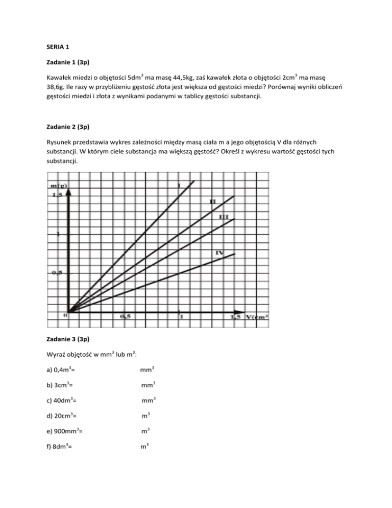 SERIA 1 Zadanie 1 (3p) Kawałek miedzi o objętości 5dm3 ma masę