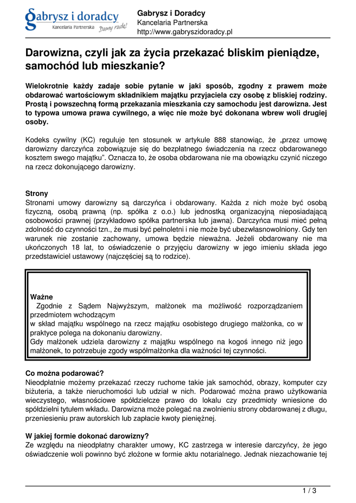 Gabrysz i Doradcy Kancelaria Partnerska http://www.gabryszidoradcy.pl Darowizna, czyli jak za życia przekazać bliskim pieniądze, samochód lub mieszkanie? Wielokrotnie każdy zadaje sobie pytanie w jaki sposób, zgodny z prawem może obdarować wartościowym składnikiem majątku przyjaciela czy osobę z bliskiej rodziny. Prostą i powszechną formą przekazania mieszkania czy samochodu jest darowizna. Jest to typowa umowa prawa cywilnego, a więc nie może być dokonana wbrew woli drugiej osoby. Kodeks cywilny (KC) reguluje ten stosunek w artykule 888 stanowiąc, że „przez umowę darowizny darczyńca zobowiązuje się do bezpłatnego świadczenia na rzecz obdarowanego kosztem swego majątku”. Oznacza to, że osoba obdarowana nie ma obowiązku czynić niczego na rzecz dokonującego darowizny. Strony Stronami umowy darowizny są darczyńca i obdarowany. Każda z nich może być osobą fizyczną, osobą prawną (np. spółka z o.o.) lub jednostką organizacyjną nieposiadającą osobowości prawnej (przykładowo spółka partnerska lub jawna). Darczyńca musi mieć pełną zdolność do czynności tzn., że musi być pełnoletni i nie może być ubezwłasnowolniony. Gdy ten warunek nie zostanie zachowany, umowa będzie nieważna. Jeżeli obdarowany nie ma ukończonych 18 lat, to oświadczenie o przyjęciu darowizny w jego imieniu składa jego przedstawiciel ustawowy (najczęściej są to rodzice). Ważne Zgodnie z Sądem Najwyższym, małżonek ma możliwość rozporządzaniem przedmiotem wchodzącym w skład majątku wspólnego na rzecz majątku osobistego drugiego małżonka, co w praktyce polega na dokonaniu darowizny. Gdy małżonek udziela darowizny z majątku wspólnego na kogoś innego niż jego małżonek, to potrzebuje zgody współmałżonka dla ważności tej czynności. Co można podarować? Nieodpłatnie możemy przekazać rzeczy ruchome takie jak samochód, obrazy, komputer czy biżuteria, a także nieruchomości lub udział w nich. Podarować można prawo użytkowania wieczystego, własnościowe spółdzielcze prawo do lokalu czy przedmioty wniesione do spółdzielni tytułem wkładu. Darowizna może polegać na zwolnieniu strony obdarowanej z długu, przeniesieniu praw autorskich lub zapłacie kwoty pieniężnej. W jakiej formie dokonać darowizny? Ze względu na nieodpłatny charakter umowy, KC zastrzega w interesie darczyńcy, że jego oświadczenie woli powinno być złożone w formie aktu notarialnego. Jednak niezachowanie tej 1/3 Gabrysz i Doradcy Kancelaria Partnerska http://www.gabryszidoradcy.pl formy, nie będzie skutkowało nieważnością zawartej umowy, jeżeli przyrzeczone świadczenie zostanie spełnione (możliwa jest więc zwykła forma pisemna lub ustna, dlatego podarowanie drogiej biżuterii nie wymaga wizyty u notariusza). Oświadczenie woli obdarowanego, wyrażające przyjęcie przedmiotu darowizny może przybrać w zasadzie formę dowolną. Wyjątkiem od powyższych zasad jest przekazanie w drugiej osobie nieruchomości (np. mieszkania), prawa użytkowania wieczystego lub spółdzielczego własnościowego prawa do lokalu. Umowa darowizny w tym przypadku wymaga złożenia oświadczenia woli przez obie strony w formie aktu notarialnego, a konsekwencją niespełnienia tego warunku jest nieważność umowy. Przykład Robert chce przekazać swojemu synowi samochód. Jakie elementy powinna zawierać umowa? Obie strony mogą sporządzić umowę pisemną. Należy określić czas i miejsce zawarcia, wskazać i oznaczyć darczyńcę i obdarowanego (imię i nazwisko, adres zamieszkania, nr i seria dowodu osobistego), dane samochodu tj. marka, model, nr rejestracyjny, rok produkcji itp., wartość przedmiotu darowizny, oświadczenia właściwie dla stron o darowaniu i przyjęciu, własnoręczne podpisy pod treścią umowy złożone przez darczyńcę i obdarowanego. Skutki umowy między stronami Podstawowym obowiązkiem darczyńcy wynikającym z nowego stosunku prawnego jest wykonanie umowy darowizny. Zakładając, że jej przedmiotem było zapłacenie określonej kwoty pieniężnej, to wykonanie umowy nastąpi z chwilą przekazania pieniędzy obdarowanemu. Zgodnie z Kodeksem cywilnym, darczyńca ponosi odpowiedzialność za szkody wynikłe z niewykonania lub nienależytego wykonania umowy, ale tylko wtedy, gdy można mu przypisać winę umyślną lub rażące niedbalstwo. A jeżeli spóźnia się z zapłatą świadczenia pieniężnego, to obdarowany ma prawo domagać się zapłaty odsetek za opóźnienie od dnia wytoczenia powództwa. Ponadto darczyńca odpowiada za wady fizyczne i prawne, jeżeli nie zawiadomił drugiej strony umowy, a ta nie mogła ich z łatwością zauważyć (np. gdy wykorzystując swoją wiedzę motoryzacyjną świadomie ukrył wady w samochodzie lub nie poinformował o nich obdarowanego). Dodatkowy zapis w umowie w postaci polecenia W umowie darowizny może znaleźć się postanowienie, z którego wynika obowiązek, nałożony na obdarowanego, określonego działania lub zaniechania. Polecenie charakteryzuje się tym, że nie czyni nikogo wierzycielem. Przykładowo darczyńca może więc zobowiązać druga stronę do przekazania określonej kwoty pieniężnej innej osobie. Wykonania tego postanowienia w umowie można żądać dopiero po wykonaniu darowizny. Obdarowany może się zwolnić się od obowiązku wypełnienia polecenia przez wydanie przedmiotu darowizny w takim stanie, w jakim go otrzymał. Po śmierci darczyńcy, jego spadkobiercy mogą domagać się wykonania polecenia. Odwołanie darowizny 2/3 Gabrysz i Doradcy Kancelaria Partnerska http://www.gabryszidoradcy.pl W pewnych okolicznościach można odwołać darowiznę. Jeżeli nie została wykonana może to nastąpić w wyniku zgodnych oświadczeń woli stron, a także w sytuacji gdy darczyńca popadł w niedostatek (nie ma środków do zaspokojenia jego usprawiedliwionych potrzeb). Przykład Starsza osoba z niską emeryturą przekazuje dużą kwotę pieniężną i nie ma 