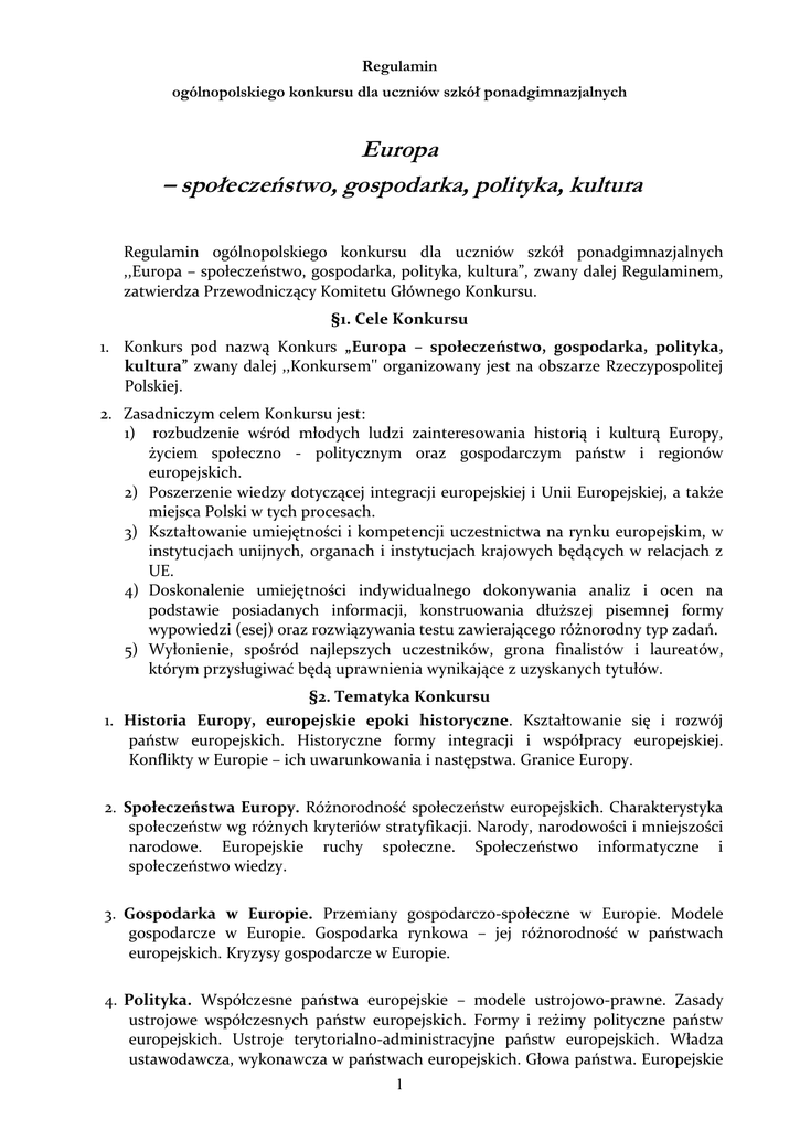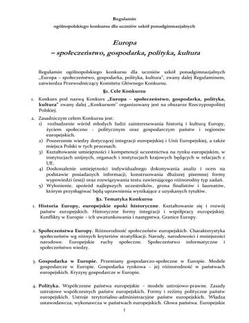 Regulamin ogólnopolskiego konkursu dla uczniów szkół ponadgimnazjalnych Europa – społeczeństwo, gospodarka, polityka, kultura Regulamin ogólnopolskiego konkursu dla uczniów szkół ponadgimnazjalnych ,,Europa – społeczeństwo, gospodarka, polityka, kultura”, zwany dalej Regulaminem, zatwierdza Przewodniczący Komitetu Głównego Konkursu. §1. Cele Konkursu 1. Konkurs pod nazwą Konkurs „Europa – społeczeństwo, gospodarka, polityka, kultura” zwany dalej ,,Konkursem'' organizowany jest na obszarze Rzeczypospolitej Polskiej. 2. Zasadniczym celem Konkursu jest: 1) rozbudzenie wśród młodych ludzi zainteresowania historią i kulturą Europy, życiem społeczno - politycznym oraz gospodarczym państw i regionów europejskich. 2) Poszerzenie wiedzy dotyczącej integracji europejskiej i Unii Europejskiej, a także miejsca Polski w tych procesach. 3) Kształtowanie umiejętności i kompetencji uczestnictwa na rynku europejskim, w instytucjach unijnych, organach i instytucjach krajowych będących w relacjach z UE. 4) Doskonalenie umiejętności indywidualnego dokonywania analiz i ocen na podstawie posiadanych informacji, konstruowania dłuższej pisemnej formy wypowiedzi (esej) oraz rozwiązywania testu zawierającego różnorodny typ zadań. 5) Wyłonienie, spośród najlepszych uczestników, grona finalistów i laureatów, którym przysługiwać będą uprawnienia wynikające z uzyskanych tytułów. §2. Tematyka Konkursu 1. Historia Europy, europejskie epoki historyczne. Kształtowanie się i rozwój państw europejskich. Historyczne formy integracji i współpracy europejskiej. Konflikty w Europie – ich uwarunkowania i następstwa. Granice Europy. 2. Społeczeństwa Europy. Różnorodność społeczeństw europejskich. Charakterystyka społeczeństw wg różnych kryteriów stratyfikacji. Narody, narodowości i mniejszości narodowe. Europejskie ruchy społeczne. Społeczeństwo informatyczne i społeczeństwo wiedzy. 3. Gospodarka w Europie. Przemiany gospodarczo-społeczne w Europie. Modele gospodarcze w Europie. Gospodarka rynkowa – jej różnorodność w państwach europejskich. Kryzysy gospodarcze w Europie. 4. Polityka. Współczesne państwa europejskie – modele ustrojowo-prawne. Zasady ustrojowe współczesnych państw europejskich. Formy i reżimy polityczne państw europejskich. Ustroje terytorialno-administracyjne państw europejskich. Władza ustawodawcza, wykonawcza w państwach europejskich. Głowa państwa. Europejskie 1 modele samorządu terytorialnego. Europejskie partie i systemy partyjne. Grupy interesu w państwach europejskich. 5. Kultura europejska. Europejskie kody kulturowe. Kultura materialna i duchowa. Tożsamość kulturowa. Europejska różnorodność kulturowa. 6. Unia Europejska – wielopłaszczyznowa wspólnota Europejczyków: historyczna, aksjologiczna, ekonomiczna, polityczna, prawna, społeczna, międzynarodowa. 7. Wymiar aksjologiczny integracji europejskiej: wartości i interesy w procesie integracji. Wartości a zasady ustrojowe UE. 8. Wymiar prawny integracji europejskiej: prawno-ustrojowy status UE. Prawo UE: pierwotne i wtórne. Zakres przedmiotowy, podmiotowy, terytorialny i czasowy prawa Unii Europejskiej. Podział kompetencji między UE a państwami członkowskimi. 9. Wymiar polityczny integracji europejskiej: system instytucjonalny UE, wymiar międzyrządowy i ponadnarodowy, wymiar horyzontalny i wertykalny integracji europejskiej, polityki UE. Formy legitymizacji integracji europejskiej. 10. Wymiar ekonomiczny integracji europejskiej: formy europejskiej integracji ekonomicznej – strefa wolnego handlu, unia celna, wspólny rynek, komplementarna integracja ekonomiczna (unia ekonomiczna). 11. Wymiar wspólnotowy i międzyrządowy integracji europejskiej: zakres kompetencji UE (dziedziny kompetencji wyłącznych i dzielonych), wspólnotowa metoda podejmowania decyzji, status prawno-międzynarodowy Unii Europejskiej. Pozycja Unii Europejskiej w stosunkach międzynarodowych. UE – prawo legacji i prawo do zawierania umów międzynarodowych. Unia Europejska a wyzwania współczesnego świata. 12. Wymiar społeczny integracji europejskiej: Czy w Unii Europejskiej istnieje społeczeństwo obywatelskie? Wpływ społeczeństw UE na procesy integracji europejskiej. Społeczna ocena integracji europejskiej. Media europejskie. 13. Kryzysy w Unii Europejskiej i sposoby ich przezwyciężania. Kryzys: ekonomiczny, polityczny, społeczny, demokracji, legitymizacji. Wizje rozwoju integracji europejskiej. 14. Polska w Unii Europejskiej. Miejsce Polski w UE – w instytucjach UE, na rynku UE, wpływ na kształtowanie polityk UE. Problemy, korzyści i koszty członkostwa Polski w Unii Europejskiej. 2 §3. Organizator Konkursu 1. Organizatorem Konkursu jest Instytut Europeistyki Wydziału Dziennikarstwa i Nauk Politycznych Uniwersytetu Warszawskiego, we współpracy z Fundacją Europea: Instytut Europeistyki Wydział Dziennikarstwa i Nauk Politycznych Uniwersytet Warszawska ul. Krakowskie Przedmieście 26/28, 00-927 Warszawa tel.: 22 55 20 234, 22 55 22 942 fax: 22 55 22 941 e-mail: [email protected] 2. Organizator powierza realizację Konkursu Komitetowi Głównemu Konkursu. 3. Struktura organizacyjna Komitetu Głównego Konkursu: 1) Komitet Główny przewodniczącego Konkursu (kierownika składa się z: przewodniczącego, organizacyjnego), sekretarzy zastępcy naukowych i organizacyjnych oraz pozostałych członków i został określony w Załączniku nr 1 do Regulaminu. 2) Przewodniczący Komitetu Głównego Konkursu powoływany jest decyzją Rektora Uniwersytetu Warszawskiego, po przedstawieniu kandydatury przez Dziekana Wydziału Dziennikarstwa i Nauk Politycznych UW. Przewodniczący Komitetu Głównego Konkursu powołuje pozostały skład Komitetu, który zatwierdzany jest przez Dziekana WDiNP. 4. Do zadań Komitetu Głównego Konkursu należy: 1) realizacja Konkursu zgodnie z postanowieniami Regulaminu, 2) organizacja I i II etap