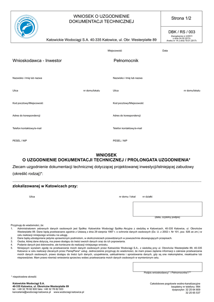 WNIOSEK O UZGODNIENIE DOKUMENTACJI TECHNICZNEJ Strona 1/2 DBK / RS / 003 Katowickie Wodociągi S.A. 40335 Katowice, ul. Obr. Westerplatte 89 Data Miejscowość Wnioskodawca Inwestor Pełnomocnik Nazwisko i Imię lub nazwa Nazwisko i Imię lub nazwa Ulica nr domu/lokalu Zarządzenie nr 4/2011 z dnia 24.02.2011r. Aneks nr 14 z dnia 19.01.2017r. Ulica nr domu/lokalu Kod pocztowy/Miejscowość Kod pocztowy/Miejscowość Adres do korespondencji Adres do korespondencji Telefon kontaktowy/email Telefon kontaktowy/email PESEL / NIP PESEL / NIP WNIOSEK O UZGODNIENIE DOKUMENTACJI TECHNICZNEJ / PROLONGATA UZGODNIENIA* Zlecam uzgodnienie dokumentacji technicznej dotyczącej projektowanej inwestycji/istniejącej zabudowy (określić rodzaj)*: ............................................................................................................................................................................ zlokalizowanej w Katowicach przy: Ulica nr domu / lokal nr działki (data, czytelny podpis) Przyjmuję do wiadomości, że: 1. Administratorem zebranych danych osobowych jest Spółka: Katowickie Wodociągi Spółka Akcyjna z siedzibą w Katowicach, 40335 Katowice, ul. Obrońców Westerplatte 89. Dane będą przetwarzane zgodnie z Ustawą z dnia 29 sierpnia 1997 r. o ochronie danych osobowych (Dz. U. z 2002 r. Nr 101, poz. 926 ze zm.) w celu realizacji niniejszego wniosku na usługę. 2. Dane będą udostępniane jedynie uprawnionym podmiotom, w okolicznościach przewidzianych w powszechnie obowiązujących przepisach. 3. Osoba, której dane dotyczą, ma prawo dostępu do treści swoich danych oraz do ich poprawiania. 4. Podanie danych jest dobrowolne, ale konieczne do realizacji niniejszego wniosku. 5. Niniejszym wyrażam zgodę na przetwarzanie moich danych osobowych przez Katowickie Wodociągi S.A., z siedzibą przy ul. Obrońców Westerplatte 89, 40335 Katowice w celu realizacji zlecanych przez Panią/Pana* usług. Jednocześnie przyjmuję do wiadomości, że mam prawo żądania informacji o zakresie przetwarzania moich danych osobowych, prawo dostępu do treści tych danych, uzupełnienia, uaktualnienia i sprostowania danych, gdy są one niekompletne, nieaktualne lub nieprawdziwe. Mam prawo również wniesienia sprzeciwu wobec przetwarzania moich danych osobowych w wymienionym celu. Podpis wnioskodawcy* / Pełnomocnika*/** * niepotrzebne skreslić Katowickie Wodociągi S.A. 40335 Katowice, ul. Obrońców Westerplatte 89 tel.: +48 32 78 82 600 faks: +48 32 78 82 503 [email protected] www.wodociagi.katowice.pl Całodobowe pogotowie wodnokanalizacyjne bezpłatny nr telefonu: 994 dyspozytor: 32 25 64 809 32 25 65 537 Strona 2/2 DBK / RS / 003 Załączniki: 2 egz. dokumentacji technicznej (podłączenie do sieci wodociągowej i/lub kanalizacyjnej). Odbiór: OSOBIŚCIE ODESŁAĆ POCZTĄ Wypełnia pracownik Katowickich Wodociągów S. A. Data wpłynięcia Numer SKRP Dekretacja Numer posesji Uwagi: Katowickie Wodociągi S.A. 40335 Katowice, ul. Obrońców Westerplatte 89 tel.: +48 32 78 82 600 faks: +48 32 78 82 503 [email protected] www.wodociagi.katowice.pl Numer nabywcy BOK Zwykły Polecony Faks Email Podpis Całodobowe pogotowie wodnokanalizacyjne bezpłatny nr telefonu: 994 dyspozytor: 32 25 64 809 32 25 65 537