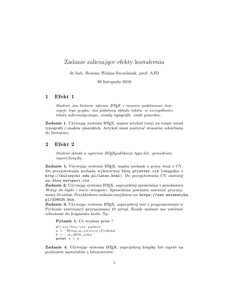 Zadanie zaliczające efekty kształcenia dr hab. Bożena Woźna-Szcześniak, prof. AJD 30 listopada 2016 1 Efekt 1 Student zna historie sytemu LATEX i rozumie podstawowe koncepcje tego języka, zna podstawy składu tekstu, w szczególności tekstu informatycznego, zasady typografii, znaki pisarskie. Zadanie 1. Używając systemu LATEX, napisz artykuł (esej) na temat zasad typografii i znaków pisarskich. Artykuł musi zawierać stosowne odowłania do literatury. 2 Efekt 2 Student składa w systemie LATEXpublikacje typu list, sprawdzian, raport/książkę. Zadanie 1. Używając systemu LATEX, napisz podanie o pracę wraz z CV. Do przygotowania podania wykorzystaj klasę plletter.cls (osiągalna z http://kulczycki.edu.pl/latex.html). Do przygotowania CV zastosuj np. klasę europecv.cls Zadanie 2. Używając systemu LATEX, zaprojektuj sprawdzian z przedmiotu Wstęp do logiki i teorii mnogości. Sprawdzian powinien zawierać przynajmniej 10 zadań. Przykładowe zadania znajdziesz na: https://www.matematyka. pl/209025.htm. Zadanie 3. Używając systemu LATEX, zaprojektuj test z programowania w Pythonie zawerajacy przynajmniej 10 pytań. Każde zadanie ma zawierać odwołanie do fragmentu kodu. Np. Pytanie 1. Co wypisze print ? #! / u s r / b i n / env p y t h o n a = ’ Witaj w s w i e c i e Pythona ’ b = ’ w 2016 roku ’ print a + b Zadanie 4. Używając systemu LATEX, zaprojektuj książkę lub raport na podstawie materiałów z laboratoriów. 1 3 Efekt 3 Student składa w systemie LATEX prezentacje multimedialną. Zadanie 5. Dane są następujące tematy: 1. Pakiet GasTeX(Graphs and Automata Simplified in TEX) 2. Pakiet pgf (grafika typu PostScript oraz PDF w TEX-u) 3. Wybrane pakiety do zarządzania kolorem 4. Pakiet tikz Zaprojektuj i wykonaj prezentację multimedialną na jeden z tematów wymienionych powyżej. Prezentacja musi mieć co najmniej 40 slajdów w sposób wyczerpujący i precyzyjny prezentująca wybrany pakiet lub jego fragment. 4 Efekt 4 Student potrafi przystosować środowisko LATEX do własnych potrzeb. Na stronie: http://www.mimuw.edu.pl/~malcin/zpp/prezentacja-latex/ #5 Znajdują się materiały do nauki pisania makr. Proszę się z nimi zapoznać i przygotować dokument w LATEX, który ilustruje użycie makr, w szczególności tych definiujących kolory. 2