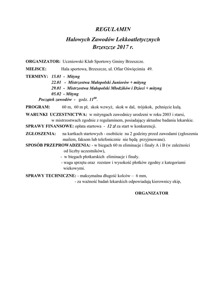REGULAMIN Halowych Zawodów Lekkoatletycznych Brzeszcze 2017 r. ORGANIZATOR: Uczniowski Klub Sportowy Gminy Brzeszcze. MIEJSCE: Hala sportowa, Brzeszcze, ul. Ofiar Oświęcimia 49. TERMINY: 15.01 - Mityng 22.01 - Mistrzostwa Małopolski Juniorów + mityng 29.01 - Mistrzostwa Małopolski Młodzików i Dzieci + mityng 05.02 - Mityng Początek zawodów - godz. 1100. PROGRAM: 60 m, 60 m pł, skok wzwyż, skok w dal, trójskok, pchnięcie kulą. WARUNKI UCZESTNICTWA: w mityngach zawodnicy urodzeni w roku 2003 i starsi, w mistrzostwach zgodnie z regulaminem, posiadający aktualne badania lekarskie. SPRAWY FINANSOWE: opłata startowa - 12 zł za start w konkurencji. ZGŁOSZENIA: na kartkach startowych - osobiście na 2 godziny przed zawodami (zgłoszenia mailem, faksem lub telefonicznie nie będą przyjmowane). SPOSÓB PRZEPROWADZENIA: - w biegach 60 m eliminacje i finały A i B (w zależności od liczby uczestników), - w biegach płotkarskich eliminacje i finały. - waga sprzętu oraz rozstaw i wysokość płotków zgodny z kategoriami wiekowymi. SPRAWY TECHNICZNE: - maksymalna długość kolców – 6 mm, - za ważność badań lekarskich odpowiadają kierownicy ekip, ORGANIZATOR