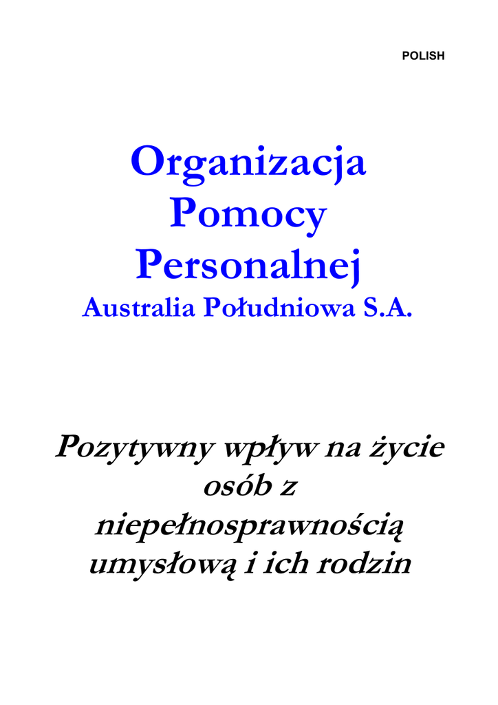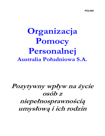 POLISH Organizacja Pomocy Personalnej Australia Poâudniowa S.A. Pozytywny wpâyw na ůycie osób z niepeânosprawnoœciĊ umysâowĊ i ich rodzin Co Organizacja Pomocy Personalnej daje Ludzie często uwaůajĊ, ůe rodzina i pâatni profesjonaliœci sĊ zawsze w stanie zaspokoiý wszystkie potrzeby osób niepeânosprawnych umysâowo. Nie zawsze tak się dzieje. Niektórym rodzinom trudno jest uzyskaý wymaganĊ pomoc, wyszukaý odpowiednie usâugi, czy znaleŭý przyjacióâ o wspólnych zainteresowaniach i podobnych problemach dla syna czy córki z niesprawnoœciĊ umysâowĊ. Tymczasem w waszym œrodowisku mieszkajĊ ludzie chętni do pomocy osobom niesprawnym umysâowo. SĊ to Pomocnicy Personalni: osoby oferujĊca szczerĊ przyjaŭľ uzupeâniajĊcĊ ůycie rodzinne; wolni od formalnoœci, dostępni na dâugo. Organizacja Pomocy Personalnej to próba zapewnienia osobie niesprawnej umysâowo przyjaciela, któremu – tak, jak rodzinie – zaleůy i który w razie potrzeby moůe sâuůyý pomocĊ. Czasami czâonkowie rodziny odczuwajĊ frustrację. Wâaœnie wtedy wsparcie Pomocnika Personalnego moůe się przydaý; szczególnie, jeœli chodzi o przyszâoœý. Pomocnik Personalny dobrze znajĊcy danĊ osobę i jej sytuację rodzinnĊ zdaje sobie sprawę z dodatkowych wymagaľ ciĊůĊcych na rodzinie. Moůe więc on/ona byý tĊ osobĊ, która pomoůe uzyskaý potrzebne usâugi i wyposaůenie oraz będzie dziaâaý na rzecz osoby, której pomaga uczulajĊc na jej problemy. Korzystne dla rodzin jest równieů dzielenie się tak uczuciami radoœci jak i frustracji z kimœ, kto rozumie ich unikalnĊ sytuację. Rodzinom osób niepeãnosprawnych umysãowo A więc kim sĊ ci Pomocnicy Personalni i dlaczego chcĊ się angaůowaý? StanowiĊ oni przekrój spoâeczeľstwa, a âĊczy ich przekonanie, ůe osoby z niepeânosprawnoœciĊ umysâowĊ i ich rodziny majĊ peâne prawo prowadziý takie ůycie, jakie chcĊ. SĊ to ludzie, którzy chcĊ i sĊ w stanie poœwięciý się komuœ ze swojego œrodowiska. Chodzi tu o myœlenie i plany na przyszâoœý. O to, aby pomagaý osobom niepeânosprawnym ůyý jak najpeâniej i budowaý trwaâe zwiĊzki. Prosimy, aby rodziny osób niepeânosprawnych umysâowo zainteresowaây się zaproszeniem Pomocnika Personalnego do wspóâpracy, aby pomóc swym dzieciom maksymalnie rozwinĊý ich moůliwoœci ůyciowe. Organizacja Pomocników Personalnych… x Wzięâa poczĊtek gdy zauwaůono, ůe rodzice martwiĊ się co będzie z ich dzieými gdy ich pomocy zabraknie. x Wspiera jednostki i ich rodziny na caâym œwiecie. x Poœwięca duůo czasu na poznanie danej osoby i jej rodziny. x Dobiera ludziom niepeânosprawnym umysâowo kompetentne osoby o wielkim sercu i postawie obywatelskiej. x Bezustannie wspiera wszystkich Pomocników Personalnych. x Pomaga osobom niepeânosprawnym umysâowo w uczeniu się, w rozwoju i uzyskiwaniu zdolnoœci pokonywania trudów codziennego ůycia. Aby uzyskaý więcej informacji Citizen Advocacy South Australia Inc. Patrick Ruthven – Menadůer Programu Unit 1 / 76 Sturt Street, Adelaide SA 5000 Tel: (08) 8410 6644 Faks: (08) 8410 0388 [email protected] Adres pocztowy: PO Box 6804, Halifax Street Adelaide SA 5000 Organizacja Pomocy Personalnej finansowana jest przez rzĎd australijski poprzez Ministerstwo ds. Rodzin, Spraw Mieszkaniowych, Usãug dla Ludnoħci i Spraw Autochtonicznych