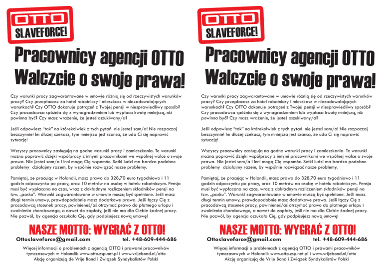 SLAVEFORCE! SLAVEFORCE! Pracownicy agencji OTTO Pracownicy agencji OTTO Walczcie o swoje prawa! Walczcie o swoje prawa! Czy warunki pracy zagwarantowane w umowie różnią się od rzeczywistych warunków pracy? Czy przepłacasz za hotel robotniczy i mieszkasz w niezadowalających warunkach? Czy OTTO dokonuje potrąceń z Twojej pensji w niesprawiedliwy sposób? Czy pracodawca spóźnia się z wynagrodzeniem lub wypłaca kwotę mniejszą, niż powinna być? Czy masz wrażenie, że jesteś oszukiwany/a? Czy warunki pracy zagwarantowane w umowie różnią się od rzeczywistych warunków pracy? Czy przepłacasz za hotel robotniczy i mieszkasz w niezadowalających warunkach? Czy OTTO dokonuje potrąceń z Twojej pensji w niesprawiedliwy sposób? Czy pracodawca spóźnia się z wynagrodzeniem lub wypłaca kwotę mniejszą, niż powinna być? Czy masz wrażenie, że jesteś oszukiwany/a? Jeśli odpowiesz “tak” na którekolwiek z tych pytań nie jesteś sam/a! Nie rozpaczaj bezczynnie! Im dłużej czekasz, tym mniejsza jest szansa, że uda Ci się naprawić sytuację! Jeśli odpowiesz “tak” na którekolwiek z tych pytań nie jesteś sam/a! Nie rozpaczaj bezczynnie! Im dłużej czekasz, tym mniejsza jest szansa, że uda Ci się naprawić sytuację! Wszyscy pracownicy zasługują na godne warunki pracy i zamieszkania. Te warunki można poprawić dzięki współpracy z innymi pracownikami we wspólnej walce o swoje prawa. Nie jesteś sam/a i inni mogą Cię wspomóc. Setki ludzi ma bardzo podobne problemy działajmy razem, by wspólnie rozwiązać nasze problemy. Wszyscy pracownicy zasługują na godne warunki pracy i zamieszkania. Te warunki można poprawić dzięki współpracy z innymi pracownikami we wspólnej walce o swoje prawa. Nie jesteś sam/a i inni mogą Cię wspomóc. Setki ludzi ma bardzo podobne problemy działajmy razem, by wspólnie rozwiązać nasze problemy. Pamiętaj, że pracując w Holandii, masz prawo do 328,70 euro tygodniowo i 11 godzin odpoczynku po pracy, oraz 10 metrów na osobę w hotelu robotniczym. Pensja musi być wypłacana na czas, wraz z dokładnym rozliczeniem składników pensji na tzw. „pasku”. Warunki zagwarantowane w umowie muszą być spełnione. Jeśli masz długi termin umowy, prawdopodobnie masz dodatkowe prawa. Jeśli łączy Cię z pracodawcą stosunek pracy, powinieneś/aś otrzymać prawo do płatnego urlopu i zwolnienia chorobowego, a nawet do zapłaty, jeśli nie ma dla Ciebie żadnej pracy. Nie pozwól, by agencja oszukała Cię, gdy podpisujesz nową umowę! Pamiętaj, że pracując w Holandii, masz prawo do 328,70 euro tygodniowo i 11 godzin odpoczynku po pracy, oraz 10 metrów na osobę w hotelu robotniczym. Pensja musi być wypłacana na czas, wraz z dokładnym rozliczeniem składników pensji na tzw. „pasku”. Warunki zagwarantowane w umowie muszą być spełnione. Jeśli masz długi termin umowy, prawdopodobnie masz dodatkowe prawa. Jeśli łączy Cię z pracodawcą stosunek pracy, powinieneś/aś otrzymać prawo do płatnego urlopu i zwolnienia chorobowego, a nawet do zapłaty, jeśli nie ma dla Ciebie żadnej pracy. Nie pozwól, by agencja oszukała Cię, gdy podpisujesz nową umowę! NASZE MOTTO: WYGRAĆ Z OTTO! [email protected] tel. +48-609-444-686 NASZE MOTTO: WYGRAĆ Z OTTO! [email protected] tel. +48-609-444-686 Więcej informacji o problemach z agencją OTTO i prawami pracowników tymczasowych w Holandii: www.otto.zsp.net.pl i www.vrijebond.nl/otto Akcję organizują de Vrije Bond i Związek Syndykalistów Polski Więcej informacji o problemach z agencją OTTO i prawami pracowników tymczasowych w Holandii: www.otto.zsp.net.pl i www.vrijebond.nl/otto Akcję organizują de Vrije Bond i Związek Syndykalistów Polski