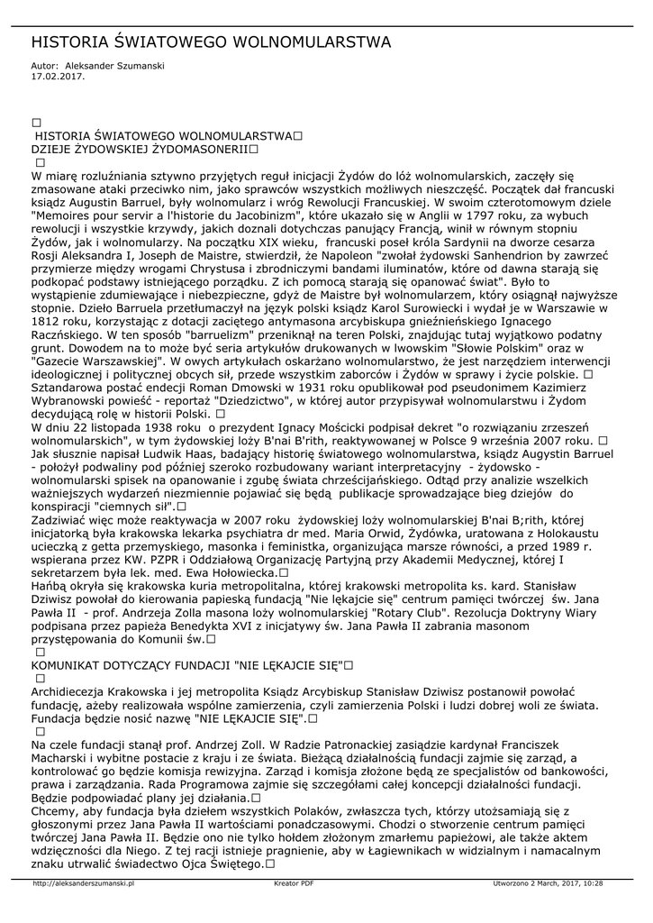 HISTORIA ŚWIATOWEGO WOLNOMULARSTWA Autor: Aleksander Szumanski 17.02.2017. HISTORIA ŚWIATOWEGO WOLNOMULARSTWA DZIEJE ŻYDOWSKIEJ ŻYDOMASONERII W miarę rozluźniania sztywno przyjętych reguł inicjacji Żydów do lóż wolnomularskich, zaczęły się zmasowane ataki przeciwko nim, jako sprawców wszystkich możliwych nieszczęść. Początek dał francuski ksiądz Augustin Barruel, były wolnomularz i wróg Rewolucji Francuskiej. W swoim czterotomowym dziele "Memoires pour servir a l'historie du Jacobinizm", które ukazało się w Anglii w 1797 roku, za wybuch rewolucji i wszystkie krzywdy, jakich doznali dotychczas panujący Francją, winił w równym stopniu Żydów, jak i wolnomularzy. Na początku XIX wieku, francuski poseł króla Sardynii na dworze cesarza Rosji Aleksandra I, Joseph de Maistre, stwierdził, że Napoleon "zwołał żydowski Sanhendrion by zawrzeć przymierze między wrogami Chrystusa i zbrodniczymi bandami iluminatów, które od dawna starają się podkopać podstawy istniejącego porządku. Z ich pomocą starają się opanować świat". Było to wystąpienie zdumiewające i niebezpieczne, gdyż de Maistre był wolnomularzem, który osiągnął najwyższe stopnie. Dzieło Barruela przetłumaczył na język polski ksiądz Karol Surowiecki i wydał je w Warszawie w 1812 roku, korzystając z dotacji zaciętego antymasona arcybiskupa gnieźnieńskiego Ignacego Raczńskiego. W ten sposób "barruelizm" przeniknął na teren Polski, znajdując tutaj wyjątkowo podatny grunt. Dowodem na to może być seria artykułów drukowanych w lwowskim "Słowie Polskim" oraz w "Gazecie Warszawskiej". W owych artykułach oskarżano wolnomularstwo, że jest narzędziem interwencji ideologicznej i politycznej obcych sił, przede wszystkim zaborców i Żydów w sprawy i życie polskie. Sztandarowa postać endecji Roman Dmowski w 1931 roku opublikował pod pseudonimem Kazimierz Wybranowski powieść - reportaż "Dziedzictwo", w której autor przypisywał wolnomularstwu i Żydom decydującą rolę w historii Polski. W dniu 22 listopada 1938 roku o prezydent Ignacy Mościcki podpisał dekret "o rozwiązaniu zrzeszeń wolnomularskich", w tym żydowskiej loży B'nai B'rith, reaktywowanej w Polsce 9 września 2007 roku. Jak słusznie napisał Ludwik Haas, badający historię światowego wolnomularstwa, ksiądz Augystin Barruel - położył podwaliny pod później szeroko rozbudowany wariant interpretacyjny - żydowsko wolnomularski spisek na opanowanie i zgubę świata chrześcijańskiego. Odtąd przy analizie wszelkich ważniejszych wydarzeń niezmiennie pojawiać się będą publikacje sprowadzające bieg dziejów do konspiracji "ciemnych sił". Zadziwiać więc może reaktywacja w 2007 roku żydowskiej loży wolnomularskiej B'nai B;rith, której inicjatorką była krakowska lekarka psychiatra dr med. Maria Orwid, Żydówka, uratowana z Holokaustu ucieczką z getta przemyskiego, masonka i feministka, organizująca marsze równości, a przed 1989 r. wspierana przez KW. PZPR i Oddziałową Organizację Partyjną przy Akademii Medycznej, której I sekretarzem była lek. med. Ewa Hołowiecka. Hańbą okryła się krakowska kuria metropolitalna, której krakowski metropolita ks. kard. Stanisław Dziwisz powołał do kierowania papieską fundacją "Nie lękajcie się" centrum pamięci twórczej św. Jana Pawła II - prof. Andrzeja Zolla masona loży wolnomularskiej "Rotary Club". Rezolucja Doktryny Wiary podpisana przez papieża Benedykta XVI z inicjatywy św. Jana Pawła II zabrania masonom przystępowania do Komunii św. KOMUNIKAT DOTYCZĄCY FUNDACJI "NIE LĘKAJCIE SIĘ" Archidiecezja Krakowska i jej metropolita Ksiądz Arcybiskup Stanisław Dziwisz postanowił powołać fundację, ażeby realizowała wspólne zamierzenia, czyli zamierzenia Polski i ludzi dobrej woli ze świata. Fundacja będzie nosić nazwę "NIE LĘKAJCIE SIĘ". Na czele fundacji stanął prof. Andrzej Zoll. W Radzie Patronackiej zasiądzie kardynał Franciszek Macharski i wybitne postacie z kraju i ze świata. Bieżącą działalnością fundacji zajmie się zarząd, a kontrolować go będzie komisja rewizyjna. Zarząd i komisja złożone będą ze specjalistów od bankowości, prawa i zarządzania. Rada Programowa zajmie się szczegółami całej koncepcji działalności fundacji. Będzie podpowiadać plany jej działania. Chcemy, aby fundacja była dziełem wszystkich Polaków, zwłaszcza tych, którzy utożsamiają się z głoszonymi przez Jana Pawła II wartościami ponadczasowymi. Chodzi o stworzenie centrum pamięci twórczej Jana Pawła II. Będzie ono nie tylko hołdem złożonym zmarłemu papieżowi, ale także aktem wdzięczności dla Niego. Z tej racji istnieje pragnienie, aby w Łagiewnikach w widzialnym i namacalnym znaku utrwalić świadectwo Ojca Świętego. http://aleksanderszumanski.pl Kreator PDF Utworzono 2 March, 2017, 10:28 Archidiecezja Krakowska i jej metropolita Ksiądz Arcybiskup Stanisław Dziwisz pragnie w ten sposób utrwalać spuściznę Jana Pawła II i po raz kolejny sprawić, że Jego osoba zjednoczy ludzi różnych wyznań i narodowości wokół wspólnego dobra. Ks. Dr Robert Nęcek Rzecznik Prasowy Archidiecezji Krakowskiej http://papiez.wiara.pl/doc/372214.Krakow-Papieska-fundacja-Nie-lekajcie-sie SPISEK "NIEWIDZIALNYCH" GNOMÓW Spisek „niewidzialnych” gnomów przeciwko ludzkości przybrał formy organizacyjne choć wyjątkowo utajnione, za sprawą niemieckiego Żyda Adama Weishaupta w drugiej połowie osiemnastego wieku, ale jego niszczycielską siłę nadała mu krzepnąca finansjera brytyjska, potem niemiecka. Już w połowie XVI wieku wielki kapitał międzynarodowy skupiał się głównie w Antwerpii, w granicach Niderlandów należących do Hiszpanii, wtedy największego mocarstwa kolonialnego. Wkrótce potem Wielka Lichwa wije sobie gniazdo w Amsterdamie, a jej sztabem stał się „Amsterdamische Wissełbank”; był wtedy dopiero rok 1609. Pod koniec tego wieku, centrum dowod