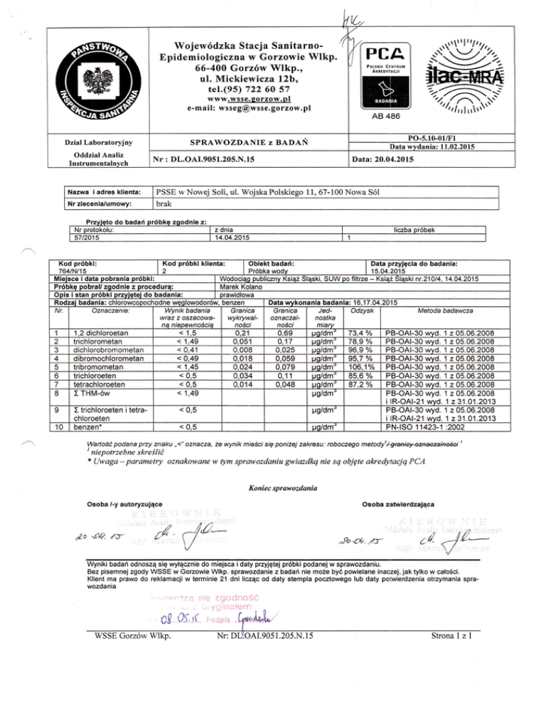 tu, /, Wojew6dzka Stacja Sanitarno- 't Epidemiologiczna w Gorzowie Wlkp. 66-400 Gorz6w Wlkp., ul. Mickiewicza t2b, tel.(95) 722 60 57 Por.sxf C[ilrRUu Axi€oYrAcJl wwwW.P! e4rfirl'ti e-mail: [email protected] AB 486 Oddzial Analiz Instrumentalnvch PSSE w Nowej Soli, ul. Wojska Polskiego 11, 67-100 Nowa 56l Nr zlecenia/umowy: brak noo proDKl KilenE: 2 opis istan probl(i pEyjgtei do badania: ()DreKt Daoan: tJau| przyl9cra do Dadanra: Pr6bka wodv 15.04.2015 Wodociaq publicznv Ksia2 Slaski, SUW po filtze - Ksia;Z Slaski nr.210/4, 14.04.2015 Marek Kolano prawidlowa | Rodzai badania: chlorowcooochodne weolowodor6w. benzen Nr. QZnaczenE: I dichloroetan trichlorometan dichlorobromometan drbromocnlorometan tribromometan trichloroeten tetrachloroeten E THM-6w 10 I trichloroeten i tetrachloroeten benzen* J 4 7 Wynik badania wraz z oszacowa- ''1.2 wvdania: 11.02.2015 Data:20.04.2015 Nazwa iadres klienta: Mieisce i data pobrania pr6bki: Frobl(e Dobrail zqodnie z procedura: z .Data Nr : DL.OAI.9051.205.N.15 KOO prODKl: 764/N/1 5 1 PO-5.10-01/Fl SPRAWOZDANIE z BADAN Dzial Laboratoryjny Liranrca wykrwal- ne nienewno*cie < 1.5 < 1,49 < 0.41 nosci o.21 0,051 < u.49 < 1.45 0.0'18 0,008 <u5 D.024 0.034 < u.5 t1.014 Data wvkonania badania: 16.17.04.2015 eiranrca JedOdzysk nostka oznaczal- no{ci mienl 0.69 o.17 0,025 0,059 0,079 uqldm uq/dm" uo/dm" uq/dm" pg/dm" uo/dm" uq/dm" 0.11 0.048 < 1,49 pg/dm' < 0,5 pg/dm" < 0,5 uq/dm" 73.4 o/o 78,9 0/o 96.9 % 95,7 % 106.1o/o 85.6 % 87.2% Metoda badawcza PB-OA|-30 wvd. 1 z 05.06.2008 PB-OA|-3O wvd. 1 z 05.06.2008 PB-OAI-3O wyd. I z 05.06.2008 PB-9A|-3U wvo. 1 z Ub.U6.ZUU6 PB-OA|-3O wyd. 1 z 05.06.2008 PB-OA|-3O wvd. 1 z 05.06.2008 PB-OA|-30 wvd. 1 z 05.06.2008 PB-OAI-30 wyd. 1 z 05.06.2008 i lR-OA|-21 wvd. 1 z 31.01,2013 FB-OA|-30 wyd. 1 z 05.06.2008 i lR-OAl-21 wvd. 1 z 31.01.2013 PN-ISO 1142';-1 :2OO2 WartoSC podana przy znaku ,,<" oznacza, 2e wynik miesci sie ponizej zakresu: roboczego metodytlgranieyezaaezalnctiei 1 ' niepotrzebne skreilit * Uwaga parametry oznakowane w tym sprawozdaniu gwiazdk4 nie sq objgte alvedytacjq PCA Koniec sprawozdania Osoba /-y autoryzujqce po ,O/t, 20" ,/ -,/c* V u'\l Osoba zatwierdzajqca ^9o,C*.l/f ,o ,/n Wyniki badafi odnoszq sig wylqcznie do miejsca idaty przyjetej pr6bki podanej w sprawozdaniu. Bez pisemnej zgody WSSE w Gorzowie Wlkp. sprawozdanie z badai nie moze byd powielane inaczej, jak tylko w calo6ci. Klient ma prawo do reklamacji w terminie 21 dni liczqc od daty stempla pocztowego lub daty potwierdzenia otzymania sprawozdania