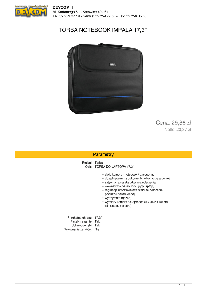 DEVCOM II Al. Korfantego 81 - Katowice 40-161 Tel. 32 259 27 19 - Serwis: 32 259 22 60 - Fax: 32 258 05 53 TORBA NOTEBOOK IMPALA 17,3'' Cena: 29,36 zł Netto: 23,87 zł Parametry Rodzaj Torba Opis TORBA DO LAPTOPA 17,3'' dwie komory - notebook / akcesoria, duża kieszeń na dokumenty w komorze głównej, sztywna rama absorbująca uderzenia, wewnętrzny pasek mocujący laptop, regulacja umożliwiajaca stabilne położenie poduszki naramiennej, wytrzymała rączka, wymiary komory na laptopa: 45 x 34,5 x 50 cm (dł. x szer. x przek.) Przekątna ekranu Pasek na ramię Uchwyt do ręki Wykonanie ze skóry 17,3'' Tak Tak Nie 1/1 Powered by TCPDF (www.tcpdf.org)