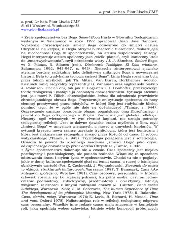 o. prof. Dr hab. Piotr Liszka CMF o. prof. Dr hab. Piotr Liszka CMF 51-611 Wrocław, ul. Wieniawskiego 38 www.piotr-liszka.strefa.pl + Życie społeczeństwa bez Boga Śmierć Boga Hasło w Słowniku Teologicznym wydanym w Salamance w roku 1992 opracował Juan José Sánchez. Wyrażenie chrześcijańskie śmierć Boga odnoszone do śmierci Jezusa Chrystusa na krzyżu, u Hegla otrzymało znaczenie filozoficzne, wskazująca na nieobecność Boga w społeczeństwie, na ateizm współczesnej Europy. Hegel interpretuje ateizm społeczny jako „wielki piątek”, czyli konieczny krok do „zmartwychwstania”, czyli odrodzenia wiary /J. J. Sánchez, Śmierć Boga, w: X. Pikaza, N. Silanes (red.), Diccionario Teológico. El Dios cristiano, Salamanca 1992, 943-947, s. 943/. Nietzsche zinterpretował zjawisko ateizmu bardziej radykalnie, jako definitywne zniknięcie Boga w nowoczesnej historii. Była to „radykalna teologia śmierci Boga”. Linia Hegla rozwijana była przez takich myślicieli, jak Th. Alitzer, Van Buren, Horkheimer, Adorno. Kierunek mniej radykalny reprezentuje G. Vahanian oraz anglikański biskup J. Robinson. Chcieli oni, tak jak F. Gogarten i D. Bonhöffer, przezwyciężyć teorię teologiczną i zastąpić ją osobistym doświadczeniem. Sytuacja ateizmu jest, jak mówi P. Tillich, chrześcijańskim kairos dla odrodzenia prawdziwie chrześcijańskiego obrazu Boga. Przyrównuje on sytuację społeczną do nocy ciemnej przeżywanej przez mistyków, w której Bóg jest radykalnie blisko, pomimo tego, że w ogóle nie daje się doświadczyć /Tamże, s. 944/. Oczyszczenie oznacza porzucenie obrazu pogańskiego oraz filozoficznego i powrót do Boga odkrywanego w Krzyżu. Konieczna jest głęboka refleksja. Niestety, ogół wierzących, w tym również kapłani, nie uznają potrzeby teologicznej refleksji. Jest to dziwne zjawisko braku myślenia o Nim, czyli „śmierci Boga” w umysłach wierzących, a nawet w umysłach kapłanów. W sytuacji kryzysu nową szansę uzyskuje trynitologia, która jest konieczna i która jest nakazywana szczególnie mocno przez Kościół od czasu II soboru watykańskiego /Tamże, s. 945/. Trynitologia połączona jest z soteriologią. Oznacza to powrót do rdzennego znaczenia „śmierci Boga” jako czynu odkupieńczego dokonanego przez Jezusa Chrystusa /Tamże, s. 946. + Życie społeczeństwa dokonuje się w czasie. Czas społeczny jest niejako postfizyczny i postbiologiczny, ale posiada realność. Wiąże się ze sposobem odczuwania czasu i stylem życia w społeczeństwie. Chodzi tu nie o poglądy, jakie w danej kulturze społeczność głosi na temat czasu, a raczej o istniejącą obiektywnie wartość (Por. Z. Cackowski, J. Wojczakowski, Stosunek do czasu w różnych strukturach kulturowych, Warszawa 1987; T. Banaszyk, Czas jako kategoria społeczna, Wrocław 1981). Czas osobowy, personalny, w którym człowiek rozwija się ku wyższej jedności, ku pełni osoby. Jest on jednocześnie podmiotowy, subiektywny, przedmiotowy i obiektywny. Istnieją wzajemne zależności z innymi rodzajami czasów (J. Guitton, Sens czasu ludzkiego, Warszawa 1986; C. M. Scherover, The humen Experience of Time The development of its philosophic Meaning, New York 1975; R. Balandin, Czas, ziemia, mózg, Warszawa 1976; E. Levis, B. Richard, H. Messel, Time and man, Oxford 1978). Najistotniejszą rolę w refleksji teologicznej odgrywa czas personalny. Wszelkie inne rodzaje czasu mają znaczenie w kontekście roli, jaką spełniają wobec człowieka. Istnieje wiele koncepcji próbujących 1 o. prof. Dr hab. Piotr Liszka CMF ująć systematycznie czas osobowy z innymi rodzajami czasu. Po Soborze Watykańskim II teologia stara się nadążać za najnowszymi osiągnięciami nauk o człowieku i społeczeństwie. Stanowią one fundament refleksji teologicznych nad czasem personalnym i społecznym. Współczesne przemyślenia historyków pozwalają tworzyć teologię historii oraz zastanawiać się odpowiednio szeroko nad zbawczą wartością czasu zdarzeniowego. Czas geobiologiczny w sposób szczególny był przedmiotem twórczych refleksji Teilharda de Chardina i jego zwolenników TH1 23. + Życie społeczeństwa Hiszpanii wieku XV odnowione zaowocowało nową duchowością. Głębokie było pragnienie rozwoju życia wewnętrznego, w którym człowiek spotyka się z Bogiem. Powiązane to było z mniejszą troską o ceremonie zewnętrzne, które były w owym czasie przesadne i wymagały oczyszczenia. Znaki liturgiczne przesadnie rozbudowane gasiły pobożność, zamiast ją rozbudzać i gwarantować. Liturgia jako taka nie była kwestionowana, jako oczywisty i zwyczajny sposób uświęcenia /M. Bataillon, Erasmo y España. Estudios sobre la historia espiritual del siglo XVI, México 1966, s. 306/. Ważne było to, ze cnoty osobiste były cenione bardziej niż dzieł zewnętrzne, ryty, ceremonie i cały zewnętrzny rygor. Zasady chrześcijańskie powinny być interioryzowane i przeżywane w sercu. Duchowość hiszpańska wieku XVI przeszła od obiektywności do subiektywności, od czynu zewnętrznego do przeżycia wewnętrznego. Podkreślane było to, co wewnętrzne, ale zapominano o tym, co zewnętrzne. We wszystkim jednak odczuwane było pragnienie powrotu do źródeł objawienia. Na tej drodze natrafiano też na wielkie postacie, takie jak Bonawentura, Augustyn, Dionizy Pseudo Areopagita, ale ostatecznym fundamentem było Pismo Święte, które było czytane często przez wszystkich /M. Andrés, Los recogidos, Madrid 1975, s. 26/. Ożywienie literackie wieku XVI również było powiązane z tendencją powrotu do źródeł, do takich postaci jak: Seneka, Platon, czy Arystoteles, którzy bardzo często byli cytowani również przez mistyków /Zachwyt nad dziełami Seneki był charakterystyczny dla pre-renesansu w Kastylli. Były one tłumaczone na język kastylijski w połowie wieku XV przez Alonso de Cartagena i cytowane często przez autorów mistycznych. Idee Seneki dot