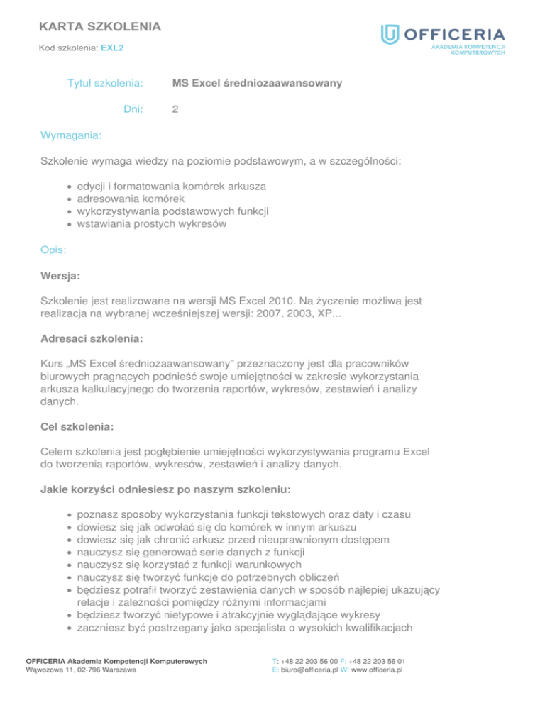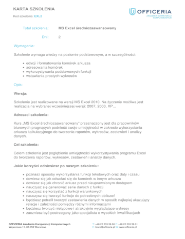 KARTA SZKOLENIA Kod szkolenia: EXL2 Tytuł szkolenia: Dni: MS Excel średniozaawansowany 2 Wymagania: Szkolenie wymaga wiedzy na poziomie podstawowym, a w szczególności: edycji i formatowania komórek arkusza adresowania komórek wykorzystywania podstawowych funkcji wstawiania prostych wykresów Opis: Wersja: Szkolenie jest realizowane na wersji MS Excel 2010. Na życzenie możliwa jest realizacja na wybranej wcześniejszej wersji: 2007, 2003, XP... Adresaci szkolenia: Kurs „MS Excel średniozaawansowany” przeznaczony jest dla pracowników biurowych pragnących podnieść swoje umiejętności w zakresie wykorzystania arkusza kalkulacyjnego do tworzenia raportów, wykresów, zestawień i analizy danych. Cel szkolenia: Celem szkolenia jest pogłębienie umiejętności wykorzystywania programu Excel do tworzenia raportów, wykresów, zestawień i analizy danych. Jakie korzyści odniesiesz po naszym szkoleniu: poznasz sposoby wykorzystania funkcji tekstowych oraz daty i czasu dowiesz się jak odwołać się do komórek w innym arkuszu dowiesz się jak chronić arkusz przed nieuprawnionym dostępem nauczysz się generować serie danych z funkcji nauczysz się korzystać z funkcji warunkowych nauczysz się tworzyć funkcje do potrzebnych obliczeń będziesz potrafił tworzyć zestawienia danych w sposób najlepiej ukazujący relacje i zależności pomiędzy różnymi informacjami będziesz tworzyć nietypowe i atrakcyjnie wyglądające wykresy zaczniesz być postrzegany jako specjalista o wysokich kwalifikacjach OFFICERIA Akademia Kompetencji Komputerowych Wąwozowa 11, 02-796 Warszawa T: +48 22 203 56 00 F: +48 22 203 56 01 E: [email protected] W: www.officeria.pl KARTA SZKOLENIA Kod szkolenia: EXL2 Proponowane szkolenia wcześniejsze MS Excel podstawowy Program szkolenia: 1. Przypomnienie podstawowych informacji o programie MS Excel 1. Edycja komórek 2. Adresowanie komórek 3. Podstawowe formuły 4. Wykresy 2. Formuły 1. Funkcje czasu i daty 2. Funkcje tekstowe 3. Funkcja warunkowa jeżeli 4. Adresowanie komórek z innych arkuszy 3. Generowanie serii danych z funkcji 4. Formatowanie warunkowe 5. Budowanie własnych funkcji 6. Bazy danych w Excelu 1. Tworzenie tabel 2. Sortowanie i autofiltry 3. Filtrowanie zaawansowane 4. Usuwanie duplikatów 5. Konsolidacja danych 6. Sumy częściowe i konspekty 7. Pobieranie danych ze źródeł zewnętrznych 8. Scalanie danych z wielu arkuszy 9. Łącza w arkuszu 1. Tworzenie odwołań zewnętrznych 2. Modyfikowanie danych źródłowych 10. Formularze 11. Sumy częściowe 12. Tabele przestawne 13. Wykresy przestawne 14. Wykresy niestandardowe 15. Wykresy oparte o pogrupowane dane 16. Wykresy częstości 17. Ochrona arkusza OFFICERIA Akademia Kompetencji Komputerowych Wąwozowa 11, 02-796 Warszawa Powered by TCPDF (www.tcpdf.org) T: +48 22 203 56 00 F: +48 22 203 56 01 E: [email protected] W: www.officeria.pl