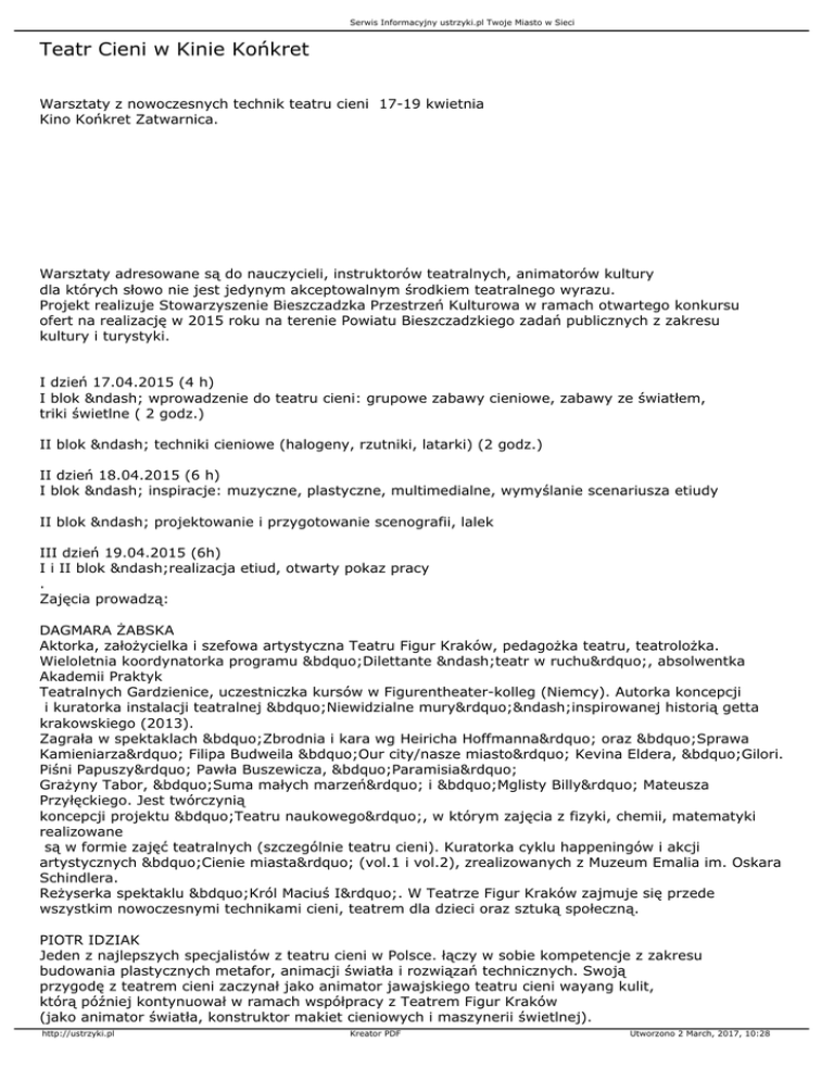 Serwis Informacyjny ustrzyki.pl Twoje Miasto w Sieci Teatr Cieni w Kinie Końkret Warsztaty z nowoczesnych technik teatru cieni 17-19 kwietnia Kino Końkret Zatwarnica. Warsztaty adresowane są do nauczycieli, instruktorów teatralnych, animatorów kultury dla których słowo nie jest jedynym akceptowalnym środkiem teatralnego wyrazu. Projekt realizuje Stowarzyszenie Bieszczadzka Przestrzeń Kulturowa w ramach otwartego konkursu ofert na realizację w 2015 roku na terenie Powiatu Bieszczadzkiego zadań publicznych z zakresu kultury i turystyki. I dzień 17.04.2015 (4 h) I blok – wprowadzenie do teatru cieni: grupowe zabawy cieniowe, zabawy ze światłem, triki świetlne ( 2 godz.) II blok – techniki cieniowe (halogeny, rzutniki, latarki) (2 godz.) II dzień 18.04.2015 (6 h) I blok – inspiracje: muzyczne, plastyczne, multimedialne, wymyślanie scenariusza etiudy II blok – projektowanie i przygotowanie scenografii, lalek III dzień 19.04.2015 (6h) I i II blok –realizacja etiud, otwarty pokaz pracy . Zajęcia prowadzą: DAGMARA ŻABSKA Aktorka, założycielka i szefowa artystyczna Teatru Figur Kraków, pedagożka teatru, teatrolożka. Wieloletnia koordynatorka programu „Dilettante –teatr w ruchu”, absolwentka Akademii Praktyk Teatralnych Gardzienice, uczestniczka kursów w Figurentheater-kolleg (Niemcy). Autorka koncepcji i kuratorka instalacji teatralnej „Niewidzialne mury”–inspirowanej historią getta krakowskiego (2013). Zagrała w spektaklach „Zbrodnia i kara wg Heiricha Hoffmanna” oraz „Sprawa Kamieniarza” Filipa Budweila „Our city/nasze miasto” Kevina Eldera, „Gilori. Piśni Papuszy” Pawła Buszewicza, „Paramisia” Grażyny Tabor, „Suma małych marzeń” i „Mglisty Billy” Mateusza Przyłęckiego. Jest twórczynią koncepcji projektu „Teatru naukowego”, w którym zajęcia z fizyki, chemii, matematyki realizowane są w formie zajęć teatralnych (szczególnie teatru cieni). Kuratorka cyklu happeningów i akcji artystycznych „Cienie miasta” (vol.1 i vol.2), zrealizowanych z Muzeum Emalia im. Oskara Schindlera. Reżyserka spektaklu „Król Maciuś I”. W Teatrze Figur Kraków zajmuje się przede wszystkim nowoczesnymi technikami cieni, teatrem dla dzieci oraz sztuką społeczną. PIOTR IDZIAK Jeden z najlepszych specjalistów z teatru cieni w Polsce. łączy w sobie kompetencje z zakresu budowania plastycznych metafor, animacji światła i rozwiązań technicznych. Swoją przygodę z teatrem cieni zaczynał jako animator jawajskiego teatru cieni wayang kulit, którą później kontynuował w ramach współpracy z Teatrem Figur Kraków (jako animator światła, konstruktor makiet cieniowych i maszynerii świetlnej). http://ustrzyki.pl Kreator PDF Utworzono 2 March, 2017, 10:28 Serwis Informacyjny ustrzyki.pl Twoje Miasto w Sieci Współpracownik Małopolskiego Instytutu Kultury w ramach programów: „Dynamika ekspozycji” oraz „Dilettante –teatr w ruchu” w latach 2001-2009 zaangażowany w tworzenie wiosek tematycznych w woj. zachodniopomorskim. Antropolog kultury, socjolog, twórca scenariuszy wystaw dla muzeów oraz gier planszowych i terenowych. Ilość miejsc -18. Zapisy i więcej informacji –koordynator projektu Jola Jarecka 607068094 Źródło:Starostwo Powiatowe w Ustrzykach Dolnych Skomentuj to na FORUM DYSKUSYJNYM Wydawca portalu http://ustrzyki.pl Kreator PDF Utworzono 2 March, 2017, 10:28 Serwis Informacyjny ustrzyki.pl Twoje Miasto w Sieci ustrzyki.pl nie ponosi odpowiedzialności za treść komentarzy zamieszczanych przez użytkowników. Osoby http://ustrzyki.pl Kreator PDF Utworzono 2 March, 2017, 10:28 Serwis Informacyjny ustrzyki.pl Twoje Miasto w Sieci zamieszczające wypowiedzi naruszające prawo lub prawem chronione http://ustrzyki.pl Kreator PDF Utworzono 2 March, 2017, 10:28 Serwis Informacyjny ustrzyki.pl Twoje Miasto w Sieci dobra osób trzecich mogą ponieść z tego tytułu odpowiedzialność karną http://ustrzyki.pl Kreator PDF Utworzono 2 March, 2017, 10:28 Serwis Informacyjny ustrzyki.pl Twoje Miasto w Sieci lub cywilną. http://ustrzyki.pl Kreator PDF Utworzono 2 March, 2017, 10:28