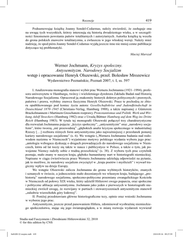 Recenzje 419 Podsumowując książkę Joanny Sondel-Cedarmas, należy stwierdzić, że zasługuje ona na uwagę tych wszystkich, którzy interesują się historią dwudziestego wieku, a w szczególności fenomenem powstania państw totalitarnych i autorytarnych. Autorka książką tą weszła do grona polskich znawców totalitaryzmu, a zwłaszcza w jego włoskiej wersji. Należy mieć nadzieję, że spod pióra Joanny Sondel-Cedamas wyjdą jeszcze inne nie mniej cenne publikacje dotyczące tej problematyki. Maciej Marszał Werner Jochmann, Kryzys społeczny. Antysemityzm. Narodowy Socjalizm wstęp i opracowanie Henryk Olszewski, przeł. Bolesław Mrozewicz Wydawnictwo Poznańskie, Poznań 2007, t. I, ss. 597 I. Analizowana monografia stanowi wybór prac Wernera Jochmanna (1921–1994), profesora uniwersytetu w Hamburgu, twórcy i wieloletniego dyrektora Zakładu Badań nad Historią Narodowego Socjalizmu. Opracował ją znakomity historyk doktryn politycznych i prawnych, państwa i prawa, wybitny znawca faszyzmu Henryk Olszewski. Prace te pochodzą ze zbioru opublikowanego pod koniec życia autora: Gesellschaftskrise und Judendfeindschaft in Deutschland 1870–1945 (Christians-Verlag, Hamburg 1988), a także napisanej z Günterem Brackelmannem i Martinem Greschatem rozprawy Protestantismus und Politik. Werk und Wirkung Adolf Stoeckers (Hamburg 1982) oraz z Ursulą Büttner Hamburg auf dem Weg ins Dritte Reich (Hamburg 1983). W tytule tej monografii Olszewski połączył trzy charakterystyczne dla rozważań Jochmanna pojęcia: „kryzys społeczny”, „antysemityzm” oraz „narodowy socjalizm”, które tworzą „nić przewodnią” „głębokich analiz kryzysu społecznego w industrialnej Rzeszy […] rozbioru różnych form antysemityzmu jako najważniejszej z przesłanek ponurej kariery narodowego socjalizmu” (s. 6). We wstępie („Wernera Jochmanna badania nad rodowodem nazizmu w Niemczech”) wyjaśniono motywy polskiego wydania wyboru jego prac: „antologia wzbogaca dyskusję o drogach prowadzących do narodowego socjalizmu w Niemczech, która od lat toczy się także w nauce i publicystyce w Polsce, a także o tym, jak powojenne Niemcy radziły sobie z trudną przeszłością” (s. 38). Z wyboru tych prac czytelnik poznaje, mało znany w naszym kraju, głęboko humanitarny nurt w historiografii niemieckiej. Napisane w ciągu ćwierćwiecza prace Wernera Jochmanna udzielają odpowiedzi na pytanie, jak to możliwe, że narodowy socjalizm zwyciężył w „kraju poetów i myślicieli” i wywarł tragiczny wpływ na dzieje Europy. We wstępie Olszewski zalicza Jochmanna do grona wybitnych historyków, znanych i uznanych w świecie, a jednocześnie mało docenianych we własnym kraju, badającego „prehistorię” narodowego socjalizmu, społeczno-polityczne przemiany ewangelickiego Kościoła w Niemczech od połowy XIX wieku, który udzielił Hitlerowi swego poparcia, oraz społeczne i polityczne afiliacje antysemityzmu. Jochmann jako jeden z pierwszych w historiografii niemieckiej zwrócił uwagę, że rozwijany w partiach i stowarzyszeniach antysemityzm stanowił „zaledwie wierzchołek góry lodowej”. II. Poniżej przedstawiam główne historiograficzne tezy, opinie oraz wnioski Jochmanna w wyborze jego prac. Antysemityzm, jeszcze przed panowaniem Hitlera, zdominował wyobraźnię niemieckiego społeczeństwa, stając się jego światopoglądem, a w miarę rozwoju wydarzeń wywierał Studia nad Faszyzmem i Zbrodniami Hitlerowskimi 32, 2010 © for this edition by CNS SnFiZH 32 imrpim.indb 419 2010-09-16 09:27:59 420 Recenzje coraz większy wpływ na politykę, ustrój i mentalność szerokich warstw społecznych. Hitler nie wymyślił kompleksów, obaw czy fobii, ale jedynie umiejętnie je wykorzystał, w swej polityce; „nie tylko oszukał naród i podstępnie go uwiódł, ale i w znacznym stopniu – znacznie wyższym, niż wielu chciałoby to przyjąć do wiadomości – go reprezentował” (s. 8). Antysemityzm był następstwem zjednoczenia Niemiec w 1871 r. Korzenie jego tkwiły jeszcze w gospodarczych i społecznych przeobrażeniach, poprzedzających powstanie cesarstwa. Antysemityzm i kryzys społeczny szły w parze. Kryzys pobudzał poczucie zagrożenia oraz frustracje, a rozczarowanie i gniew rodziły wrogość w stosunku do odpowiedzialnych za zło. Żydzi pomimo wyzwolenia się w gospodarce kapitalistycznej ze społecznego upośledzenia szybko tracili polityczne oparcie. Pozostali symbolem tego, co antynarodowe, nieprzyjazne integracji, co osłabia poczucie bezpiecznej więzi. Antysemickie hasła wzywały do narodowej solidarności i do stworzenia „narodu bez Żydów”. Początkowo krążyły wokół elit, aby zjednoczyć naród w obronie monarchii i przedziałów stanowych. Opanowały partie prawicy, uzyskały wstęp na uniwersytety, przewagę w ówczesnych mediach, po czym „szerokim strumieniem” weszły na prowincję. Pozyskały zwolenników nie tylko wśród nauczycieli, lekarzy, pastorów czy kupców, ale również wśród przedstawicieli arystokracji. W rezultacie zapewniły „niekwestionowane poparcie aparatu państwa” już kilka lat po jego zjednoczeniu. Tzw. kwestia żydowska stała się sprawą polityczną, która z faktycznym statusem i postawą Żydów nie miała nic wspólnego. Antysemici znaleźli sojusznika w narastającym nacjonalizmie. Nastąpiło złowrogie połączenie „sprawy żydowskiej” ze „sprawą niemiecką”: nacjonalizm implikował rasizm i wyrażający go antysemityzm. W literaturze uznawano Żydów za głównych wrogów Rzeszy. Antysemityzm powiązany z „protestantyzmem, darwinizmem społecznym i imperialną polityką czynił zeń beczkę prochu”, co wkrótce miała ukazać pierwsza wojna światowa. A przecież Żydzi jednoznacznie i z przekonaniem demonstrowali swoją przynależność do niemieckiej wspólnoty narodowej. Co więcej popierali hasła „teologii wojny” i bohatersko walczyli na froncie u bo