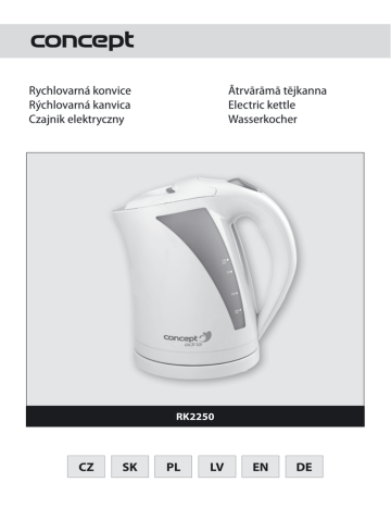 Rychlovarná konvice Rýchlovarná kanvica Czajnik elektryczny Ātrvārāmā tējkanna Electric kettle Wasserkocher RK2250 CZ SK PL LV EN DE CZ PODĚKOVÁNÍ Děkujeme Vám, že jste si zakoupili výrobek značky Concept a přejeme Vám, abyste byli s naším výrobkem spokojeni po celou dobu jeho používání. Před prvním použitím prostudujte pozorně celý návod k obsluze a potom si jej uschovejte. Zajistěte, aby i ostatní osoby, které budou s výrobkem manipulovat, byly seznámeny s tímto návodem. Technické parametry Napětí 220-240 V ~ 50/60 Hz Příkon 2000 W Objem 1,7 l DŮLEŽITÁ BEZPEČNOSTNÍ UPOZORNĚNÍ: • Nepoužívejte spotřebič jinak, než je popsáno v tomto návodu. • Před prvním použitím odstraňte ze spotřebiče všechny obaly a marketingové materiály. • Ověřte, zda připojované napětí odpovídá hodnotám na typovém štítku spotřebiče. Používejte pouze zásuvky elektrického napětí s ochranným kolíkem. • Spotřebič je během provozu i určitou dobu po vypnutí horký. Nedotýkejte se proto horkých povrchů. Z důvodu nebezpečí popálení používejte pouze držadlo a tlačítka. • Spotřebič nečistěte, neukládejte ani nezakrývejte, dokud úplně nevychladl. • Nenechávejte spotřebič bez dozoru, pokud je zapnutý, popřípadě zapojený do zásuvky elektrického napětí. • Nikdy nepřenášejte spotřebič během provozu nebo pokud je ještě horký. Nepřenášejte jej za přívodní kabel. • Před připojením nebo vypojením spotřebiče ze zásuvky elektrického napětí se ujistěte, že je vypínač v poloze vypnuto. • Při vypojování spotřebiče ze zásuvky elektrického napětí nikdy netahejte za přívodní kabel, ale uchopte zástrčku a tahem ji vypojte. • Nedovolte dětem a nesvéprávným osobám se spotřebičem manipulovat, používejte ho mimo jejich dosahu. • Osoby se sníženou pohybovou schopností, se sníženým smyslovým vnímáním, s nedostatečnou duševní způsobilostí nebo osoby neseznámené s obsluhou musí používat spotřebič jen pod dozorem zodpovědné a s obsluhou seznámené osoby. • Dbejte zvýšené opatrnosti, pokud je spotřebič používán v blízkosti dětí. • Nedovolte, aby byl spotřebič používán jako hračka. • Nepoužívejte jiné příslušenství, než je doporučeno výrobcem. • Před čištěním a po použití spotřebič vypněte, vypojte ze zásuvky elektrického napětí a nechte vychladnout. • Nenechávejte přívodní kabel viset volně přes hranu stolu. Dbejte na to, aby se nedotýkal horkých povrchů. • Spotřebič umístěte pouze na stabilní a tepelně odolný povrch stranou od jiných zdrojů tepla jako jsou radiátory, trouby apod. Chraňte jej před přímým slunečním zářením a vlhkostí. • Před připojením k síti musí být ve spotřebiči voda. • Nedoplňujte vodu, pokud je spotřebič na podstavci! • Po naplnění spotřebiče vodou se přesvědčte, že je naspodu suchý. Případné kapky před postavením na podstavec otřete! • Spotřebič je určen pro ohřev vody dle doporučeného maxima - při větším množství vody, než je doporučené RK2250 1 CZ maximum, může dojít k vystřikování vroucí vody - NEBEZPEČÍ OPAŘENÍ! • Před zapnutím spotřebiče se přesvědčte, že je řádně uzavřeno víko. Neotvírejte ho během ohřevu vody, aby nedošlo k opaření. • Spotřebič nedoporučujeme používat k ohřevu jiných kapalin, než je voda. • Nezapínejte spotřebič bez vody. Pokud by přesto došlo k zapnutí prázdného spotřebiče, bezpečnostní pojistka ho automaticky vypne. Poté nechte spotřebič vychladnout, naplňte ho studenou vodou a můžete ho dále používat. • Dbejte zvýšené opatrnosti při otvírání víka, pokud plníte horkou konvici znovu vodou. • Při manipulaci se spotřebičem postupujte tak, aby nedošlo k opaření vařící vodou. Vždy držte spotřebič za držadlo, protože tělo konvice může být horké, a mohlo by dojít k popálení. • Horkou vodu vylévejte pomalu, při nadměrném naklonění se může stát, že voda poteče také víkem - NEBEZPEČÍ OPAŘENÍ! • K čištění spotřebiče nepoužívejte hrubé a chemicky agresivní látky. • Nepoužívejte spotřebič, pokud nepracuje správně, byl-li upuštěn, poškozen nebo namočen do kapaliny. Dejte ho přezkoušet a opravit autorizovaným servisním střediskem. • Nepoužívejte spotřebič s poškozeným přívodním kabelem či zástrčkou, nechte závadu neprodleně odstranit autorizovaným servisním střediskem. • Spotřebič nepoužívejte ve venkovním prostředí. • Spotřebič je vhodný pouze pro použití v domácnosti, není určen pro komerční použití. • Neponořujte přívodní kabel, zástrčku nebo spotřebič do vody ani do jiné kapaliny. • Neopravujte spotřebič sami. Obraťte se na autorizovaný servis. Nedodržíte-li pokyny výrobce, nemůže být případná oprava uznána jako záruční. POPIS VÝROBKU 1. Víko 2. Kontrolka provozu 3. Vodoznak 4. Tlačítko otevírání víka 5. Držadlo 6. Vypínač 7. Podstavec s přívodním kabelem 1 4 6 5 3 2 7 2 RK2250 CZ UPOZORNĚNÍ: Před prvním použitím doporučujeme minimálně 3x uvařit vodu v maximálním množství a tu vylít. Teprve poté je konvice připravena k použití. Konvice se smí používat pouze s podstavcem, se kterým je dodávána. NÁVOD K OBSLUZE 1. Konvici sejměte z podstavce (7), stiskněte tlačítko (4), otevřete víko (1) a naplňte ji studenou vodou - pouze do povoleného maxima. Pokud by hladina byla nižší než doporučené minimum, konvice by se přehřívala a vypínala by předčasně. Pozn.: Ujistěte se, že je víko (1) správně zavřené, jinak by se konvice automaticky nevypnula. 2. Konvici umístěte na podstavec (7) - dojde k automatickému propojení elektrických kontaktů. Vzhledem ke konstrukci středového konektoru 