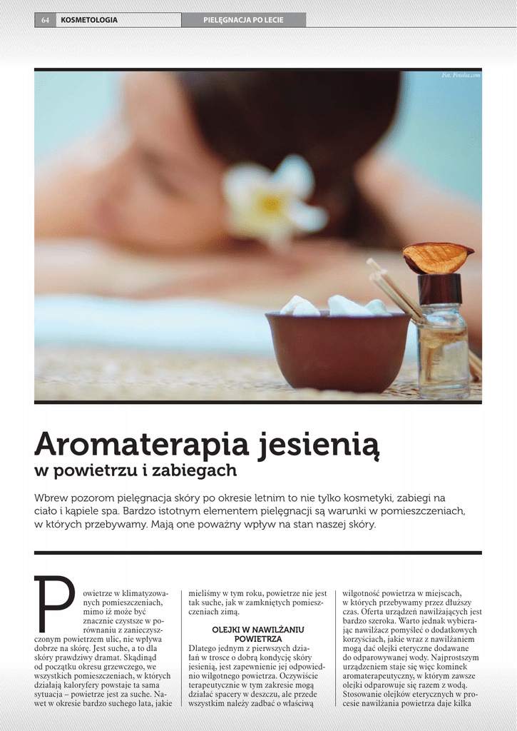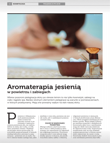 64 KOSMETOLOGIA PIELĘGNACJA PO LECIE Fot. Fotolia.com Aromaterapia jesienią w powietrzu i zabiegach Wbrew pozorom pielęgnacja skóry po okresie letnim to nie tylko kosmetyki, zabiegi na ciało i kąpiele spa. Bardzo istotnym elementem pielęgnacji są warunki w pomieszczeniach, w których przebywamy. Mają one poważny wpływ na stan naszej skóry. P owietrze wbklimatyzowanych pomieszczeniach, mimo iĝ moĝe byÊ znacznie czystsze wbporównaniu zbzanieczyszczonym powietrzem ulic, nie wpïywa dobrze na skórÚ. Jest suche, abto dla skóry prawdziwy dramat. SkÈdinÈd od poczÈtku okresu grzewczego, we wszystkich pomieszczeniach, wbktórych dziaïajÈ kaloryfery powstaje ta sama sytuacja –bpowietrze jest za suche. Nawet wbokresie bardzo suchego lata, jakie mieliĂmy wbtym roku, powietrze nie jest tak suche, jak wbzamkniÚtych pomieszczeniach zimÈ. OLEJKI W NAWILŻANIU POWIETRZA Dlatego jednym zbpierwszych dziaïañ wbtrosce obdobrÈ kondycjÚ skóry jesieniÈ, jest zapewnienie jej odpowiednio wilgotnego powietrza. OczywiĂcie terapeutycznie wbtym zakresie mogÈ dziaïaÊ spacery wbdeszczu, ale przede wszystkim naleĝy zadbaÊ obwïaĂciwÈ wilgotnoĂÊ powietrza wbmiejscach, wbktórych przebywamy przez dïuĝszy czas. Oferta urzÈdzeñ nawilĝajÈcych jest bardzo szeroka. Warto jednak wybierajÈc nawilĝacz pomyĂleÊ obdodatkowych korzyĂciach, jakie wraz zbnawilĝaniem mogÈ daÊ olejki eteryczne dodawane do odparowywanej wody. Najprostszym urzÈdzeniem staje siÚ wiÚc kominek aromaterapeutyczny, wbktórym zawsze olejki odparowuje siÚ razem zbwodÈ. Stosowanie olejków eterycznych wbprocesie nawilĝania powietrza daje kilka 05/2015 zapachu, kominek aromaterapeutyczny efektów. Wiele zbnich ma korzystne odzbwodÈ ibmoĝna zapomnieÊ objesiennych dziaïywanie na stan skóry –bjej wilgotproblemach. Jak dozowaÊ olejek? DawnoĂÊ, gïadkoĂÊ, koloryt. Ponadto, obczym ka to okoïo 5 kropli olejku lub mieszanwarto pamiÚtaÊ –bwbponure, stresujÈce ki na dobÚ na 10bm3 wb3 –b4 porcjach. jesienne dni, olejki znakomicie mogÈ poprawiÊ nastrój. Tak wiÚc wbpokoju obpowierzchni 20bm2 PierwszÈ grupÈ olejków speïniajÈcych wkrapla siÚ do wody 5-6 kropli 3 razy na wiele poĝytecznych funkcji sÈ eteryczdobÚ, dawkÚ moĝna zmniejszyÊ wbzane olejki cytrusowe. Olejek cytrynowy leĝnoĂci od upodobañ, ale nie naleĝy jej obrzeĂkim odĂwieĝajÈcym zapachu, styprzekraczaÊ. Bardzo dobrze sprawdzajÈ mulujÈcym, abjednoczeĂnie ïagodzÈcym siÚ teĝ tu nawilĝacze zbdyspergatorem napiÚcia nerwowe, pozwala ïatwiej sproultraděwiÚkowym. staÊ codziennym obowiÈzkom ibbÚdzie pobudzaÊ do dziaïania. Takĝe znany ze AROMATERAPIA swoich wïaĂciwoĂci ïagodzÈcych stres W ZABIEGACH NA SKÓRĘ Drugim obszarem jesiennych zastosoolejek grejpfrutowy doskonale poprawi wañ aromaterapii sÈ zabiegi na skórÚ nastrój. Stanowi on nieco sïodszÈ alter–bmasaĝe, kÈpiele, zabiegi kosmetyczne. natywÚ dla olejku cytrynowego, abjego JeĂli chodzi obmasaĝe ibkÈpiele, to dobór orzeěwiajÈcy zapach ma takĝe dziaïanie olejków jest podobny jak wbprzypadku tonizujÈce. Olejek cytrynowy ponadto nawaniania pomieszczeñ, jeĂli celem ma doskonaïy wpïyw na stan skóry. jest wpïywanie na nastrój ibogólne Bardzo czÚsto po powrocie zbwakacji, samopoczucie. Wbmasaĝu poza odpona skutek zmian klimatycznych ibstresu wiednio dobranymi olejkami bardzo pourlopowego mamy problemy zbzasyistotny jest teĝ wïaĂciwy dobór noĂnika. pianiem spowodowane duĝÈ liczbÈ oczeNieustannie, lecz koniecznie przykujÈcych zadañ. Wbtakich sytuacjach na pominanym ostrzeĝeniem jest bezpewno pomoĝe olejek pomarañczowy, znany ze swojego wzglÚdny zakaz sïodkiego, owostosowania nierozcowego zapachu. cieñczonych olejNie tylko ïagodzi Stosowanie olejków eterycznych ków eterycznych napiÚcie, ale teĝ w procesie nawilżania powietrza na skórÚ. Zawsze pomaga zwalmuszÈ byÊ rozdaje kilka efektów. Wiele z nich czyÊ bezsennoĂÊ. puszczone –bwbolema korzystne oddziaływanie Podobne dziaju roĂlinnym do ïanie ma olejek masaĝu, wbwodzie na stan skóry – jej wilgotność, mandarynkowy, do kÈpieli ibwbodgładkość, koloryt. Ponadto, który zbpewnoĂciÈ powiedniej bazie o czym warto pamiętać przypadnie do wbkosmetykach. – w ponure, stresujące jesienne StÚĝenie olejków, gustu wszystkim zwolennikom sïod- dni, olejki znakomicie mogą które, jeĂli majÈ kich, abzarazem byÊ stosowane na poprawić nastrój orzeěwiajÈcych zaskórze, regulujÈ pachów. Przyjemny przepisy ustawy aromat mandarynkosmetycznej. ki pomoĝe uporaÊ siÚ zbbezsennoĂciÈ Powinno ono speïniaÊ wymagania, jakie wbtym zakresie stawia IFRA. Najlepibzïagodzi irytacjÚ. szymi noĂnikami olejków eterycznych Obok wspomnianych wyĝej olejków do masaĝu sÈ: olej zbnasion winogron cytrusowych doskonale sprawdzajÈ siÚ do skóry tïustej ibnormalnej, olej ze eteryczne olejki zioïowe –blawendosïodkich migdaïów do skóry normalnej wy, jako jeden zbnajskuteczniejszych ibsuchej, zbewentualnym dodatkiem 10olejków uspokajajÈcych, dziaïajÈcych 20% oleju awokado lub jojoba do skóry rozluěniajÈco ibnasennie, usuwajÈcych bardzo suchej. stres, oraz olejek rozmarynowy jako Masaĝ, caïego ciaïa lub miejscowy, silny stymulator, abnawet afrodyzjak. jest najskuteczniejszym zabiegiem Dodatkowymi korzyĂciami wynikajÈcyaromaterapeutycznym. Jego celem jest mi ze stosowania olejków eterycznych równomierne rozprowadzenie roztworu do nawilĝania powietrza sÈ ich wïaĂciolejku po skórze ibdelikatne wmasowawoĂci przeciwmikrobowe. Wszystkie nie aĝ do wchïoniÚcia. OczywiĂcie olejki wymienione wyĝej olejki ibwiele innych zwalczajÈ bakterie, grzyby ibwirusy. eteryczne sÈ stosowane jako uzupeïnieStÈd obecnoĂÊ olejków eterycznych nie innych rodzajów masaĝu ibterapii wbpowietrzu zapobiega rozprzestrzemanualnych (np. masaĝ reĠektoryczny nianiu siÚ wszelkiego rodzaju infekcji. stóp, akupresura itd.). Wyliczenie Tak