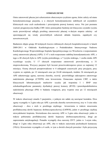 STRESZCZENIE Ostra zatorowość płucna jest schorzeniem obarczonym ryzykiem zgonu, które zależy od stanu hemodynamicznego pacjenta, a u chorych hemodynamicznie stabilnych od czynników klinicznych oraz cech uszkodzenia i przeciążenia prawej komory serca. Nie jest poznana wartość prognostyczna białka CRP, które potencjalnie bardziej niż klasyczne czynniki ryzyka może przewidywać odległy przebieg zatorowości płucnej w dużym stopniu zależny od ujawniających się wtedy przewlekłych schorzeń układu krążenia, zapalnych czy nowotworowych. Badaniem objęto grupę 48 kolejnych losowo dobranych chorych hospitalizowanych w latach 2009-2011 w Oddziale Kardiologicznym z Pododdziałem Intensywnego Nadzoru Kardiologicznego Wojewódzkiego Szpitala Specjalistycznego we Wrocławiu z rozpoznaniem ostrej zatorowości płucnej (APE). U 47 z nich rozpoznano stabilną hemodynamicznie APE, z tego u 40 chorych była to APE ryzyka pośredniego, u 7 ryzyka niskiego, 1 osoba miała APE wysokiego ryzyka. U 17 chorych rozpoznano zatorowość prowokowaną, u 31 nieprowokowaną. Wszyscy pacjenci byli leczeni przeciwzakrzepowo przez co najmniej 12 miesięcy. Ocenę chorych przeprowadzono w 4 odstępach czasowych: przy przyjęciu, przy wypisie ze szpitala, po 12 miesiącach oraz po 24-48 miesiącach, średnio 36 miesiącach po APE odnotowując zgony, nawroty choroby, rozwój przewlekłego zakrzepowo zatorowego nadciśnienia płucnego (CTEPH) oraz krwawienia. Oznaczano stężenie CRP, a także klasycznych laboratoryjnych markerów ryzyka jak troponina I i BNP oraz echokardiograficzne parametry dysfunkcji prawej komory (RVD) i prawdopodobieństwa nadciśnienia płucnego (PH) w badaniu wstępnym, przy wypisie oraz po 12 miesiącach obserwacji. W trakcie obserwacji zmarło 5 pacjentów, z jednym nie udało się nawiązać kontaktu. Dwa zgony wystąpiły w 2-gim roku po APE z powodu choroby nowotworowej, trzy w 3-cim roku obserwacji – dwa z nich w przebiegu ciężkiego krwawienia w trakcie stosowania profilaktycznej dawki heparyny drobnocząsteczkowej (LMWH), jeden w przebiegu ciężkiej niewydolności krążenia. Stwierdzono dwa nawroty APE w 2-gim roku obserwacji: jeden w trakcie pobierania profilaktycznej dawki heparyny drobnocząsteczkowej, drugi po zaprzestaniu antykoagulacji. Ponadto wystąpiły dwa nawroty DVT: jeden w 1-szym roku, drugi w 2-gim roku obserwacji po APE, oba w trakcie zażywania pochodnych kumaryny (VKA). Krwawienie wystąpiło u 6 osób, w tym u dwóch chorych poważne i było przyczyną ich zgonu. Po 12 miesiącach obserwacji prawdopodobieństwo przewlekłego zakrzepowozatorowego nadciśnienia płucnego (CTEPH) na podstawie badania echokardiograficznego stwierdzono u 2 pacjentów. W czasie obserwacji wykazano istotne obniżanie się poziomu CRP, które ostatecznie uległo normalizacji u większości chorych. Oceniając wartość prognostyczną CRP oraz porównywanych parametrów laboratoryjnych i echokardiograficznych nie stwierdzono, aby któryś z tych parametrów w badaniu wstępnym lub w czasie wypisu ze szpitala mógł prognozować wystąpienie zgonu, nawrotu zatorowości płucnej czy wystąpienia CTEPH. Prawdopodobnie znaczenie CRP w ocenie rokowania długoterminowego mogłaby ustalić dłuższa obserwacja większej grupy pacjentów. Stosunkowo dobre rokowanie w badanej grupie chorych mogło mieć związek z losowym doborem kolejnych pacjentów z APE oraz z przedłużeniem ponadstandardowo leczenia przeciwzakrzepowego u wszystkich pacjentów do co najmniej 12 miesięcy.