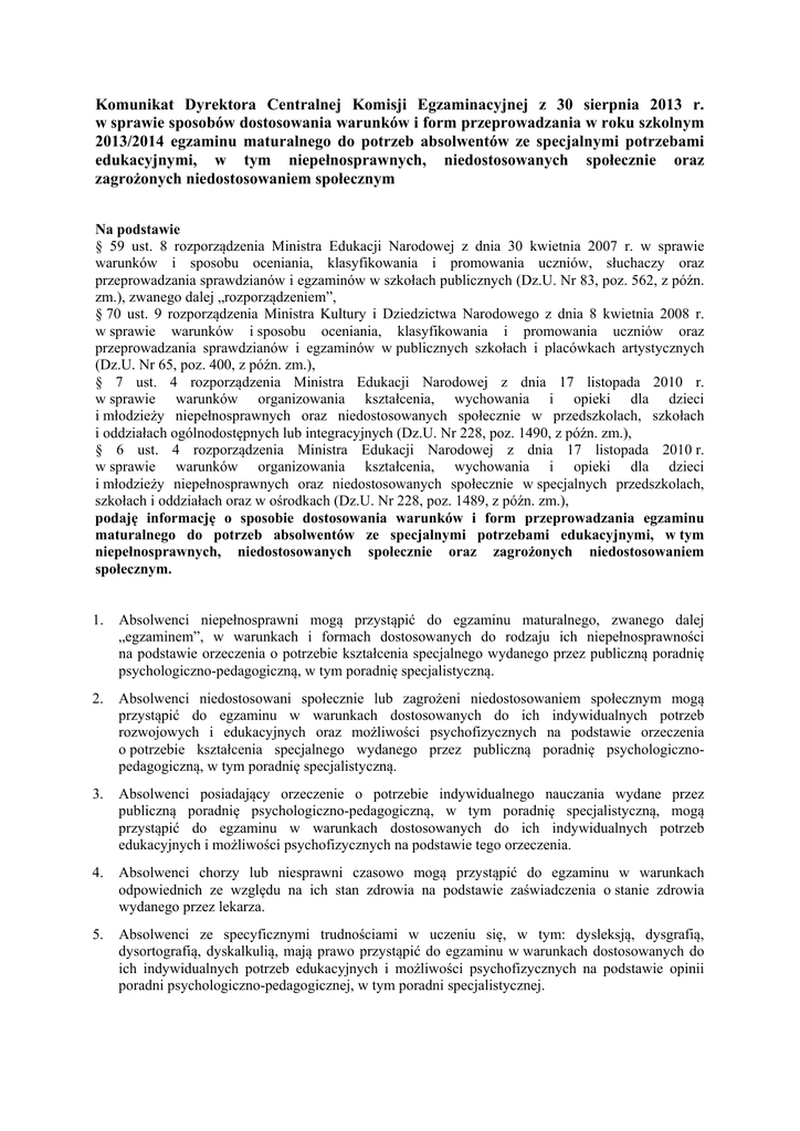 Komunikat Dyrektora Centralnej Komisji Egzaminacyjnej z 30 sierpnia 2013 r. w sprawie sposobów dostosowania warunków i form przeprowadzania w roku szkolnym 2013/2014 egzaminu maturalnego do potrzeb absolwentów ze specjalnymi potrzebami edukacyjnymi, w tym niepełnosprawnych, niedostosowanych społecznie oraz zagrożonych niedostosowaniem społecznym Na podstawie § 59 ust. 8 rozporządzenia Ministra Edukacji Narodowej z dnia 30 kwietnia 2007 r. w sprawie warunków i sposobu oceniania, klasyfikowania i promowania uczniów, słuchaczy oraz przeprowadzania sprawdzianów i egzaminów w szkołach publicznych (Dz.U. Nr 83, poz. 562, z późn. zm.), zwanego dalej „rozporządzeniem”, § 70 ust. 9 rozporządzenia Ministra Kultury i Dziedzictwa Narodowego z dnia 8 kwietnia 2008 r. w sprawie warunków i sposobu oceniania, klasyfikowania i promowania uczniów oraz przeprowadzania sprawdzianów i egzaminów w publicznych szkołach i placówkach artystycznych (Dz.U. Nr 65, poz. 400, z późn. zm.), § 7 ust. 4 rozporządzenia Ministra Edukacji Narodowej z dnia 17 listopada 2010 r. w sprawie warunków organizowania kształcenia, wychowania i opieki dla dzieci i młodzieży niepełnosprawnych oraz niedostosowanych społecznie w przedszkolach, szkołach i oddziałach ogólnodostępnych lub integracyjnych (Dz.U. Nr 228, poz. 1490, z późn. zm.), § 6 ust. 4 rozporządzenia Ministra Edukacji Narodowej z dnia 17 listopada 2010 r. w sprawie warunków organizowania kształcenia, wychowania i opieki dla dzieci i młodzieży niepełnosprawnych oraz niedostosowanych społecznie w specjalnych przedszkolach, szkołach i oddziałach oraz w ośrodkach (Dz.U. Nr 228, poz. 1489, z późn. zm.), podaję informację o sposobie dostosowania warunków i form przeprowadzania egzaminu maturalnego do potrzeb absolwentów ze specjalnymi potrzebami edukacyjnymi, w tym niepełnosprawnych, niedostosowanych społecznie oraz zagrożonych niedostosowaniem społecznym. 1. Absolwenci niepełnosprawni mogą przystąpić do egzaminu maturalnego, zwanego dalej „egzaminem”, w warunkach i formach dostosowanych do rodzaju ich niepełnosprawności na podstawie orzeczenia o potrzebie kształcenia specjalnego wydanego przez publiczną poradnię psychologiczno-pedagogiczną, w tym poradnię specjalistyczną. 2. Absolwenci niedostosowani społecznie lub zagrożeni niedostosowaniem społecznym mogą przystąpić do egzaminu w warunkach dostosowanych do ich indywidualnych potrzeb rozwojowych i edukacyjnych oraz możliwości psychofizycznych na podstawie orzeczenia o potrzebie kształcenia specjalnego wydanego przez publiczną poradnię psychologicznopedagogiczną, w tym poradnię specjalistyczną. 3. Absolwenci posiadający orzeczenie o potrzebie indywidualnego nauczania wydane przez publiczną poradnię psychologiczno-pedagogiczną, w tym poradnię specjalistyczną, mogą przystąpić do egzaminu w warunkach dostosowanych do ich indywidualnych potrzeb edukacyjnych i możliwości psychofizycznych na podstawie tego orzeczenia. 4. Absolwenci chorzy lub niesprawni czasowo mogą przystąpić do egzaminu w warunkach odpowiednich ze względu na ich stan zdrowia na podstawie zaświadczenia o stanie zdrowia wydanego przez lekarza. 5. Absolwenci ze specyficznymi trudnościami w uczeniu się, w tym: dysleksją, dysgrafią, dysortografią, dyskalkulią, mają prawo przystąpić do egzaminu w warunkach dostosowanych do ich indywidualnych potrzeb edukacyjnych i możliwości psychofizycznych na podstawie opinii poradni psychologiczno-pedagogicznej, w tym poradni specjalistycznej. 6. Absolwenci, którzy w roku szkolnym 2013/2014 byli objęci pomocą psychologicznopedagogiczną w szkole ze względu na trudności adaptacyjne związane z wcześniejszym kształceniem za granicą, zaburzenia komunikacji językowej lub ze względu na sytuację kryzysową lub traumatyczną, mogą przystąpić do egzaminu w warunkach dostosowanych do ich indywidualnych potrzeb edukacyjnych i możliwości psychofizycznych, na podstawie pozytywnej opinii rady pedagogicznej wydanej zgodnie z trybem określonym w § 59 ust. 4 i 5 rozporządzenia. 7. Za dostosowanie warunków i form przeprowadzania egzaminu odpowiada dyrektor szkoły jako przewodniczący zespołu egzaminacyjnego w danej szkole. 8. Dyrektor szkoły dostosowuje odpowiednio warunki i formy przeprowadzania egzaminu na podstawie wskazań rady pedagogicznej. 9. Rada pedagogiczna wskazuje sposób lub sposoby dostosowania warunków i form przeprowadzania egzaminu do potrzeb i możliwości absolwentów, o których mowa w pkt 1–6, wybierając spośród możliwych sposobów dostosowania warunków i form przeprowadzania egzaminu określonych w Tabeli 1. na podstawie: orzeczenia o potrzebie kształcenia specjalnego orzeczenia o potrzebie indywidualnego nauczania opinii poradni psychologiczno-pedagogicznej, w tym poradni specjalistycznej, o specyficznych trudnościach w uczeniu się 1 zaświadczenia o stanie zdrowia wydanego przez lekarza pozytywnie zaopiniowanego przez radę pedagogiczną wniosku nauczyciela lub specjalisty wykonującego w szkole zadania z zakresu pomocy psychologiczno-pedagogicznej, prowadzących zajęcia z uczniem (słuchaczem) ze względu na trudności adaptacyjne związane z wcześniejszym kształceniem za granicą, zaburzenia komunikacji językowej lub sytuację kryzysową lub traumatyczną – po uzyskaniu zgody rodziców (prawnych opiekunów) albo pełnoletniego ucznia (słuchacza) pozytywnie zaopiniowanego przez radę pedagogiczną wniosku rodziców (prawnych opiekunów) albo pełnoletniego ucznia (słuchacza), który był objęty w szkole pomocą psychologiczno-pedagogiczną ze względu na trudności adaptacyjne związane z wcześniejszym kształceniem za granicą, zaburzenia komunikacji językowej lub sytuację kryzysową lub traumatyczną. 10. W przypadku absolwentów, którzy ukończyli szkołę przed rokiem 2014: posiadających opinię poradni psychologiczno-pedagogicznej, w tym poradni specja